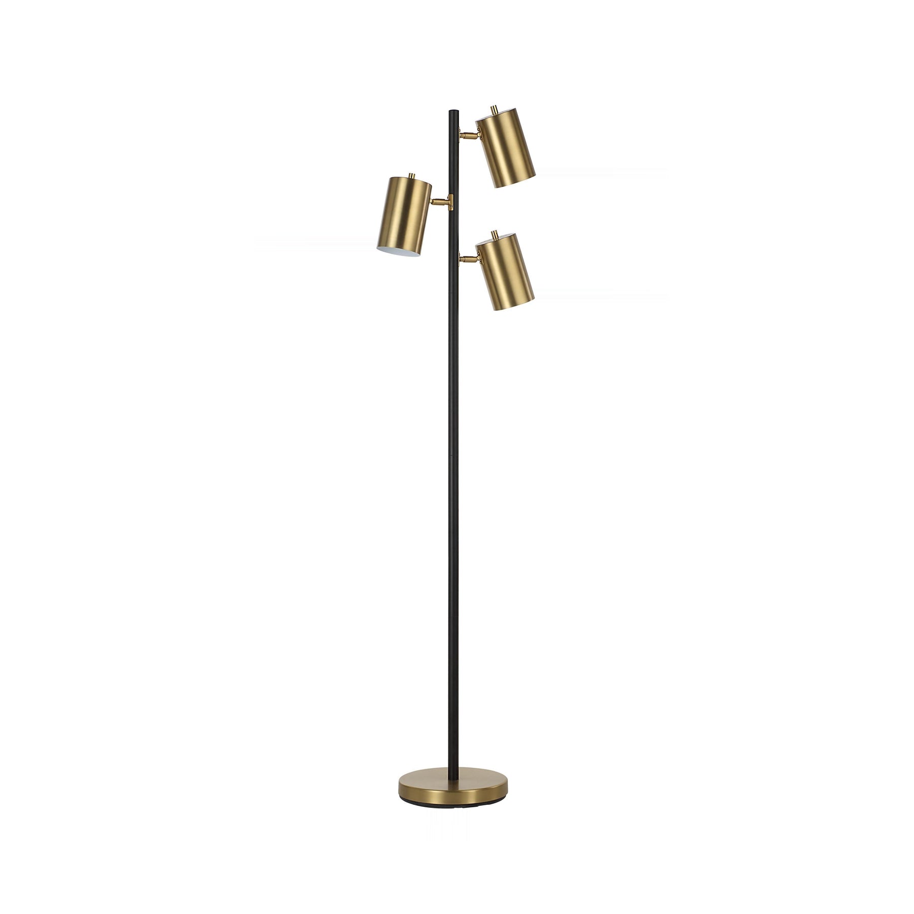 Sculptural iron framework merges mid-century aesthetics with sharp, modern lines, anchored by a substantial base for unwavering stability. The striking contrast between the deep matte column and the warm, brushed brass spotlight heads defines its sophisticated presence.