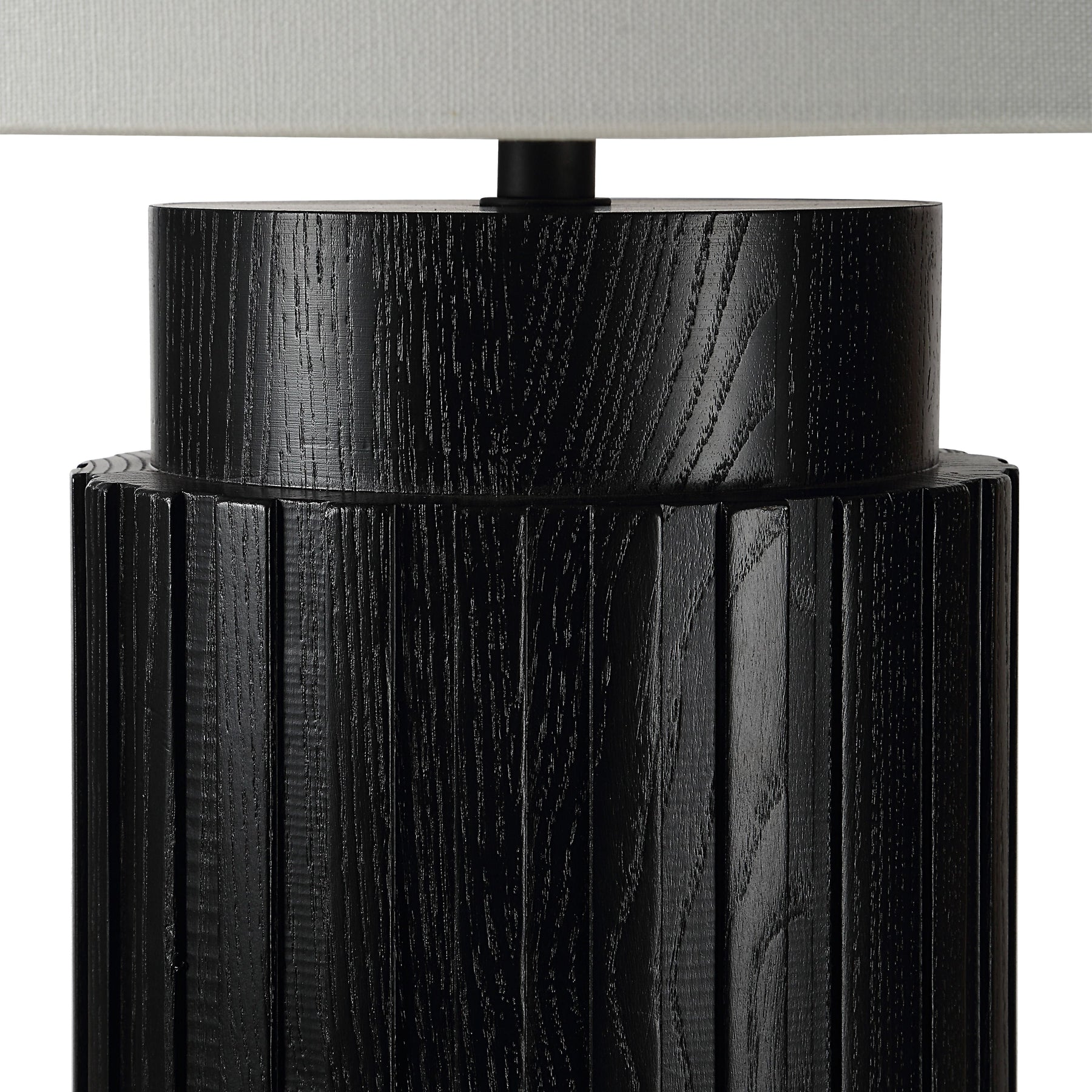 Ash wood structure showcases dramatic vertical ribbing, finished in a deep matte black stain for striking contrast. This minimalist silhouette anchors modern interiors with sculptural presence and rich, tactile texture.