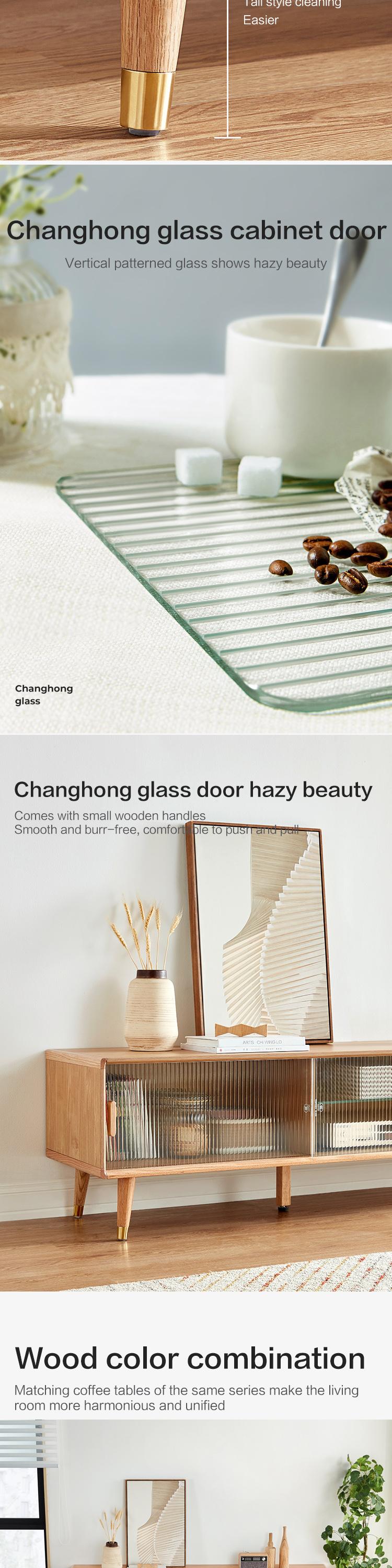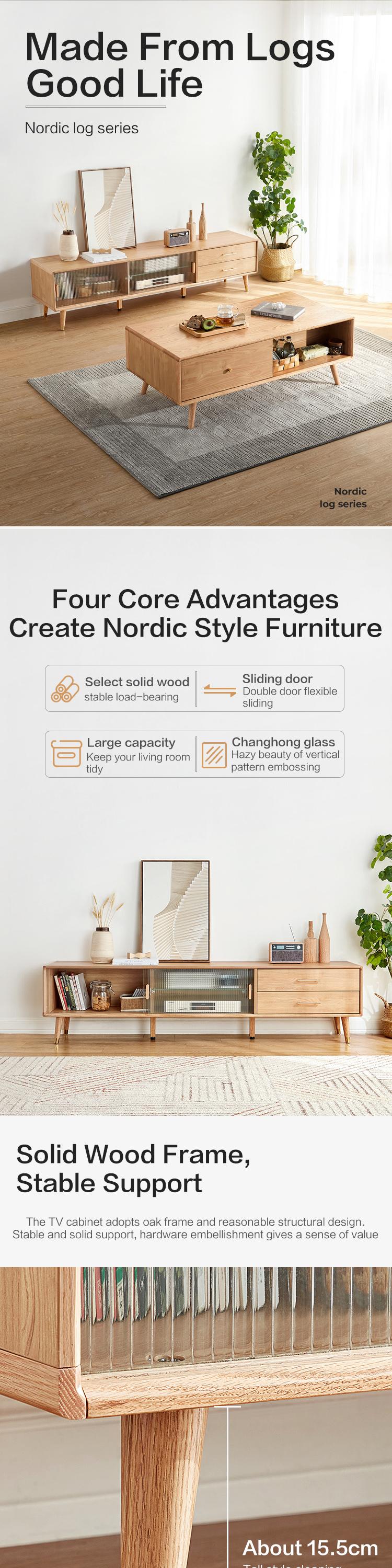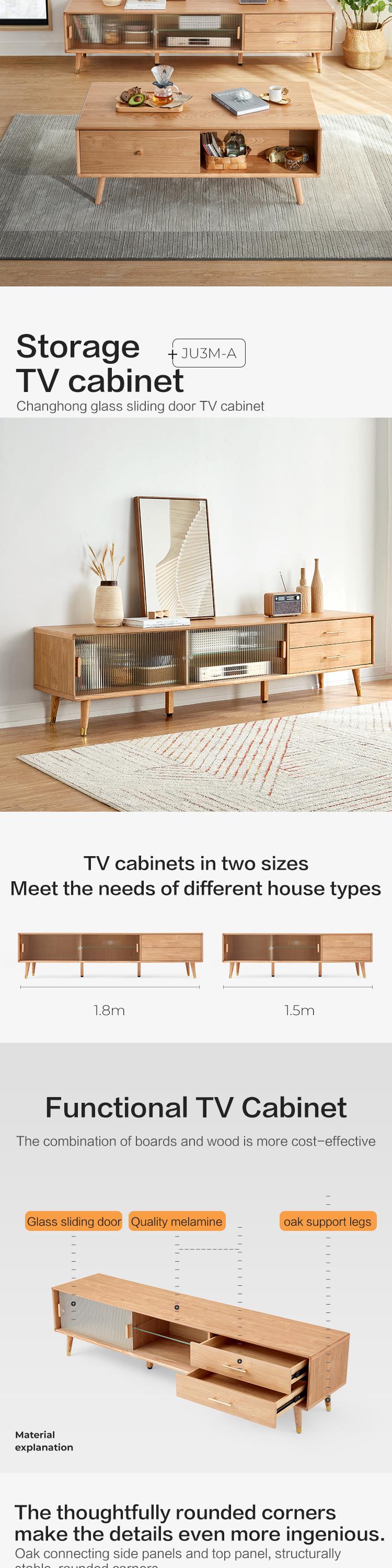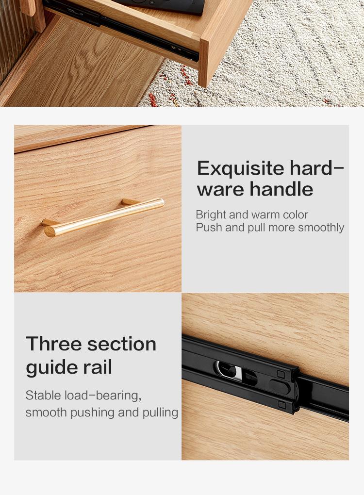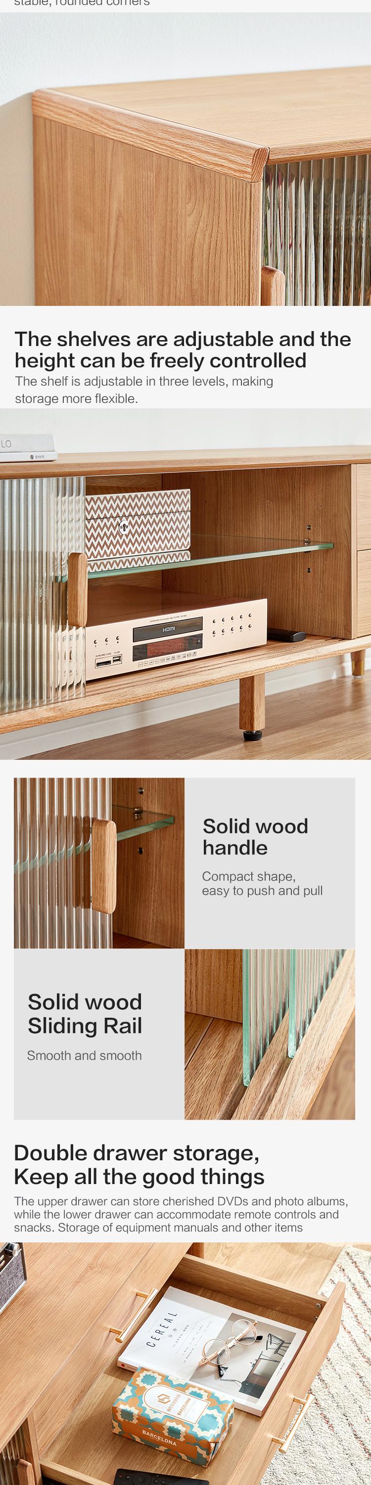 Discover the blend of functionality and aesthetics with this elegant TV stand, meticulously crafted from high-quality red oak wood. It features a durable melamine board structure and a stylish tempered glass shelf, offering ample storage space with two smooth-gliding drawers. The sliding fluted glass door panels provide flexible usage, while the solid red oak legs and stainless steel capped feet ensure stability and durability.