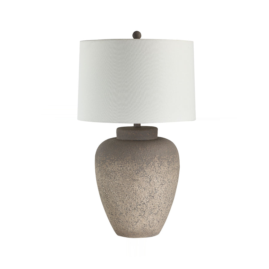 Handcrafted ceramic body anchors this piece with a deeply textured, earthy beige finish, evoking artisanal warmth. Brass-plated iron fittings introduce subtle, refined metallic accents bridging the base to the crisp shade.