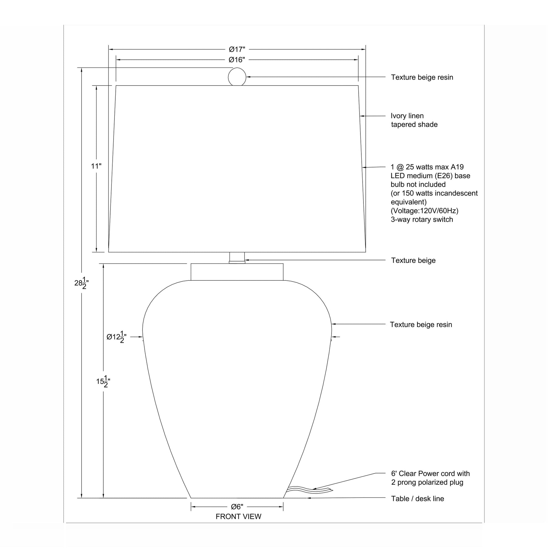 An ivory linen tapered drum shade ensures a soft, diffused glow perfect for layering ambience in living areas or bedrooms. Integrated 3-way switching allows effortless modulation of light intensity to suit any moment.