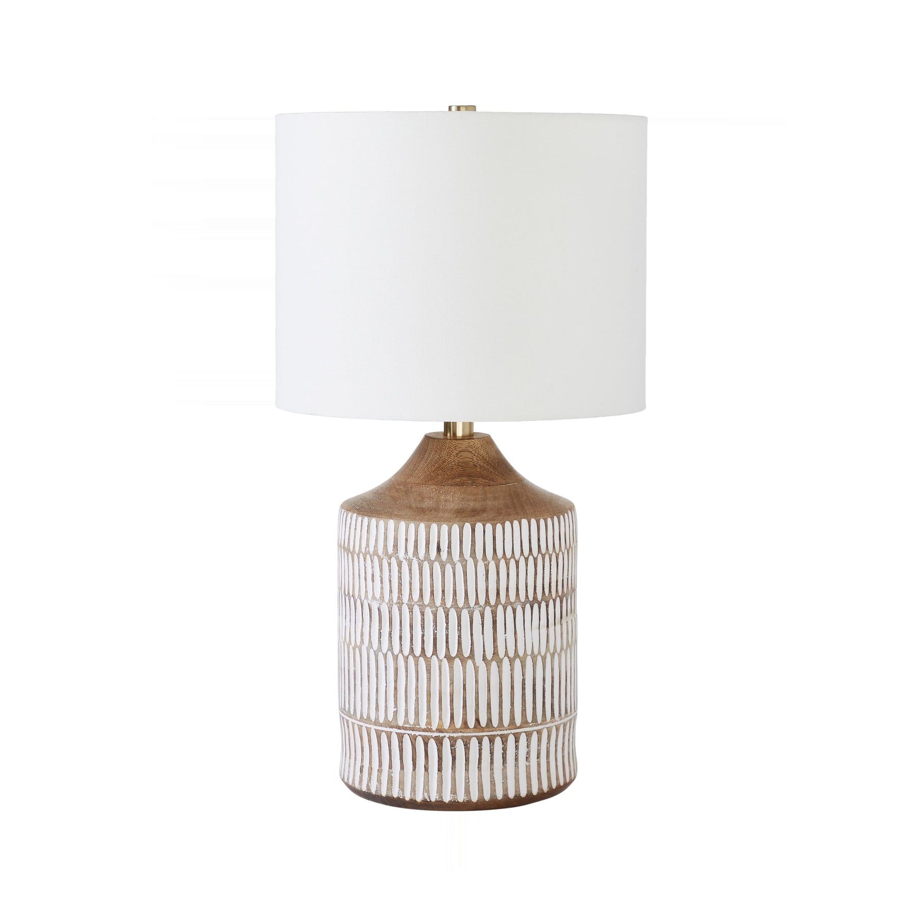 Carved mango wood features tribal-inspired patterning, beautifully contrasted with a washed white finish for rich, textural depth. This substantial base supports a crisp cotton drum shade, diffusing light warmly throughout your intimate spaces.