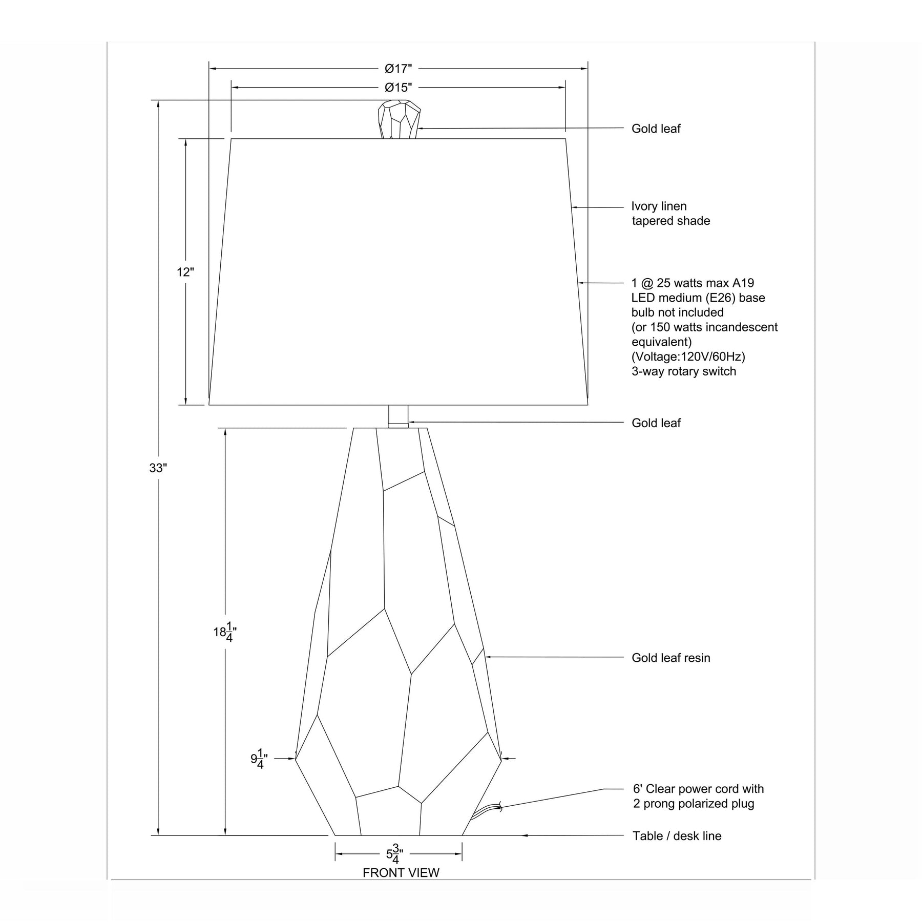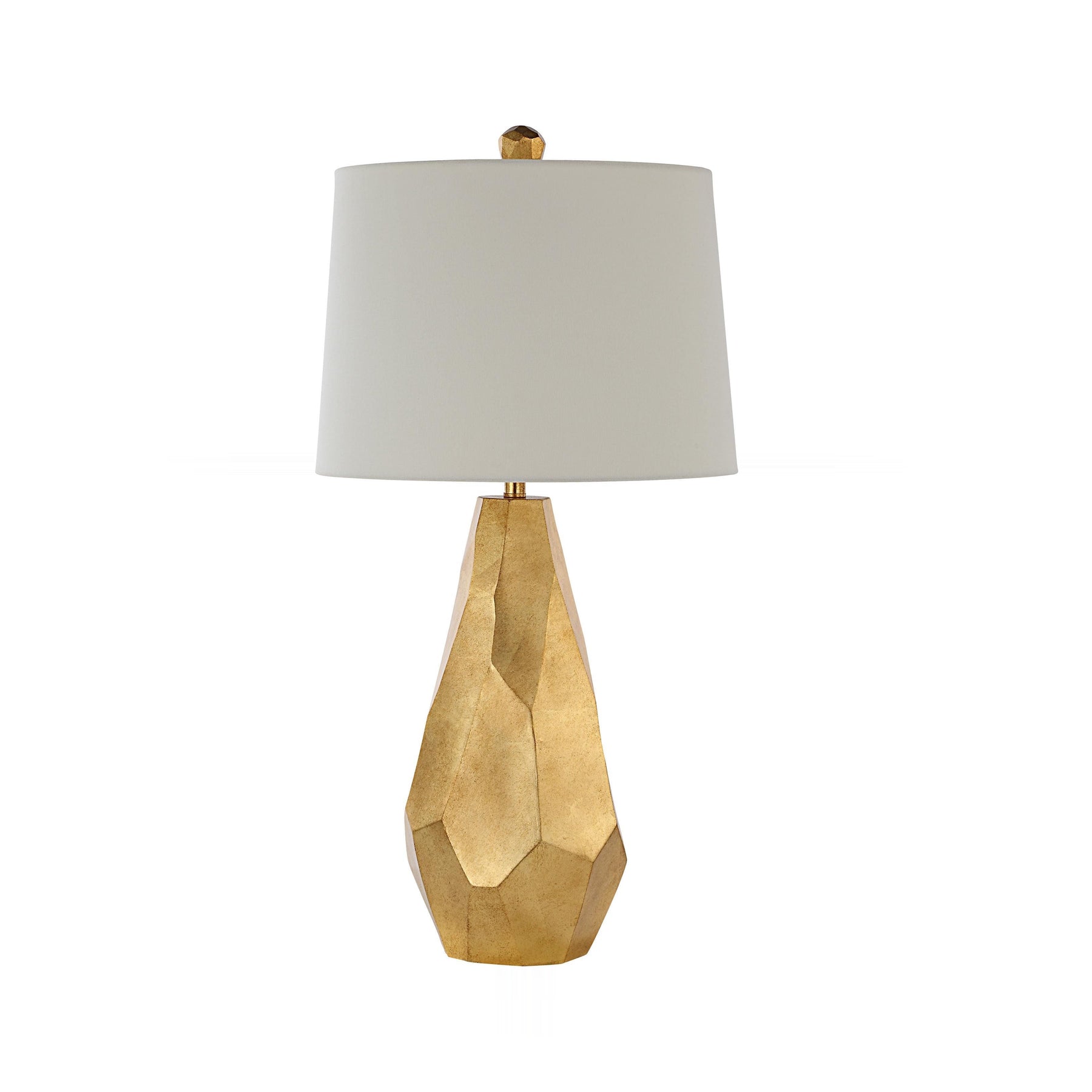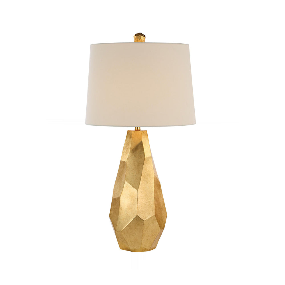 Sculptural, multifaceted gold-leaf base captures light with a striking, gemstone-like silhouette that immediately elevates any surface it graces. This commanding form is softened by an ivory linen tapered drum shade, casting a warm, diffused ambient glow ideal for sophisticated living areas.