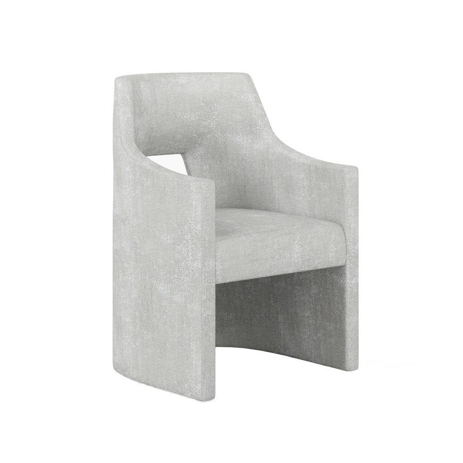 Make a bold statement in your dining room with this striking host chair, featuring a new traditional and transitional style in a sophisticated dove gray finish. The fully upholstered barrel-style frame in finely tailored pewter chenille blends contemporary chic with soft transitional appeal, creating a unique and stylish look.