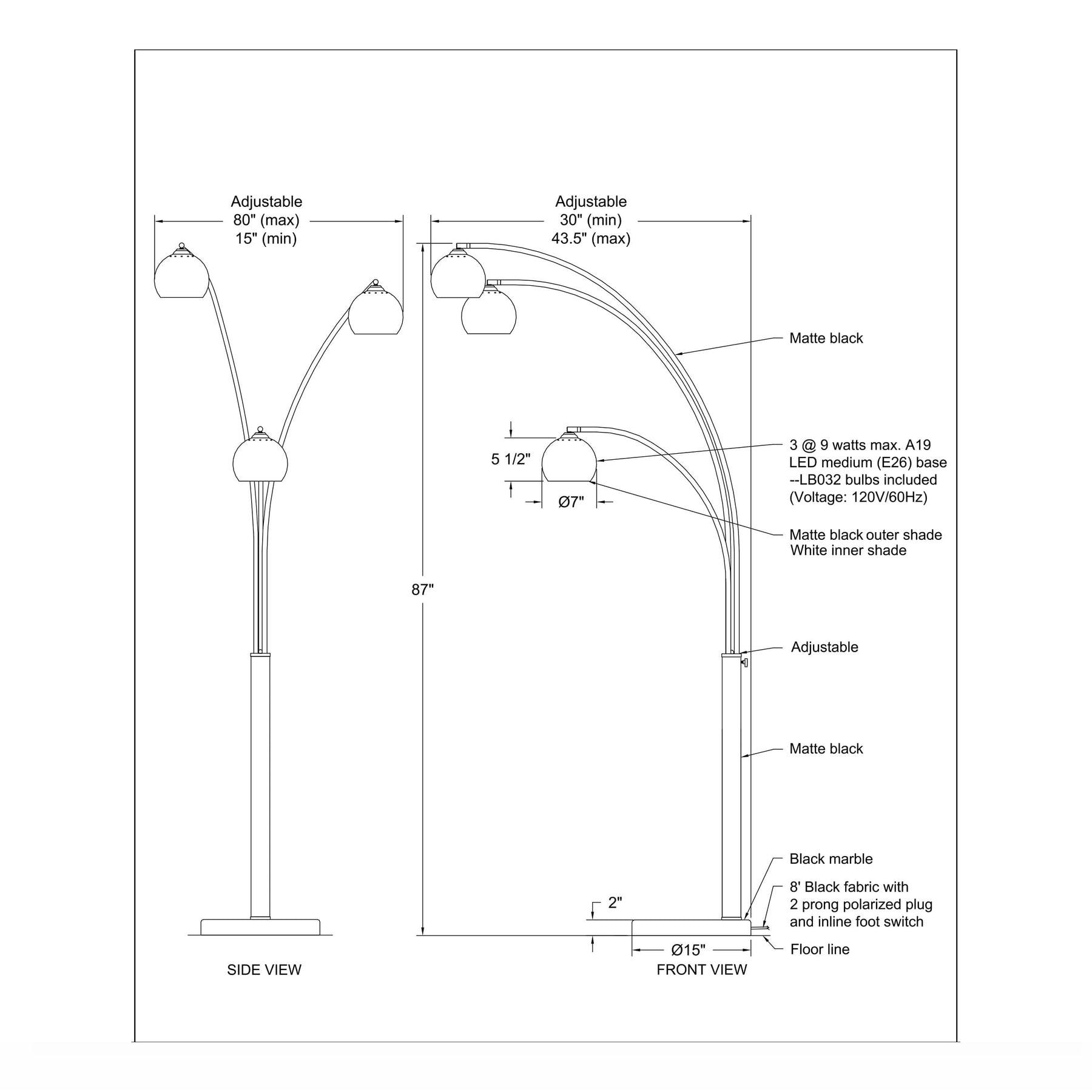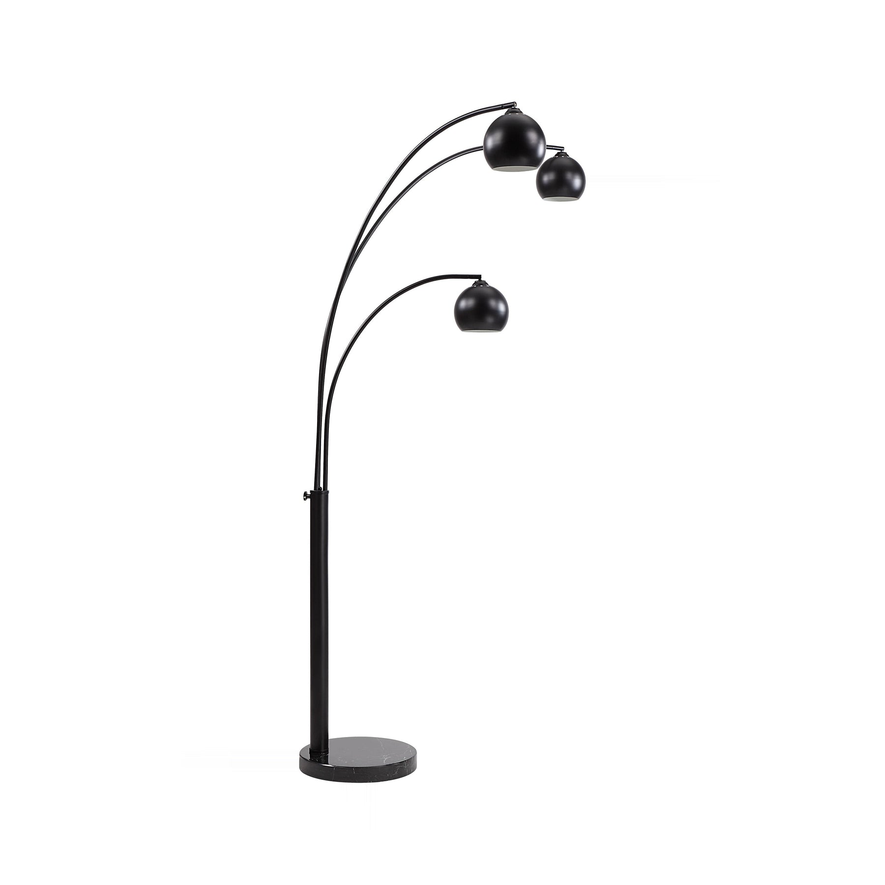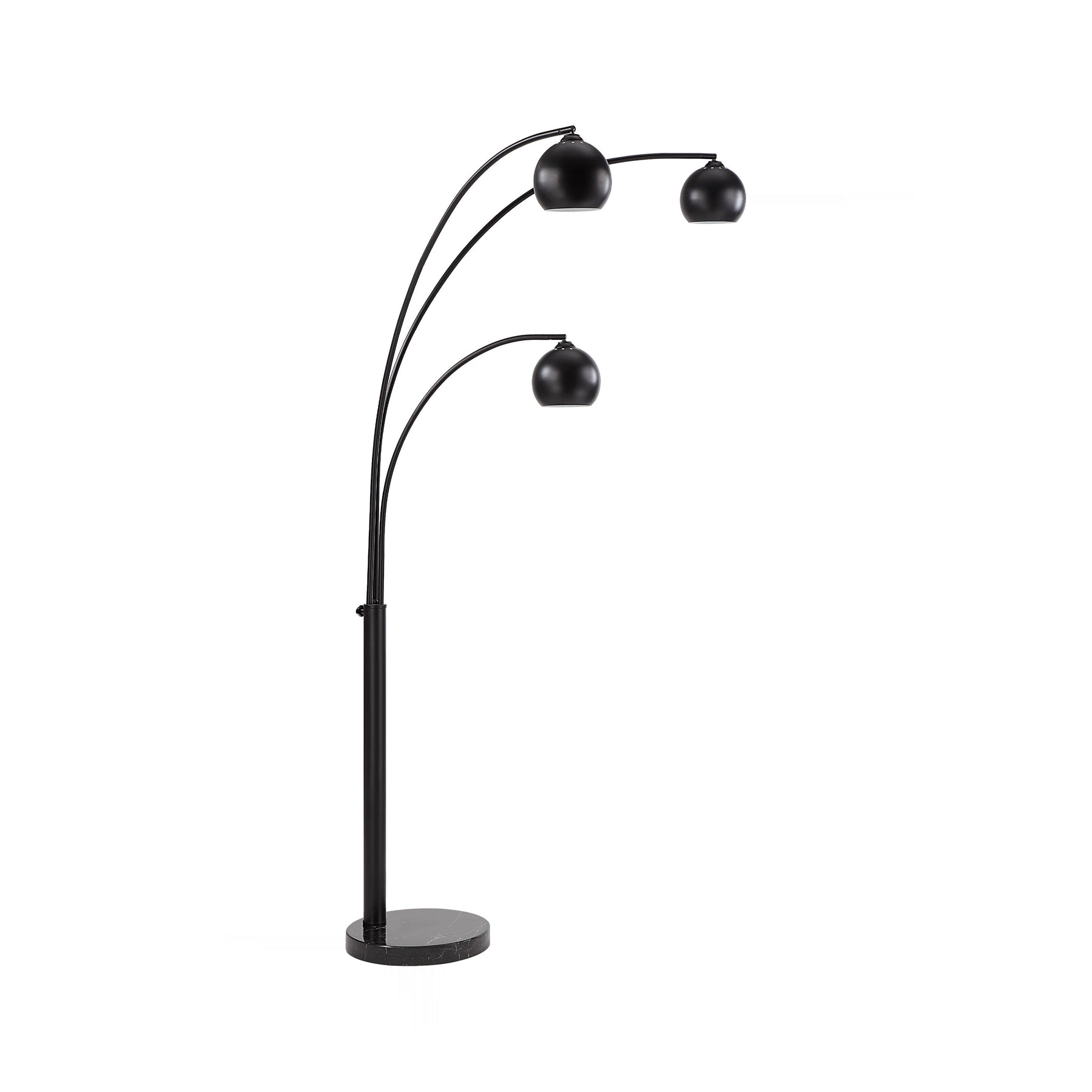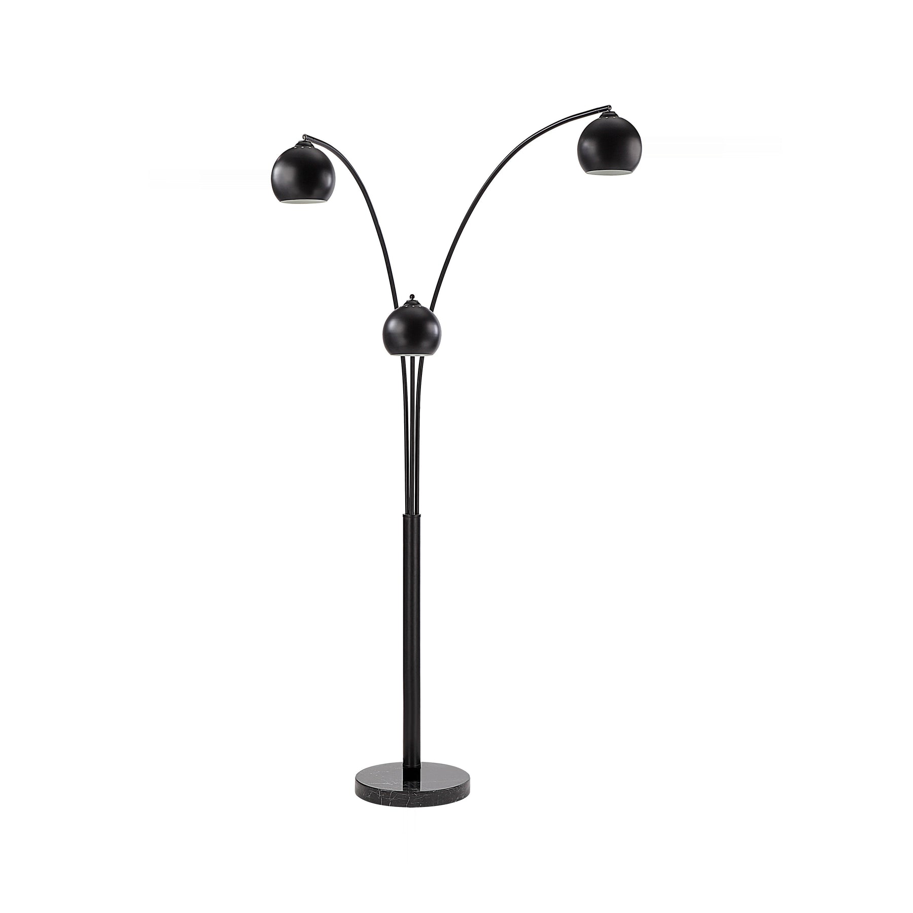 Sculptural arcs of matte black iron ascend from a weighty base, culminating in three suspended globe shades for dramatic, focused illumination. The imposing 87-inch height commands attention while establishing a contemporary, gallery-like atmosphere in any setting.