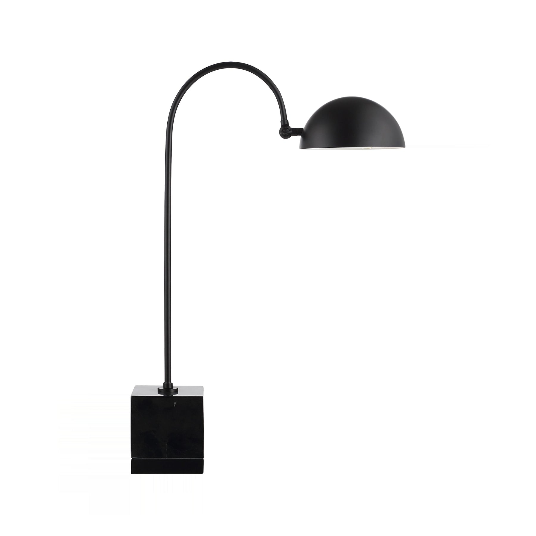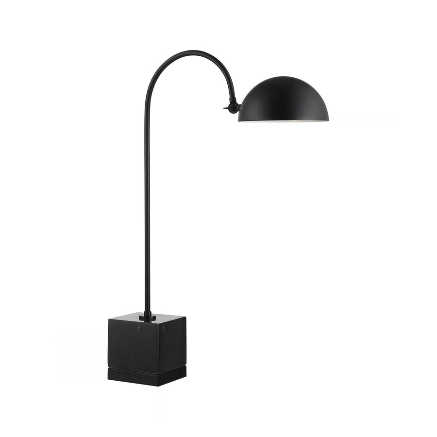 Honed black marble anchors this striking silhouette, contrasting with the sleek, powder-coated metal arm and dome shade for dramatic visual weight. The updated form blends classic, rich materiality with stark, modern minimalism.