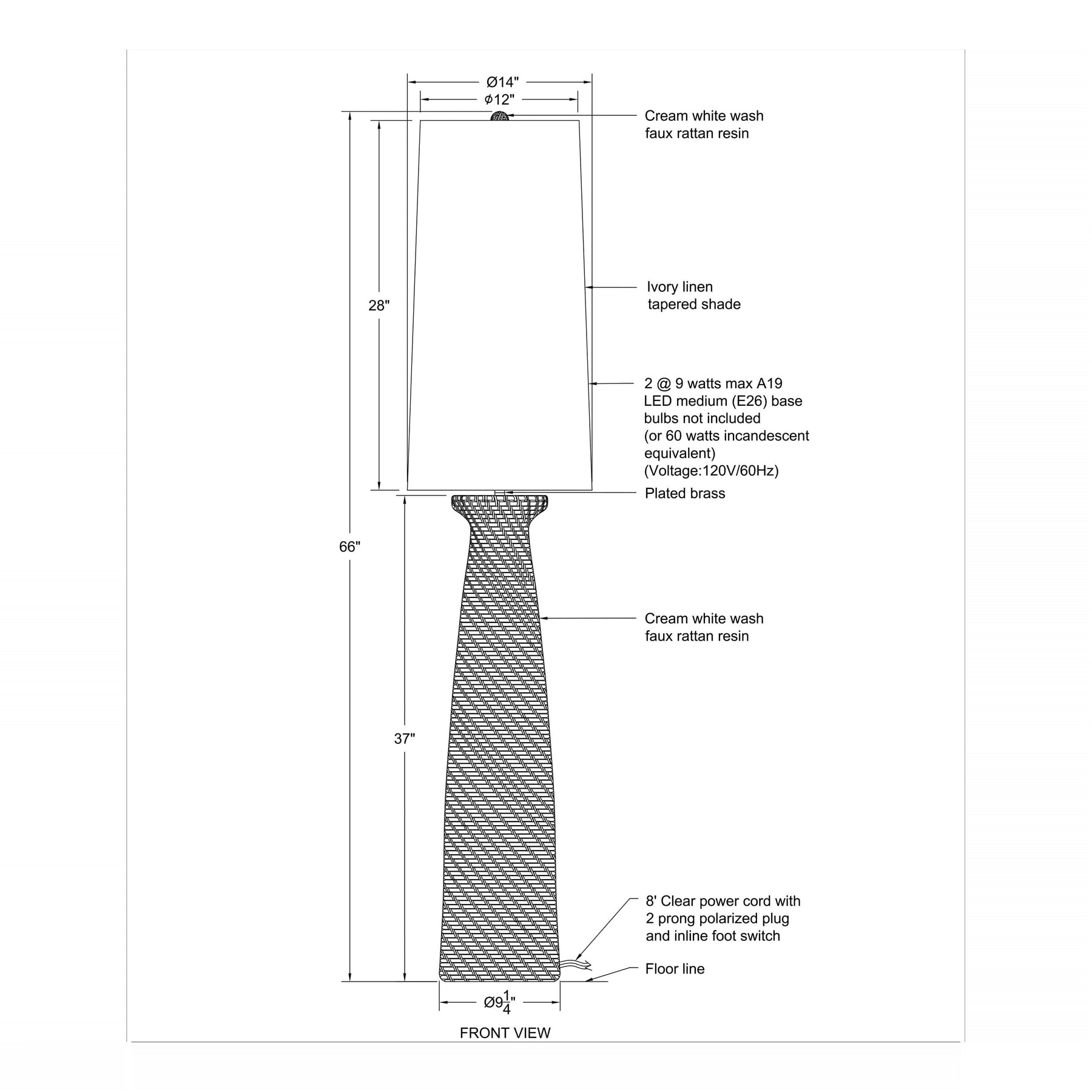 Woven faux rattan grounds this floor lamp, featuring a substantial, textured base sculpted into a gentle, tapering silhouette. The elongated form culminates in a crisp ivory linen shade that disperses a warm, inviting glow throughout the space.