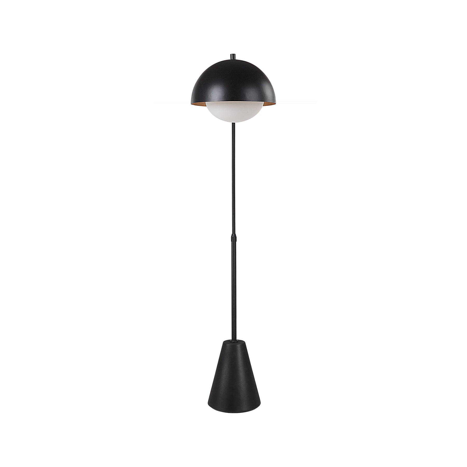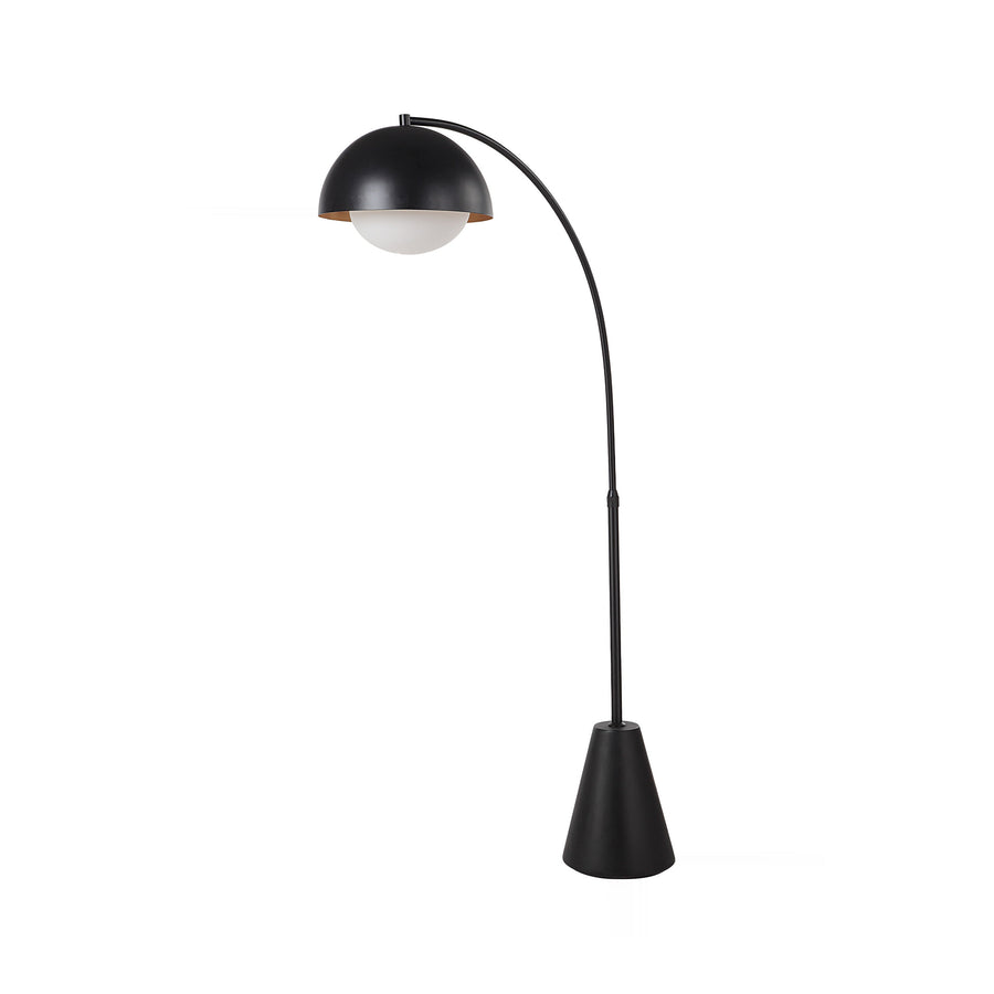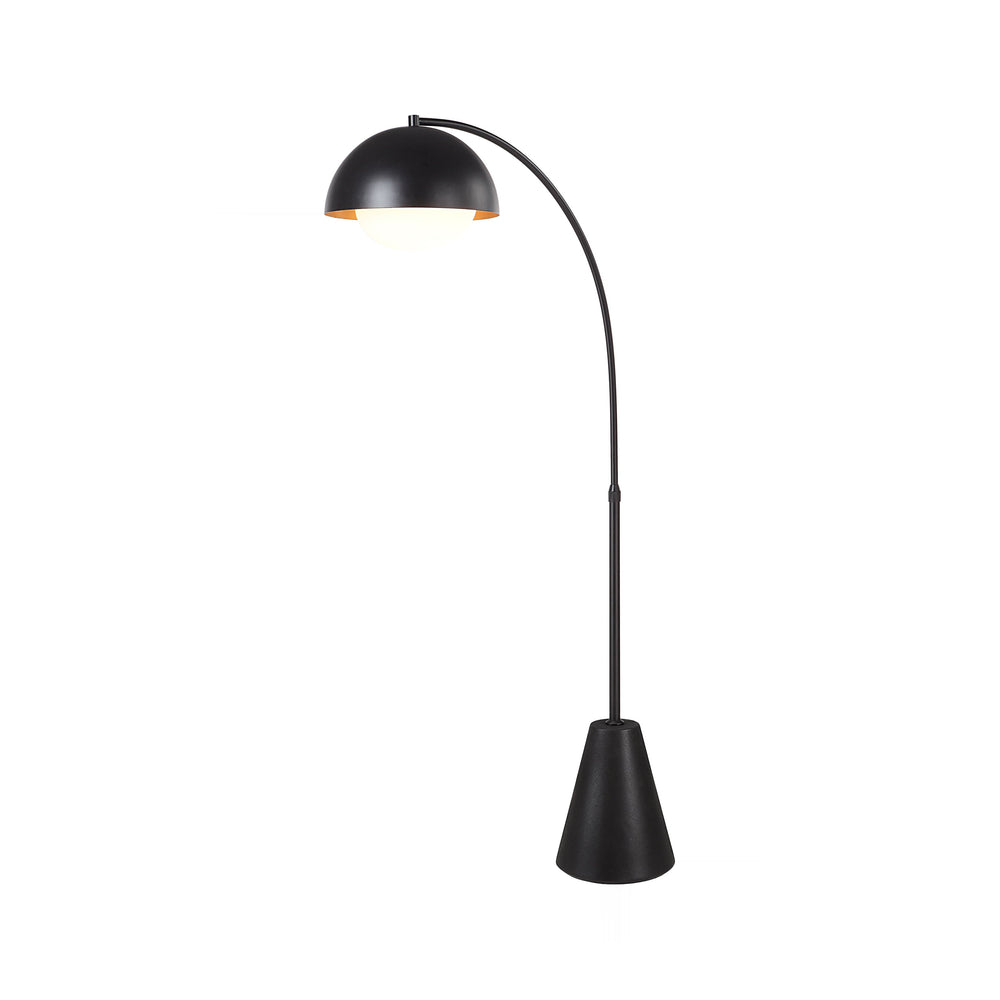 Sleek, arcing silhouette defines this modern fixture, anchored by a substantial, matte black conical base for unwavering stability. The dome shade features a striking contrast between its exterior finish and a warm, interior metallic sheen, focusing illumination precisely where desired.