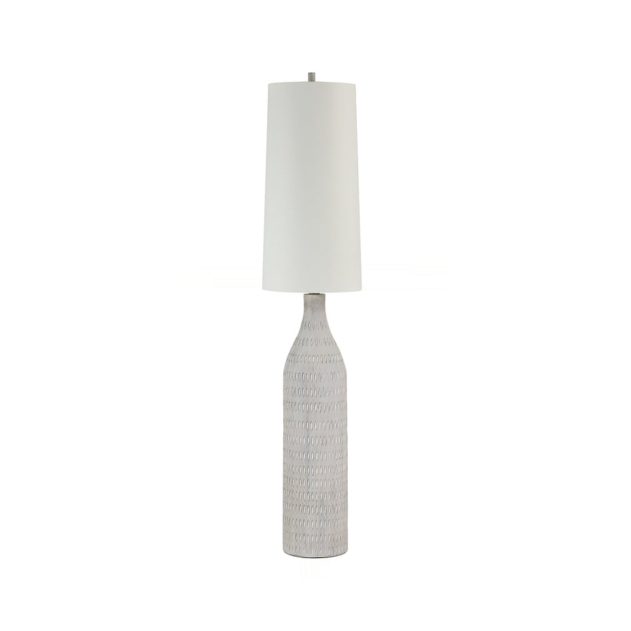 Elongated form showcasing a deeply tactile, relief-carved ceramic body finished in a muted cream tone, capturing light with subtle texture. This floor sculpture anchors spaces with vertical presence, crowned by a crisp oatmeal linen drum shade for refined illumination.