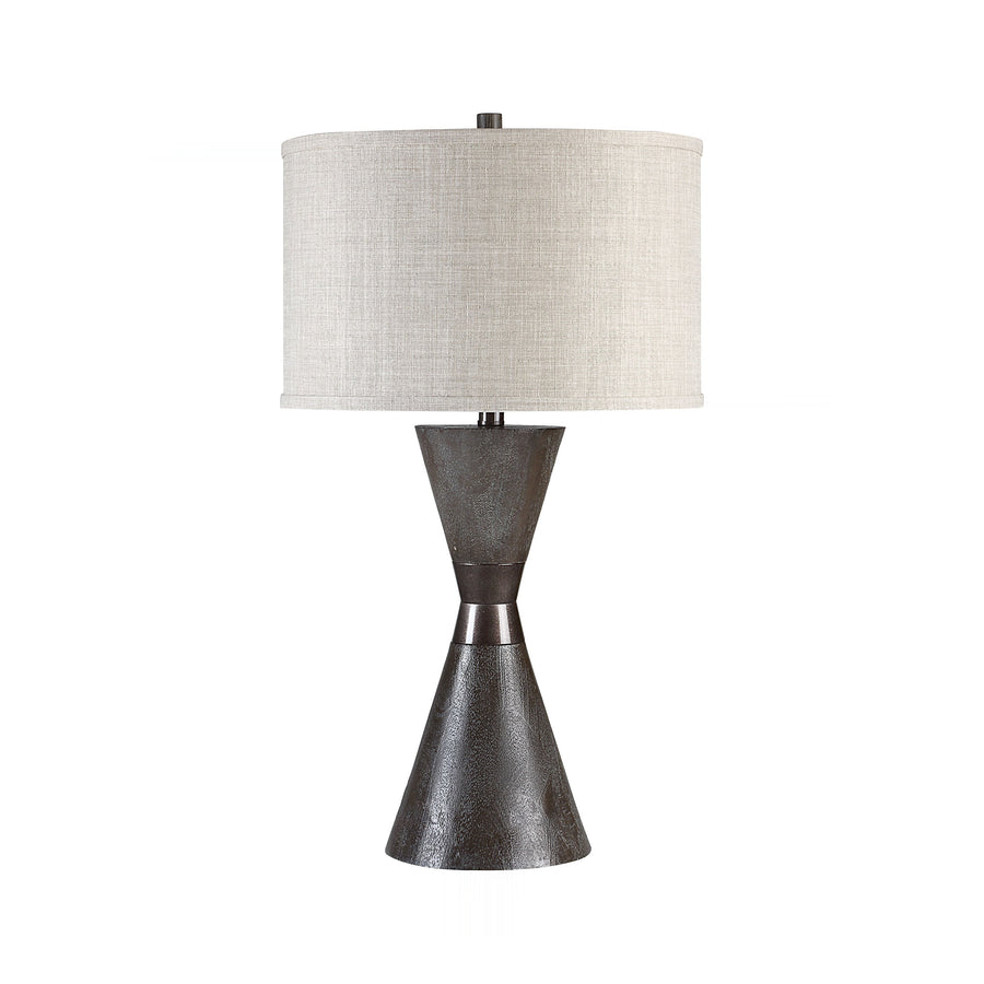 A natural linen drum shade diffuses illumination into a soft, inviting ambient glow, perfect for layered lighting schemes. It introduces vital textural contrast to the lamp's commanding metallic structure.