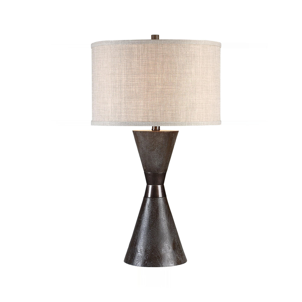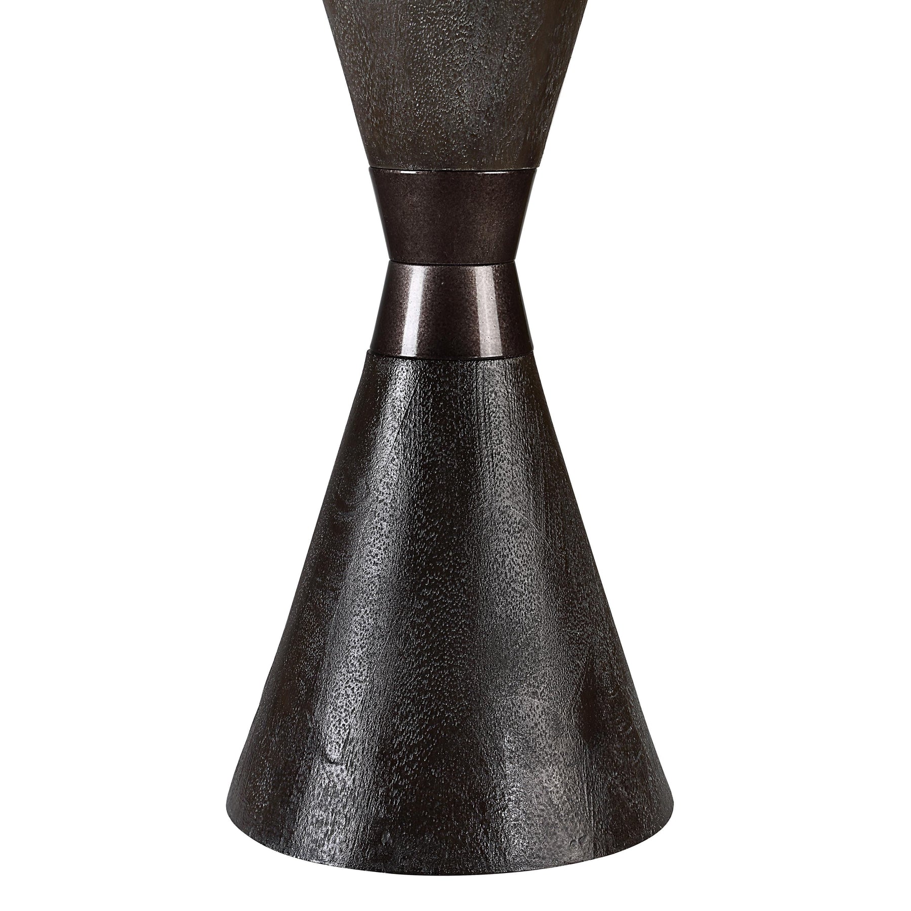 The sculpted base echoes an angular hourglass silhouette, rendered in a richly textured, dark bronze finish that catches the light. This commanding form anchors contemporary spaces with sophisticated, architectural intrigue.