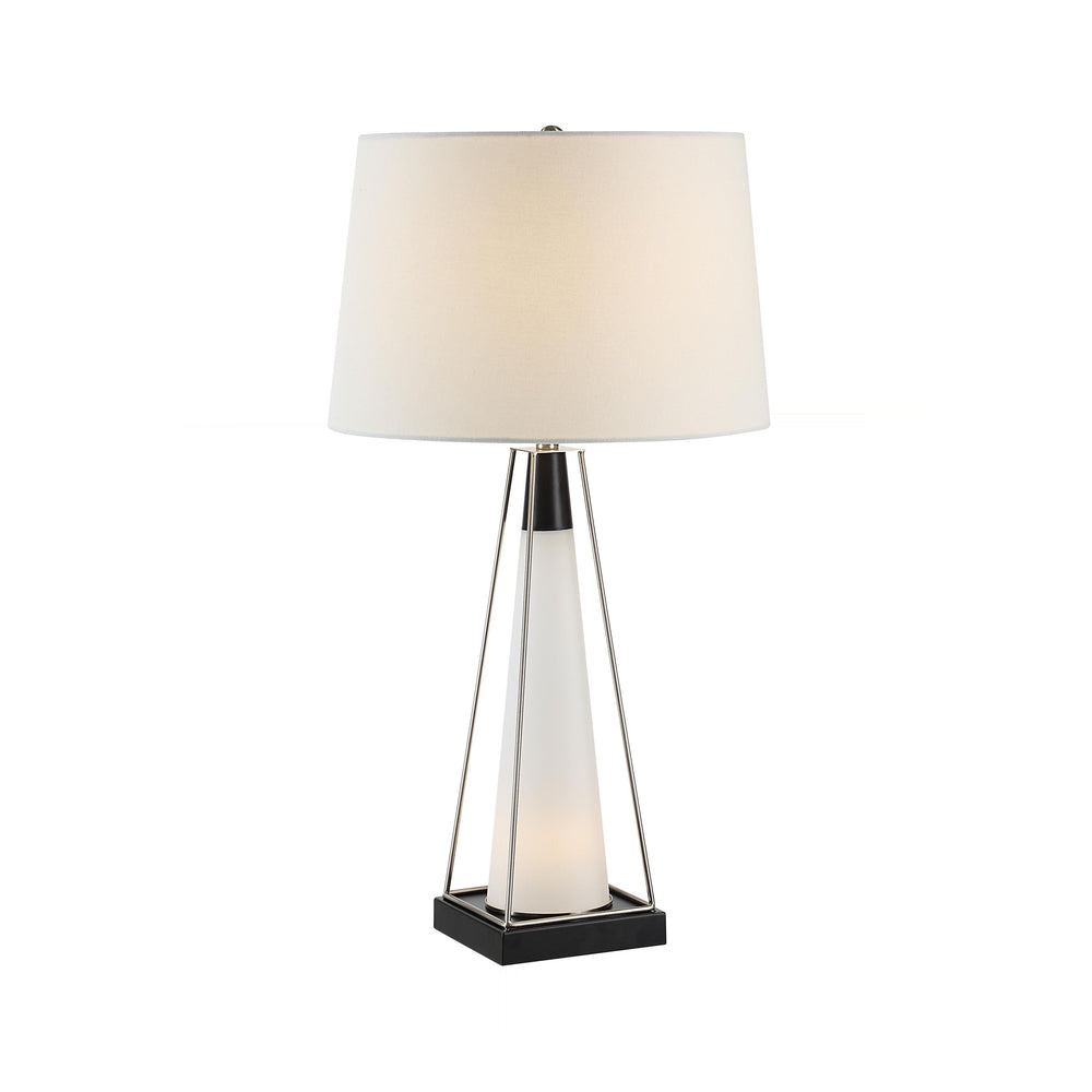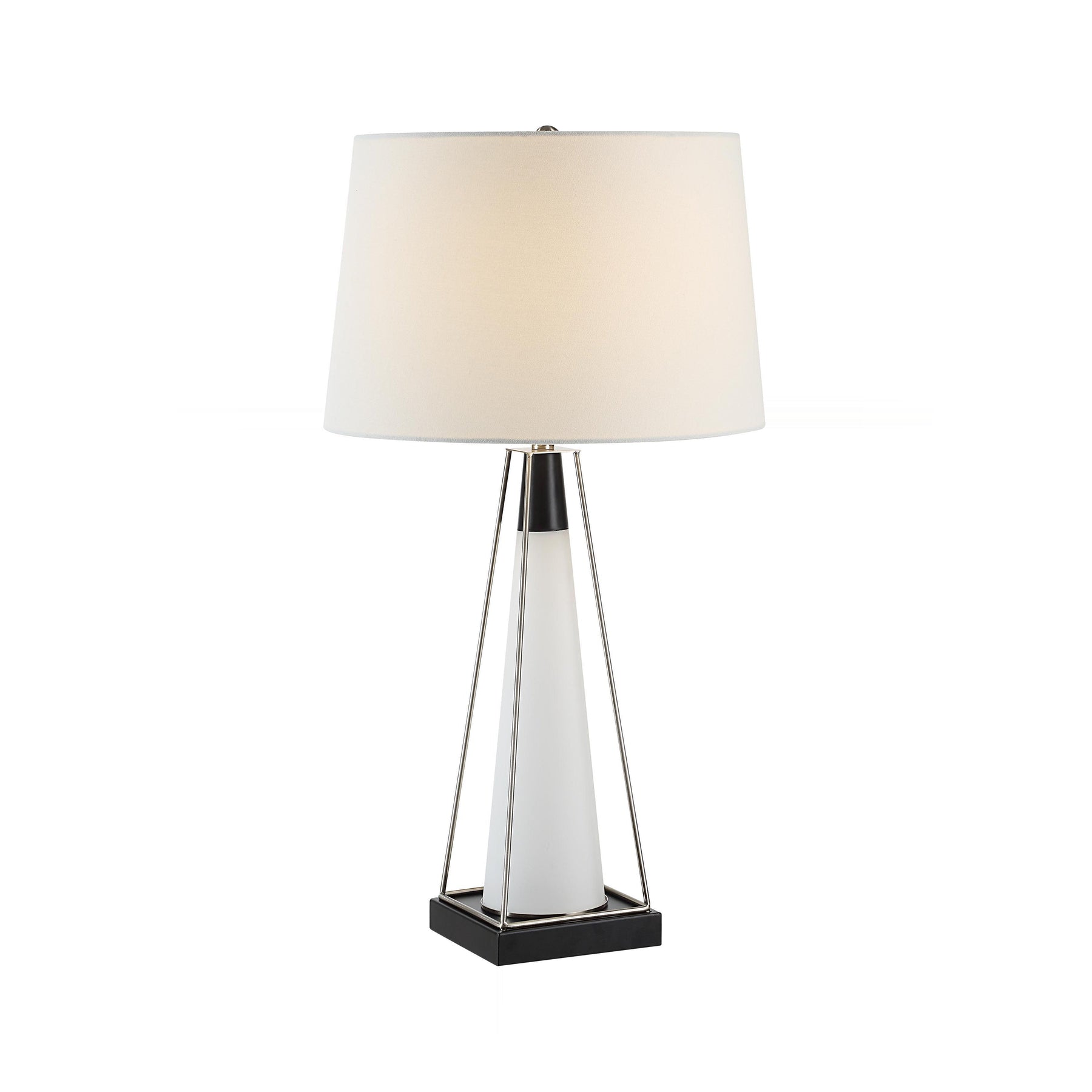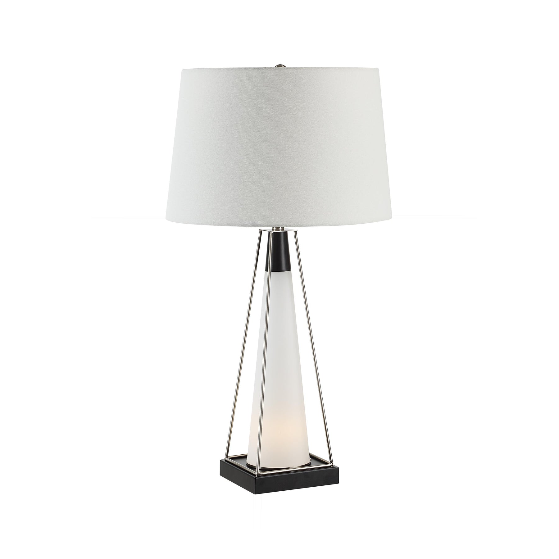 Sculptural lines define this modern accent lamp, balancing a crisp ivory linen drum shade against a geometric frame of brushed nickel and matte black. The central frosted glass column offers a soft, diffused core, creating sophisticated visual tension and contemporary elegance.