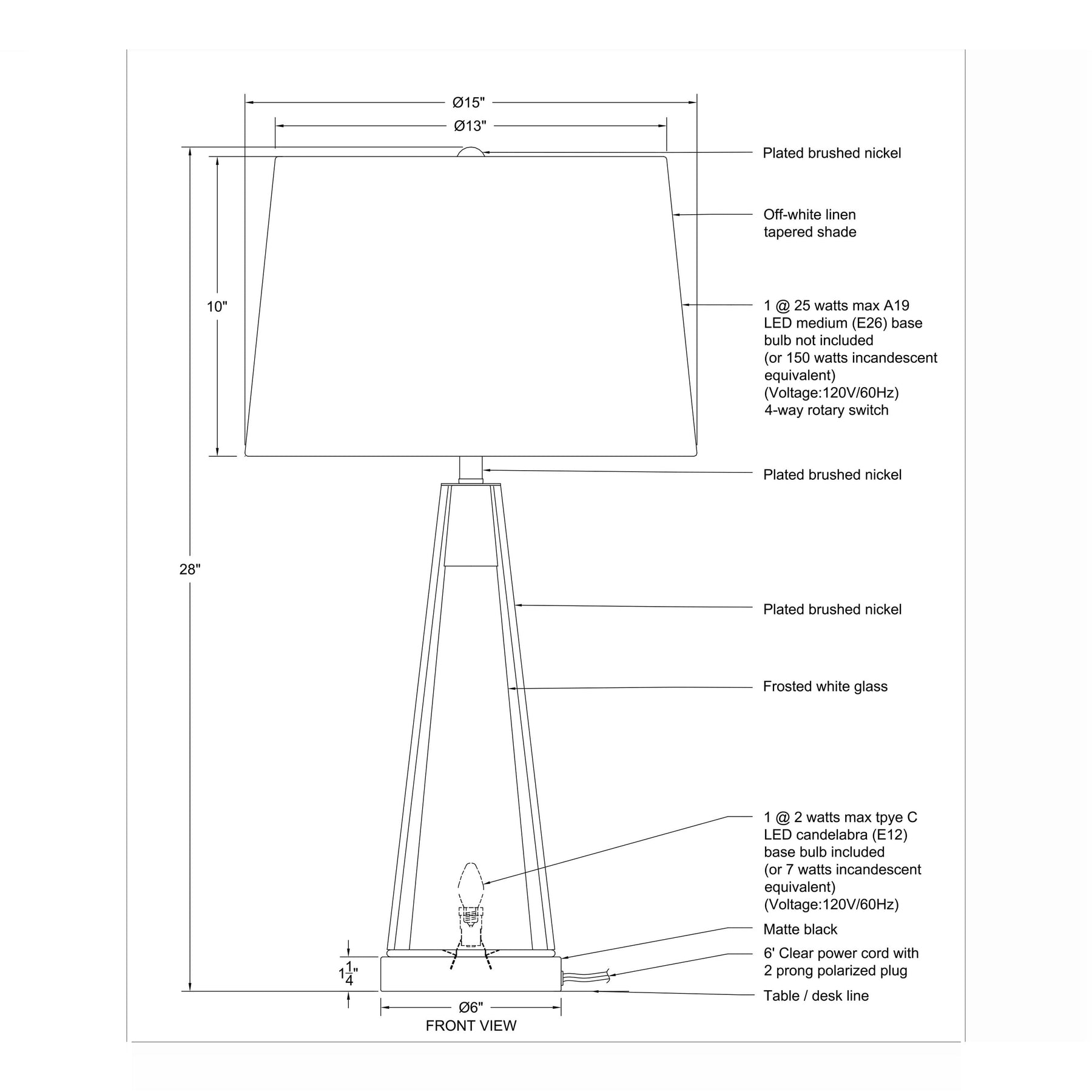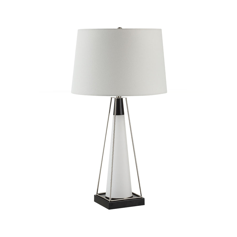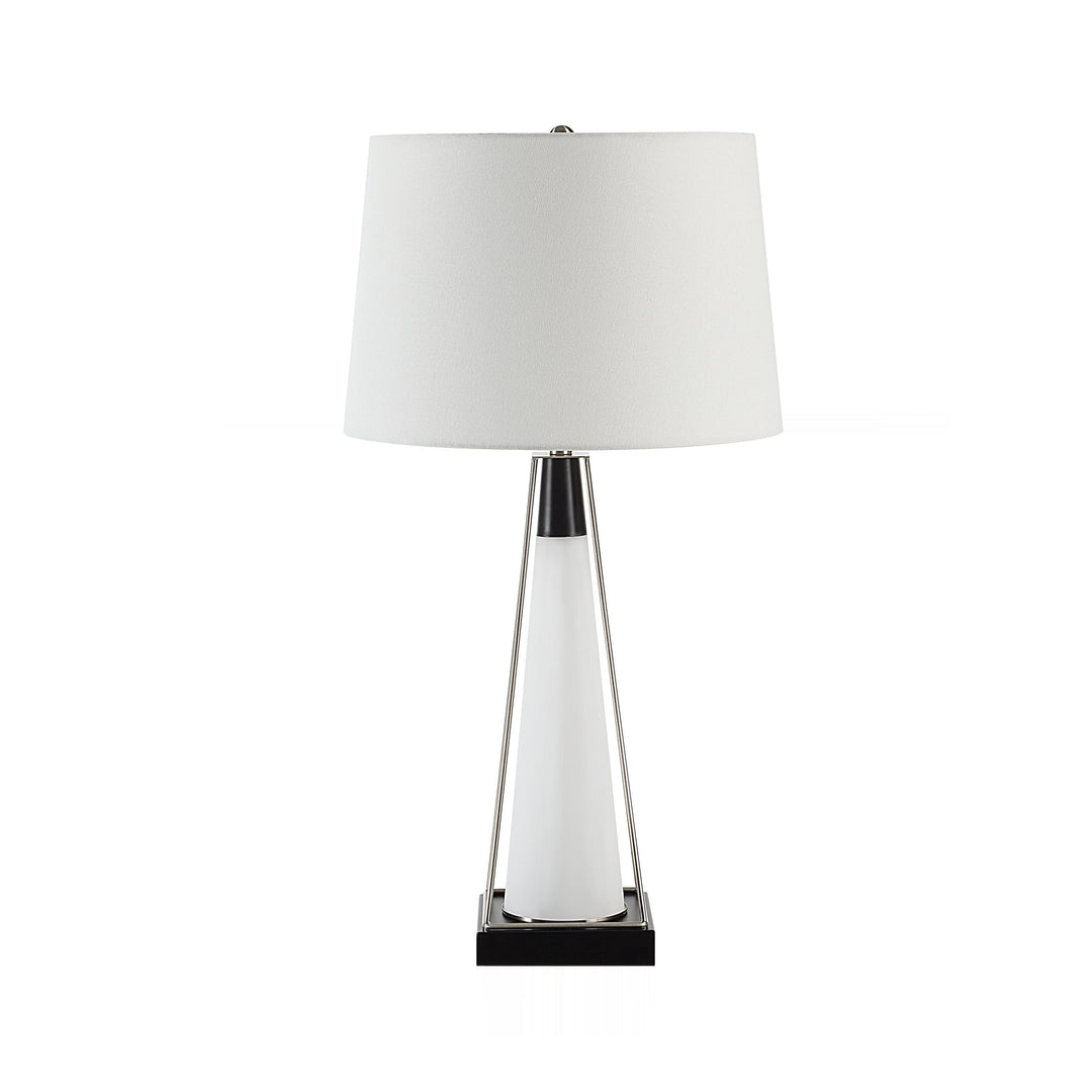 Sculptural lines define this modern accent lamp, balancing a crisp ivory linen drum shade against a geometric frame of brushed nickel and matte black. The central frosted glass column offers a soft, diffused core, creating sophisticated visual tension and contemporary elegance.