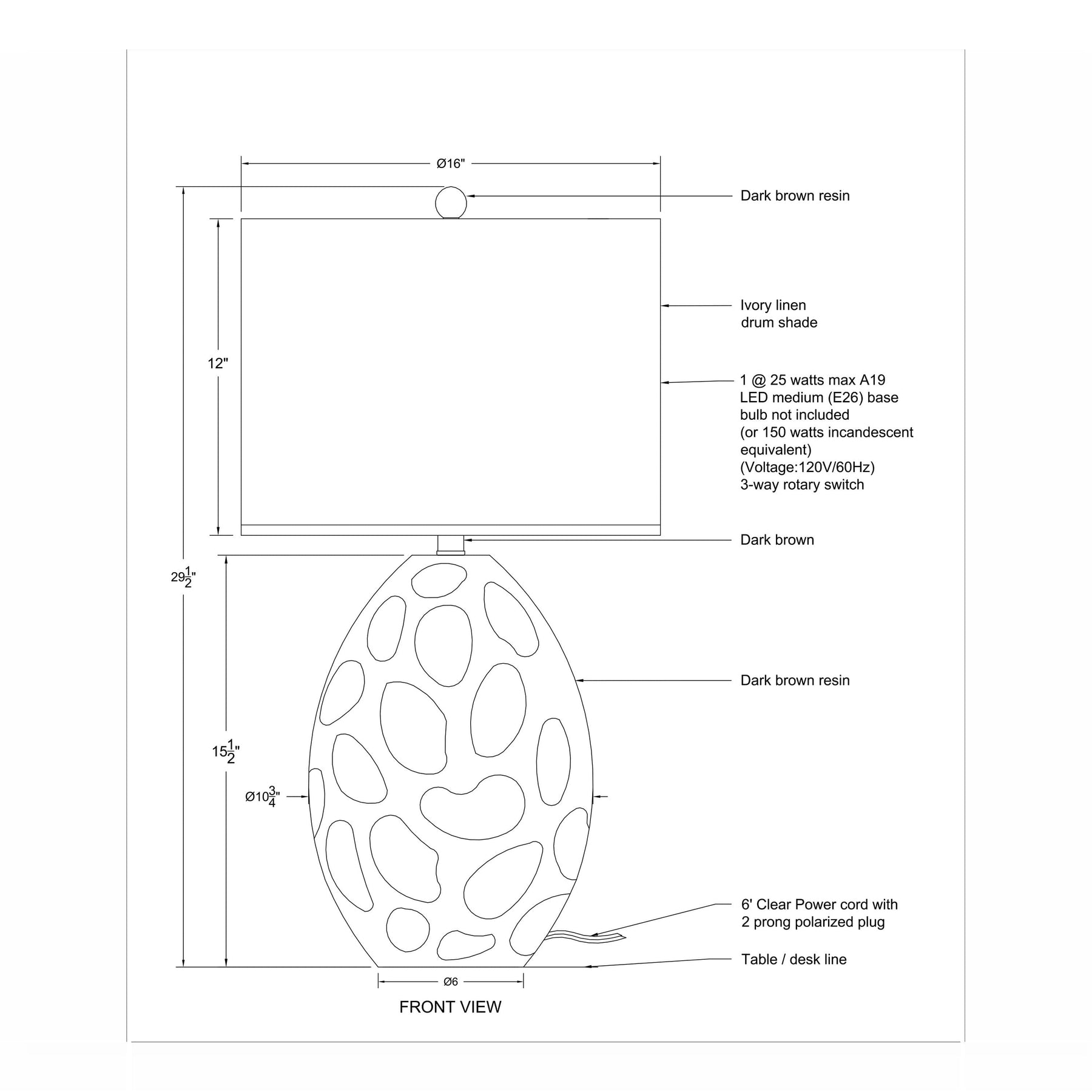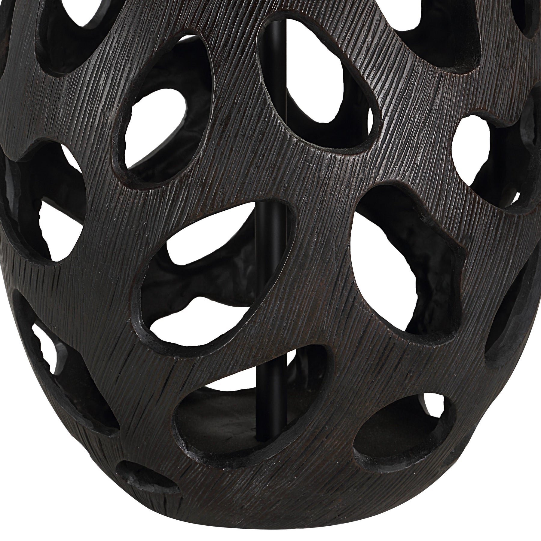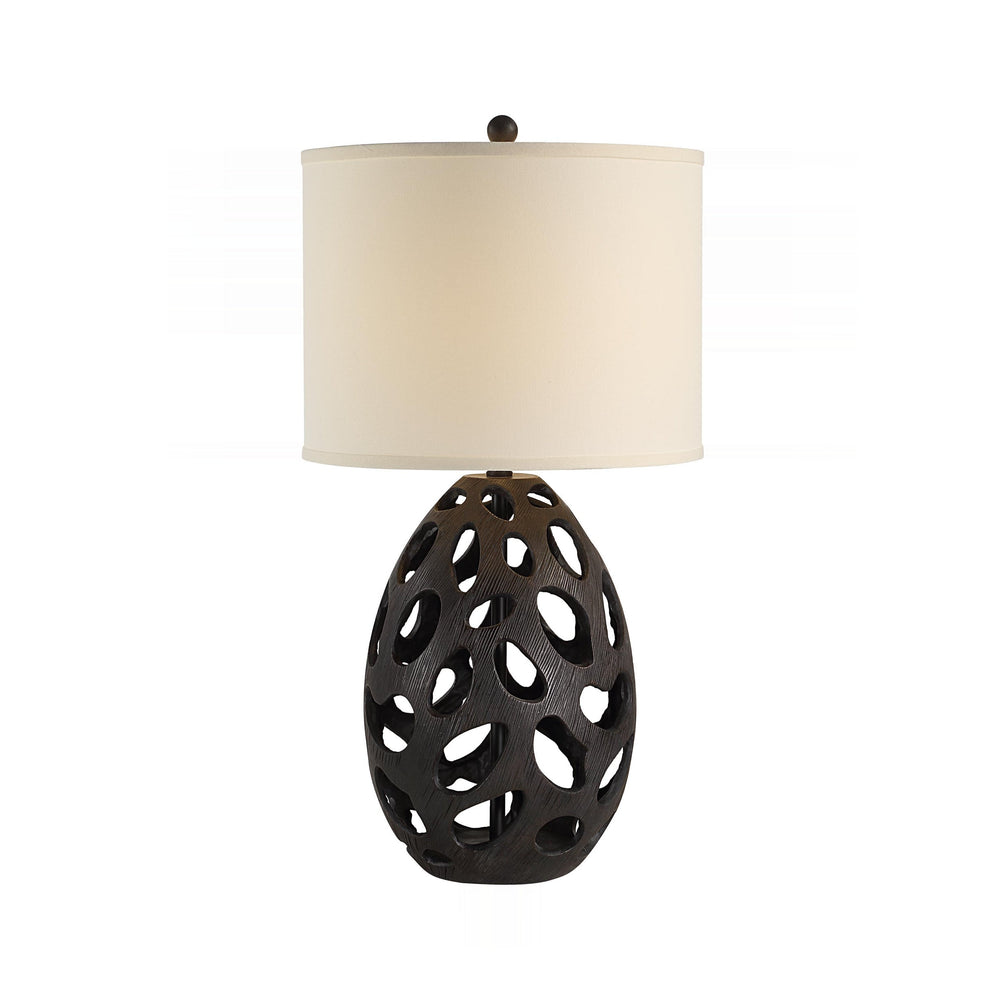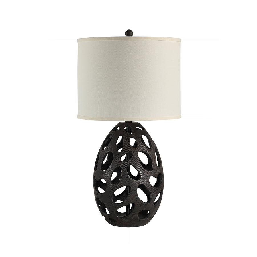 Sculptural, openwork base carved in a deep, organic texture introduces profound, earthy visual weight to the silhouette. Its dark, rich finish contrasts beautifully with the soft glow emanating from the linen drum shade.