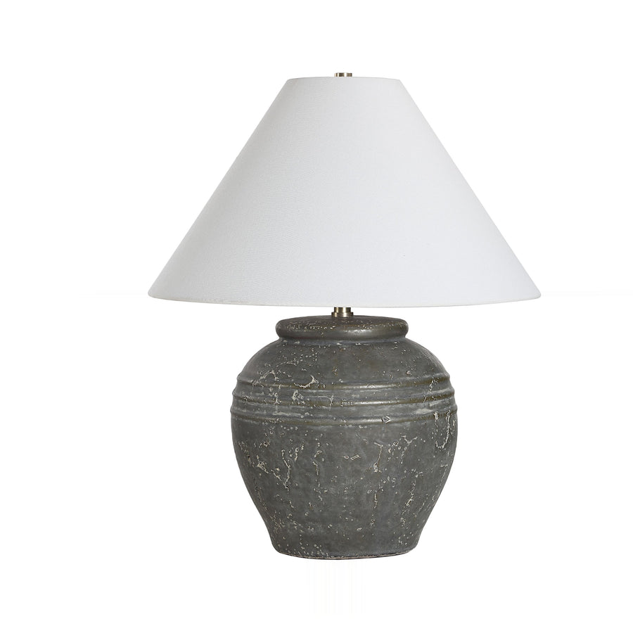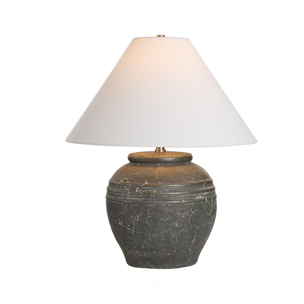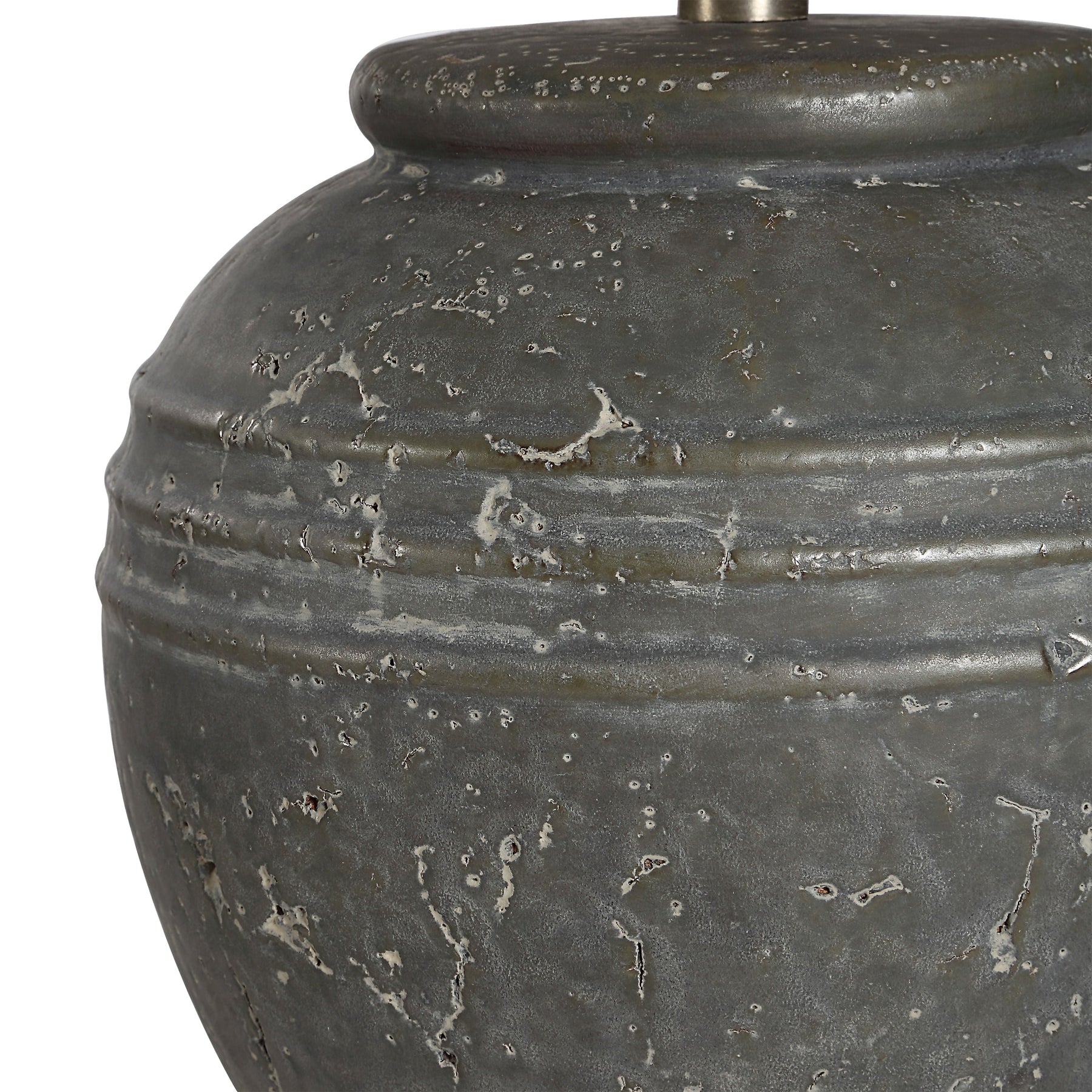 Hand-thrown ceramic anchors this lamp, presenting an organic, deeply textured form finished in a unique olive wash that suggests aged patina. The substantial silhouette establishes immediate gravity and artistic presence on any surface.