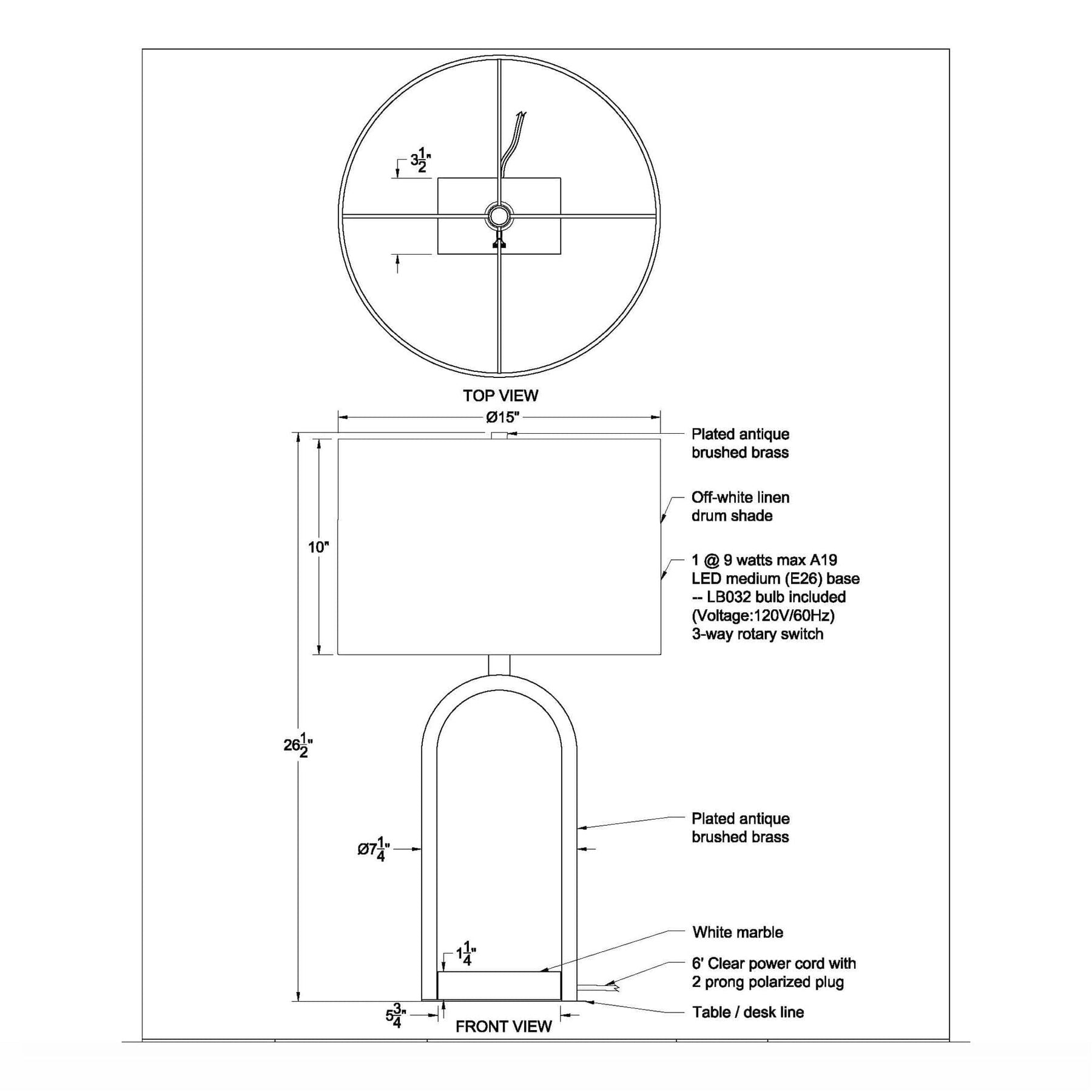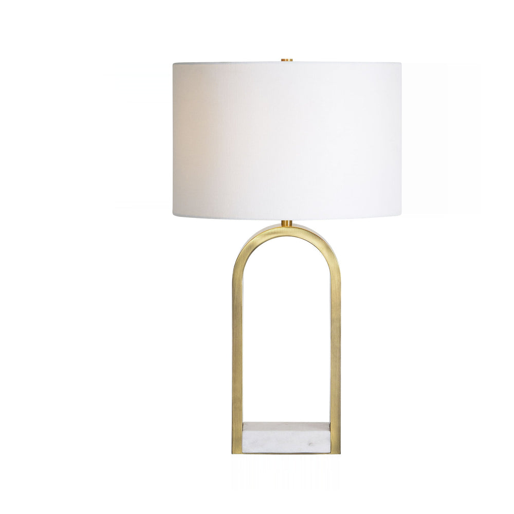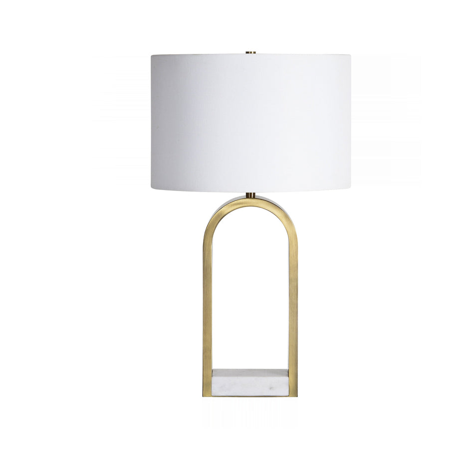 Architectural grace defines this lamp, showcasing a striking arched form crafted from antique brushed brass-plated iron. A substantial white marble base anchors the piece, offering cool, textural contrast to the warm metallic sheen throughout the structure.