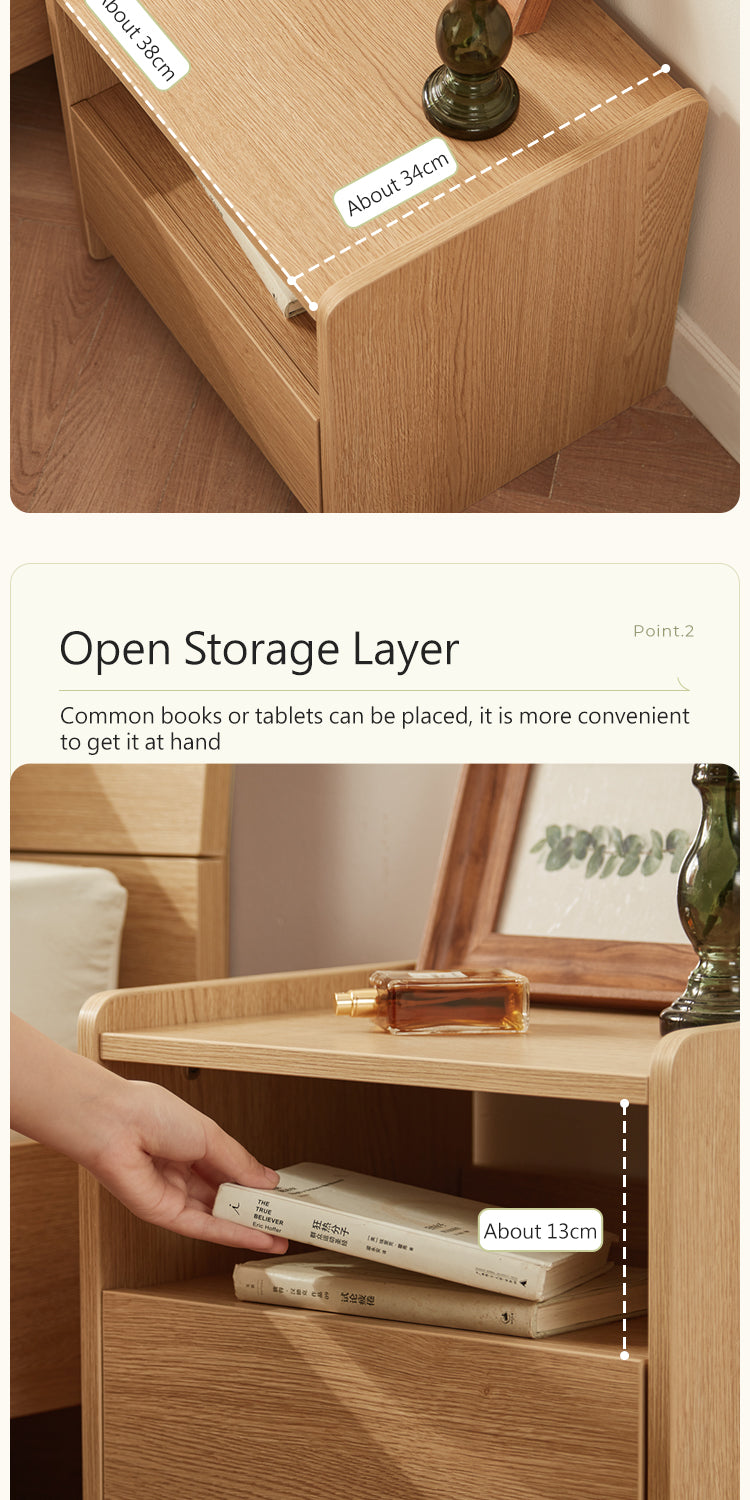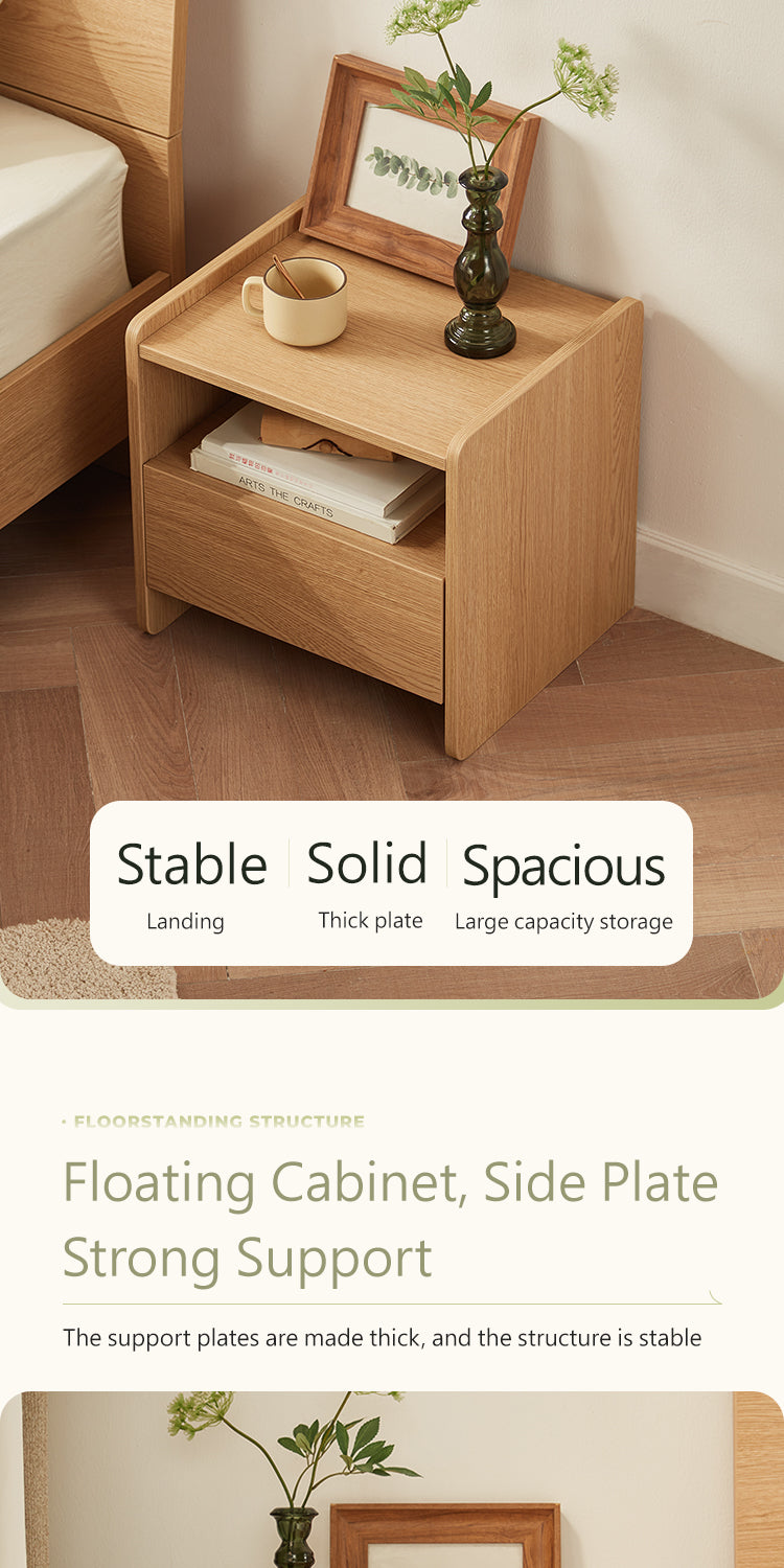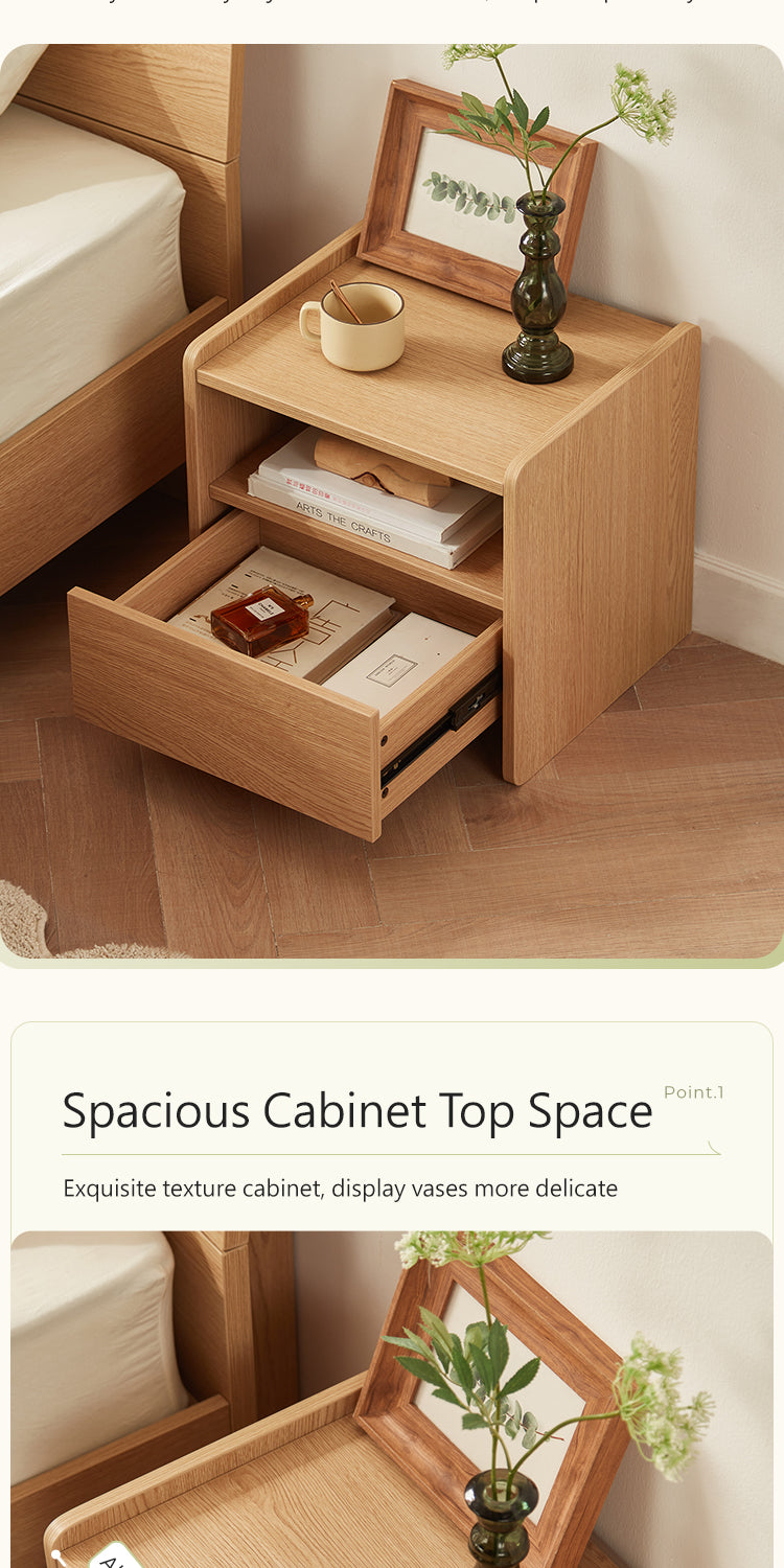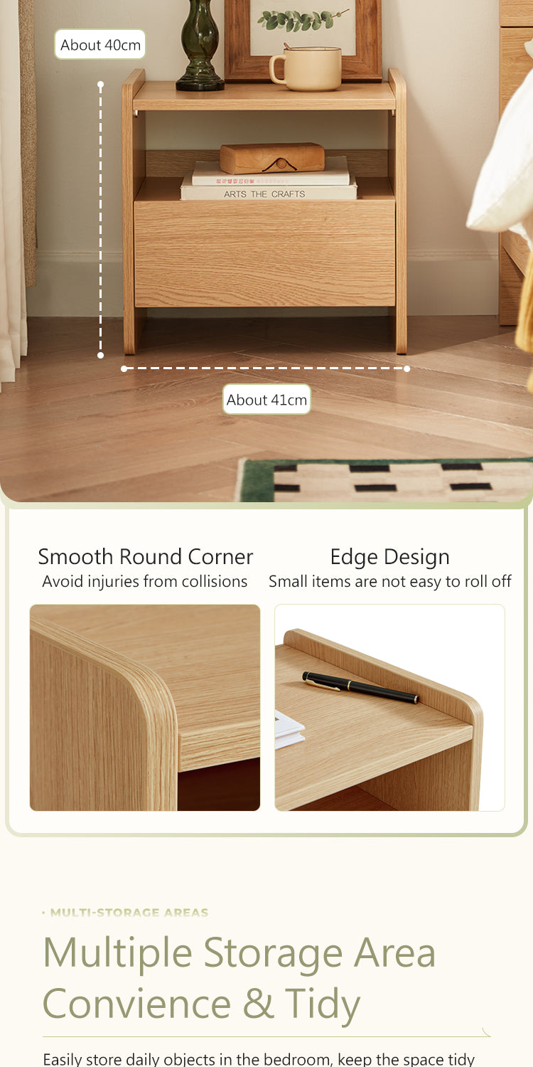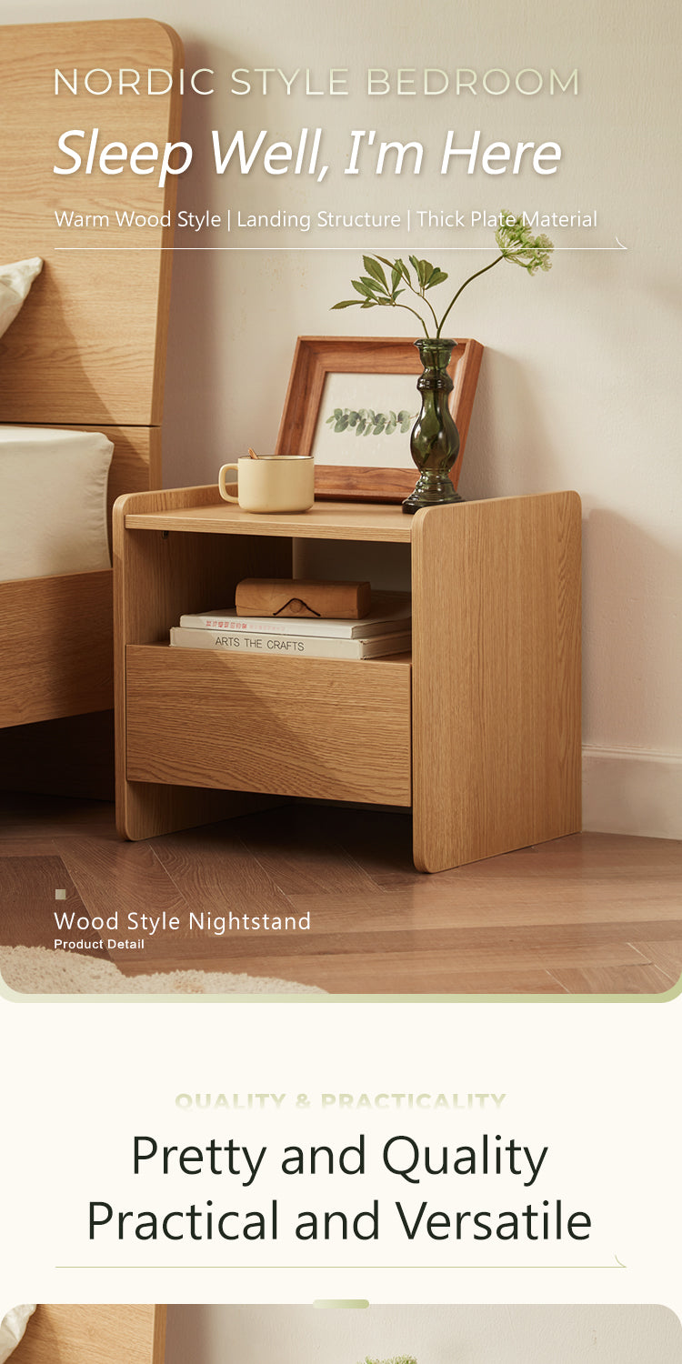 This elegantly designed bedside companion marries functionality with a timeless aesthetic. The smooth, light-hued wood finish exudes a sense of tranquility and warmth, inviting peaceful slumbers. Its open shelf and drawer offer a blend of display and concealment, optimizing bedside organization.