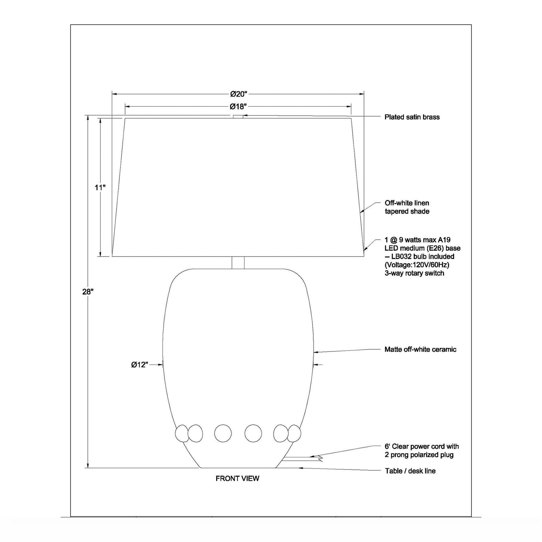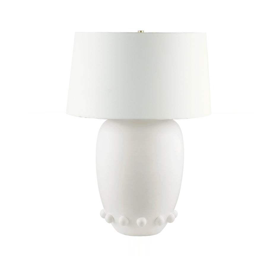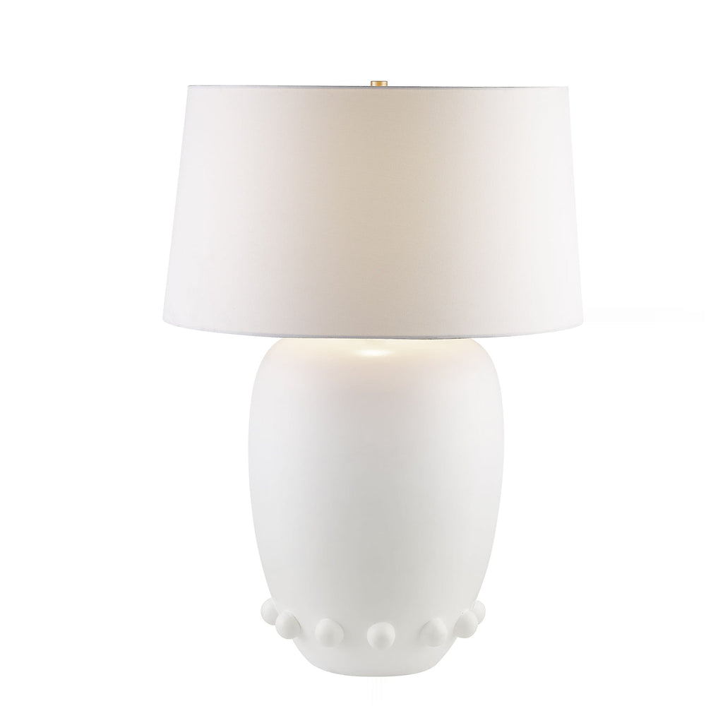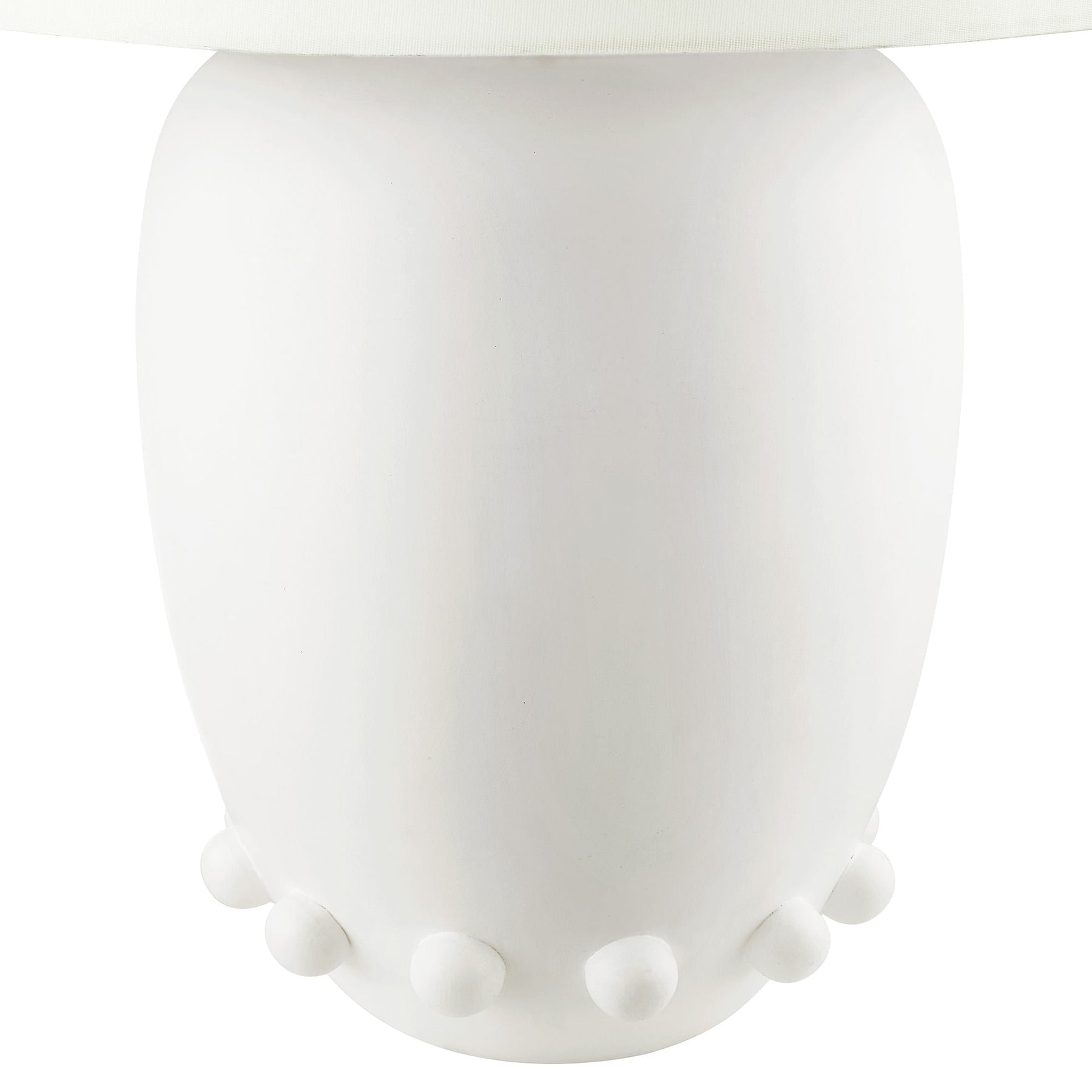 Sculptural ceramic body in a luminous off-white finish anchors this sophisticated table lamp. Its subtly rounded silhouette introduces organic softness, perfectly complemented by the clean geometry of the crisp drum shade.