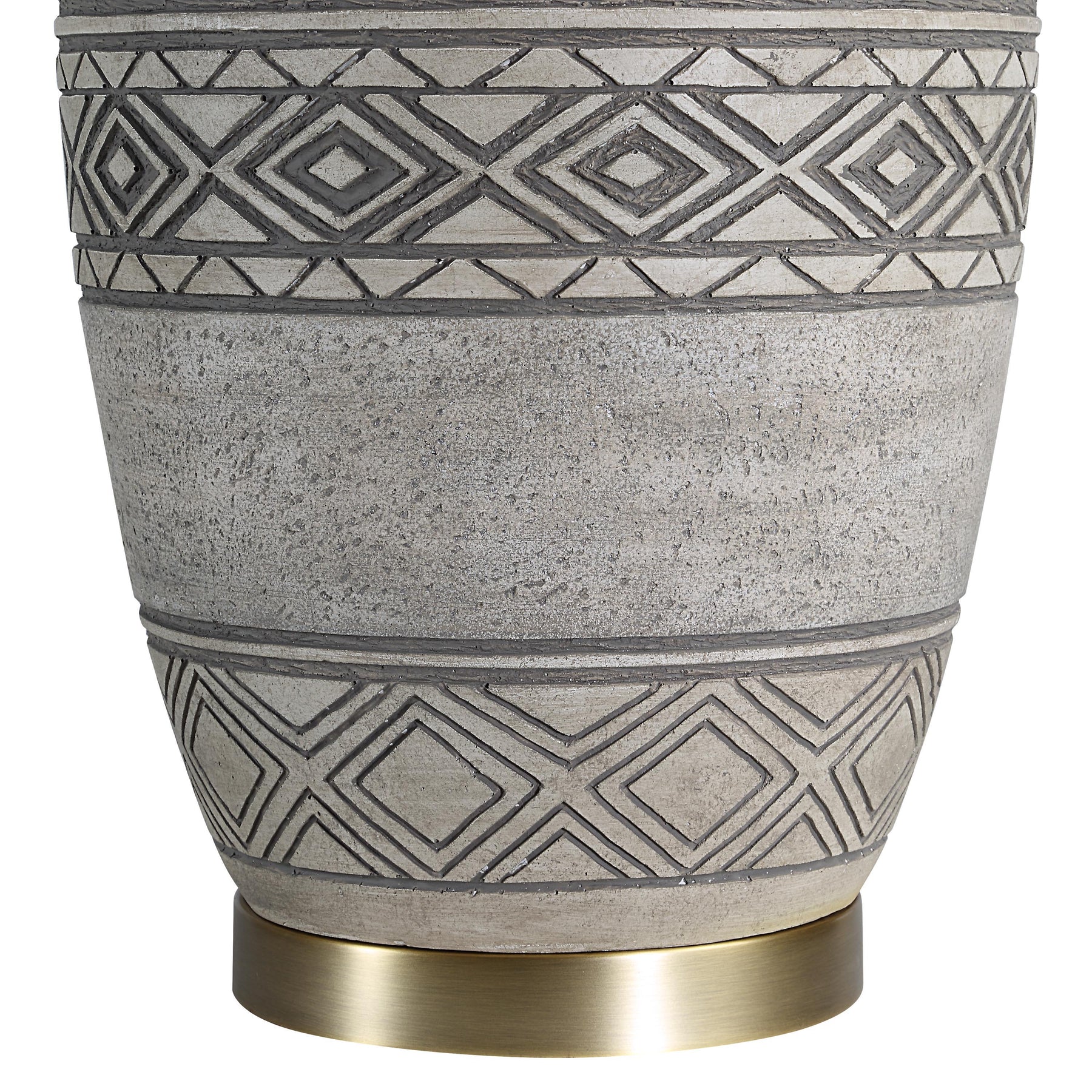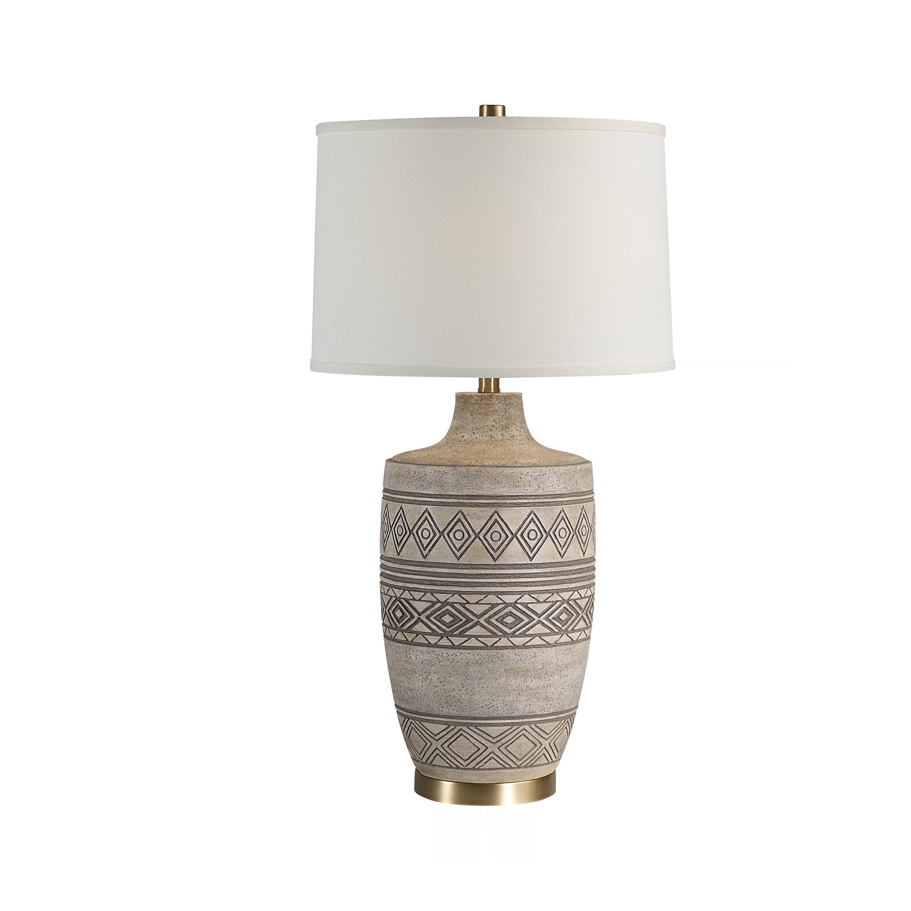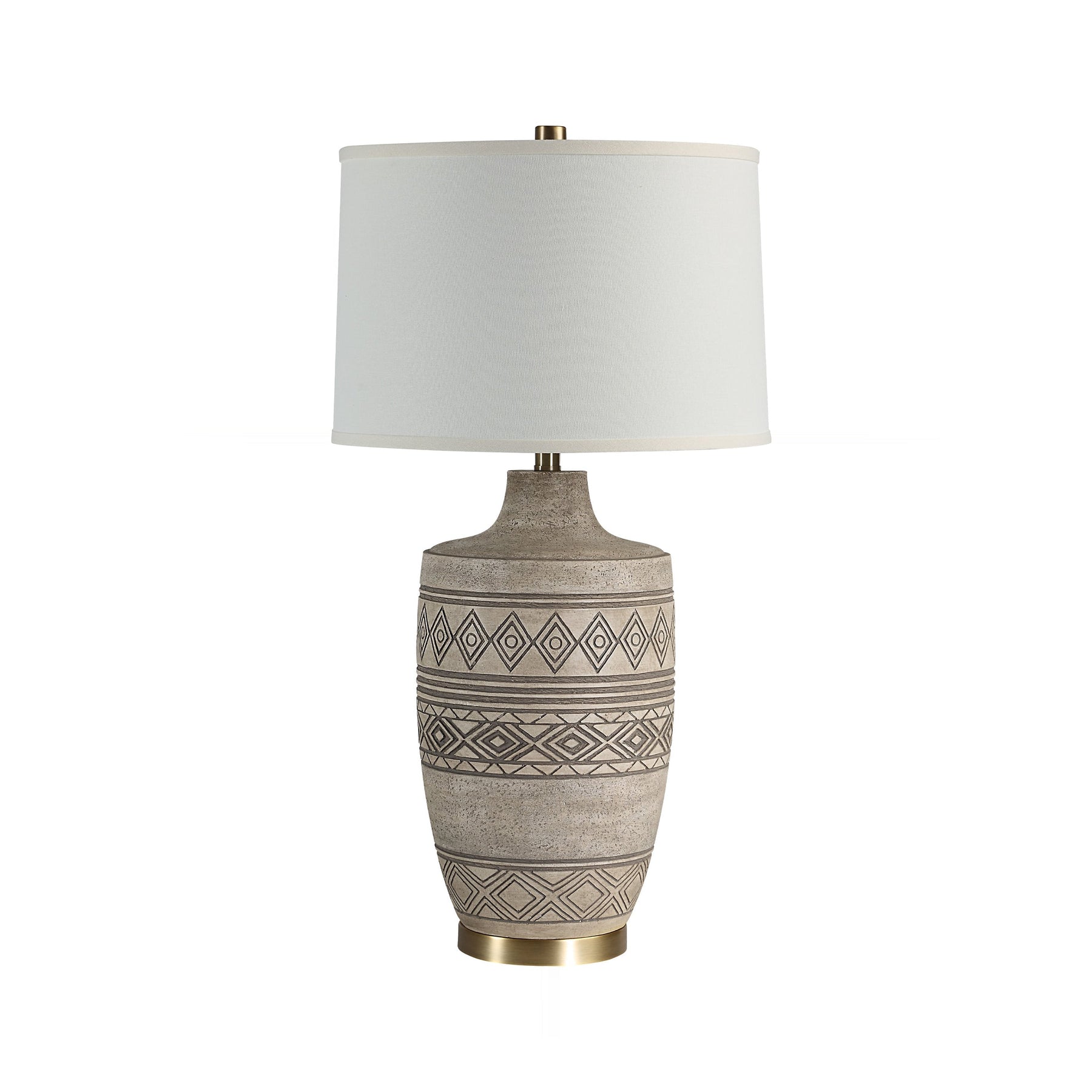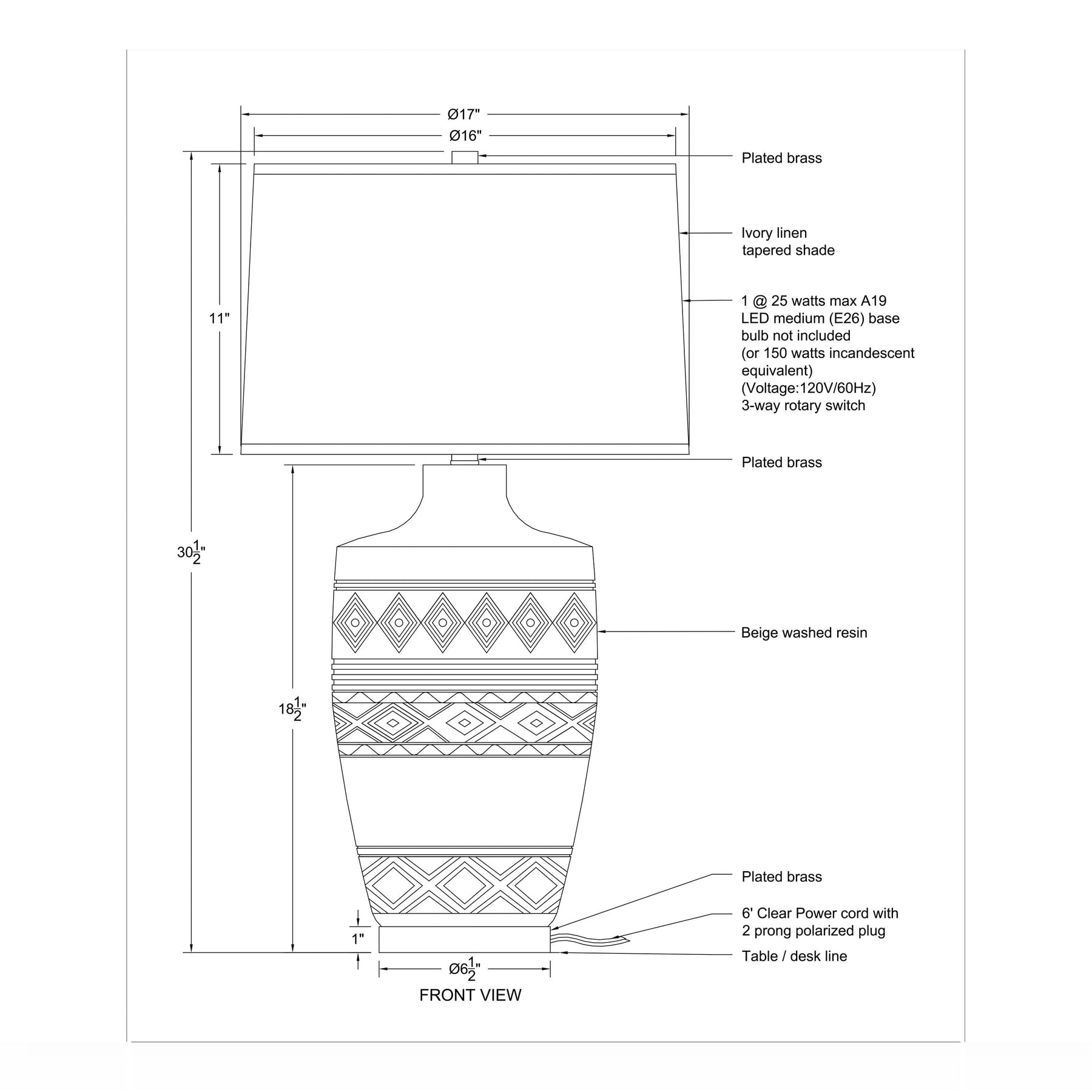 Designed with artistic flair, this beige resin table lamp showcases a hand-finished geometric pattern and a subtle washed texture that adds earthy elegance to any space. The ivory linen shade casts a soft, balanced glow, perfect for layering ambient lighting in living rooms, bedrooms, or dining areas.