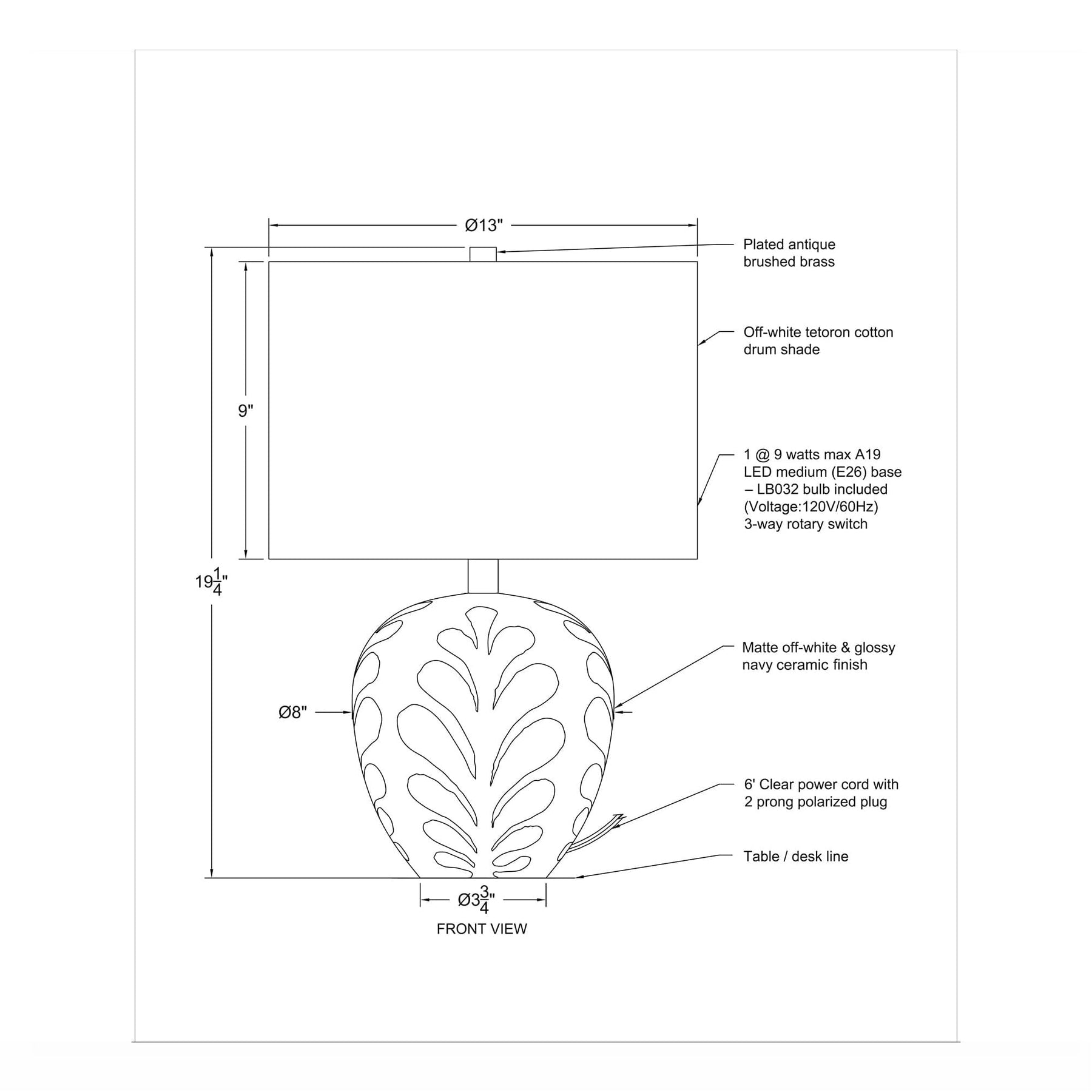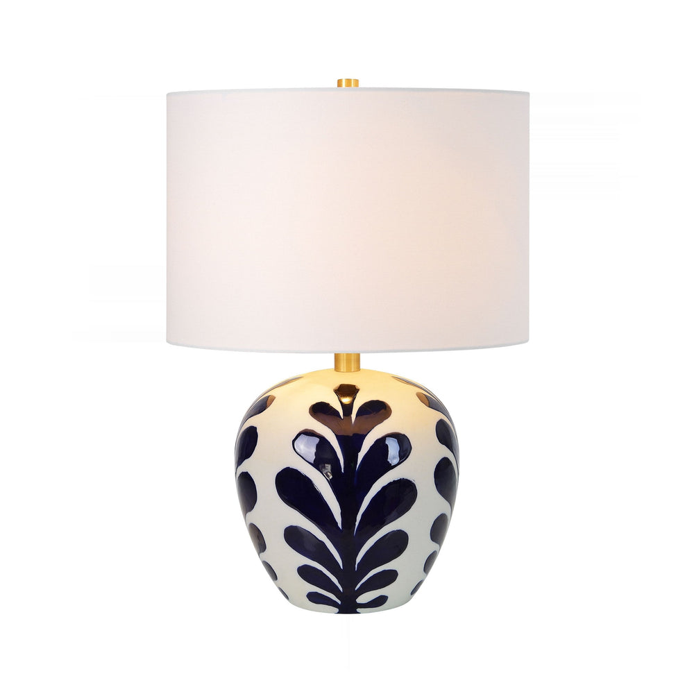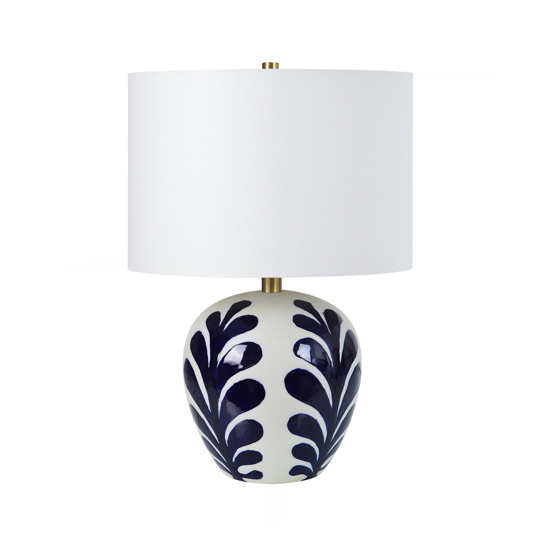Glazed ceramic forms an arresting silhouette, detailed with bold, hand-painted navy botanicals against a creamy porcelain ground. This artisanal base anchors the piece with visual weight and handcrafted texture, evoking classic artistry reimagined for modern living spaces.