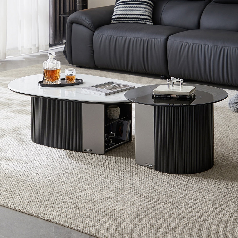 Crafted with matte-finish metal accents and ribbed cylindrical bases, these tables offer both durability and style. The larger unit also integrates hidden storage compartments, providing space to keep magazines, remotes, or small accessories neatly tucked away. Their curved edges, scratch-resistant surfaces, and easy-to-clean finishes make them perfect for modern homes seeking both sophistication and practicality.