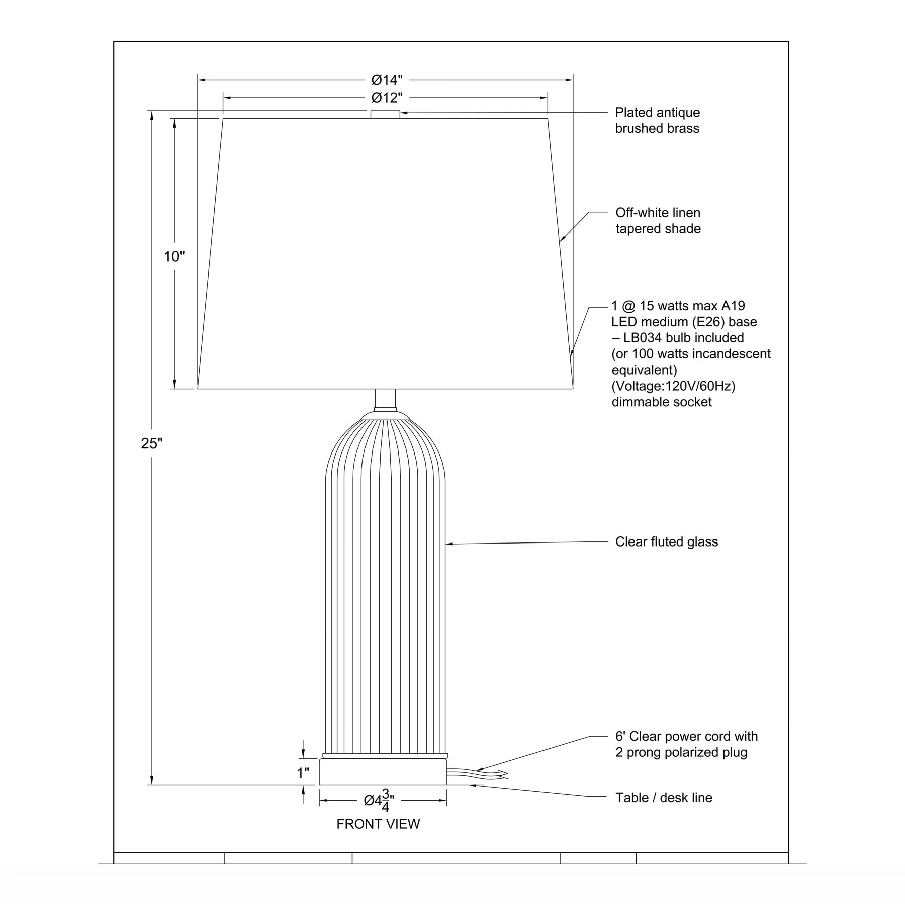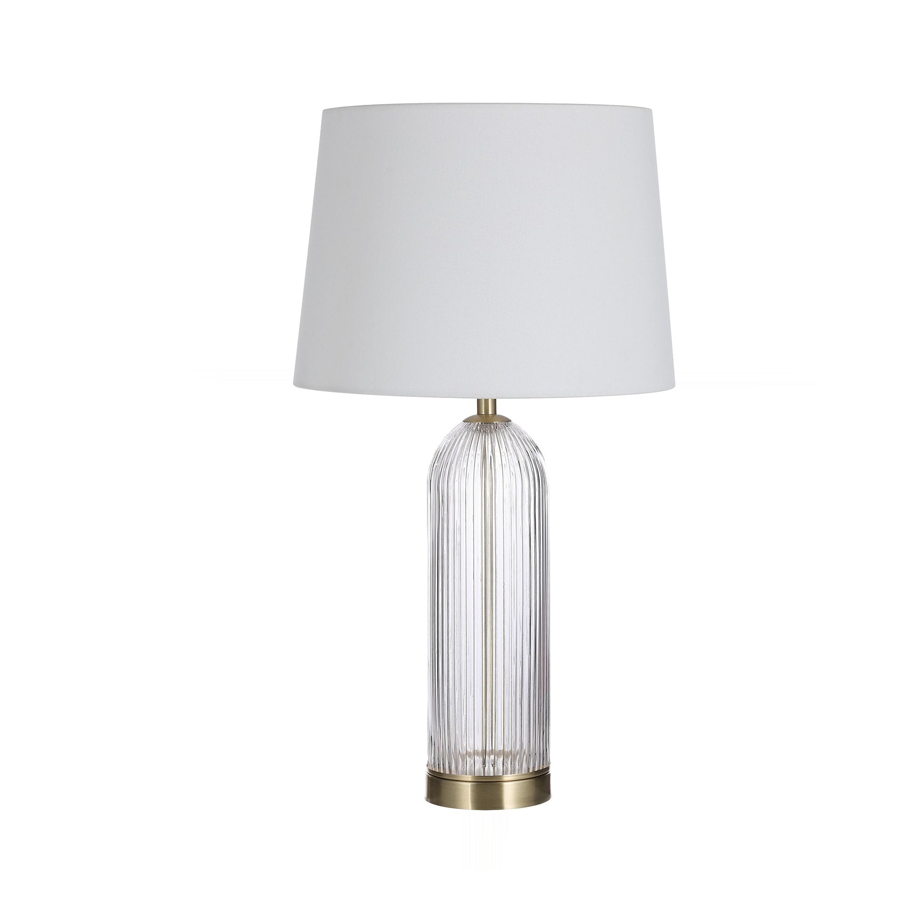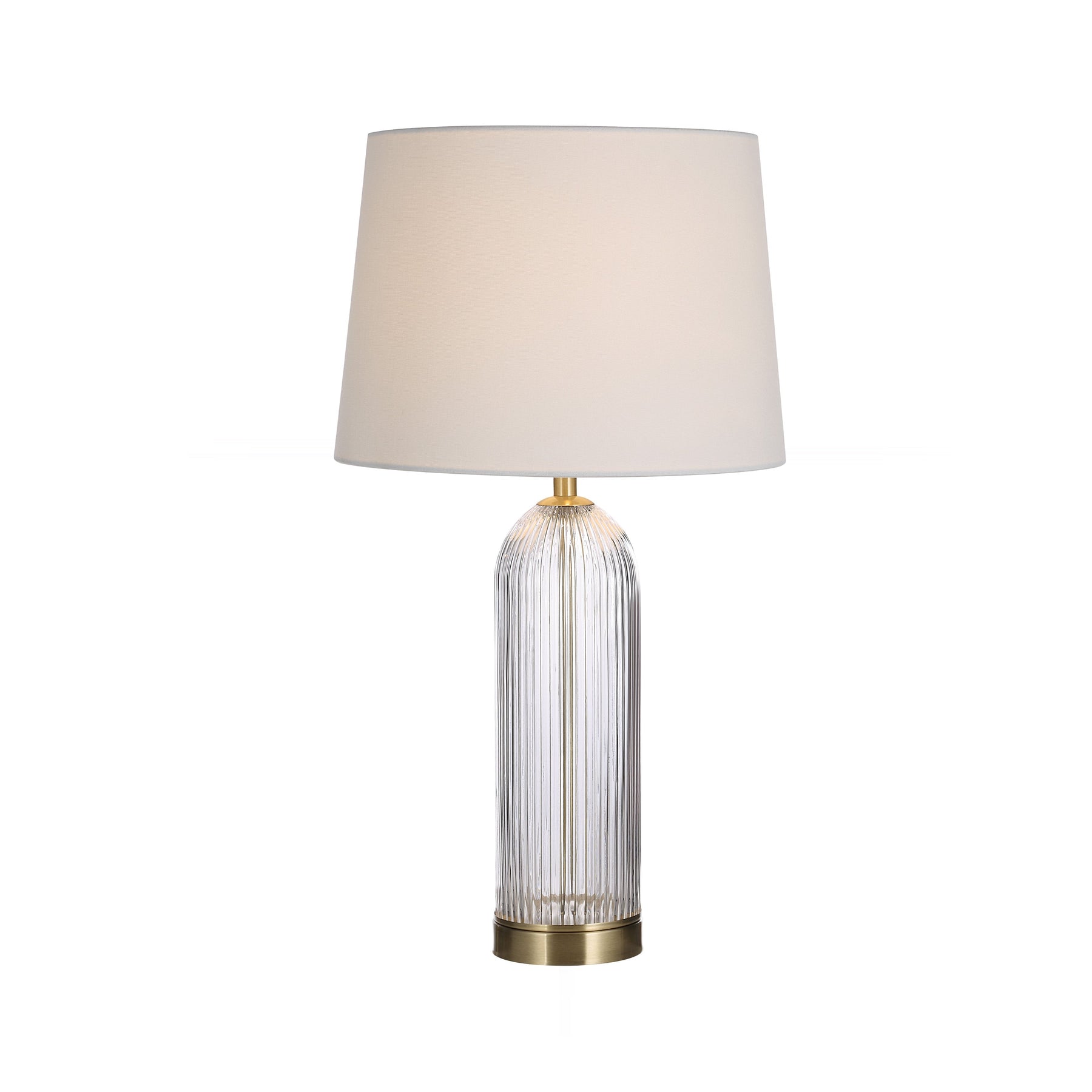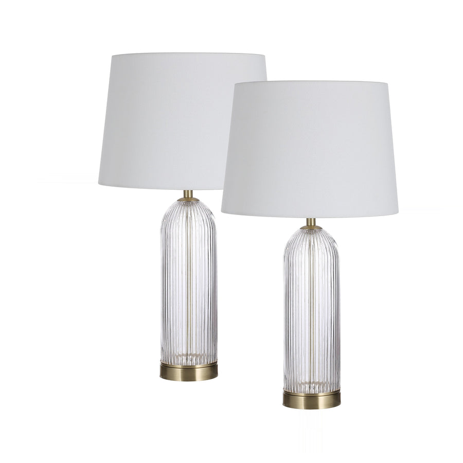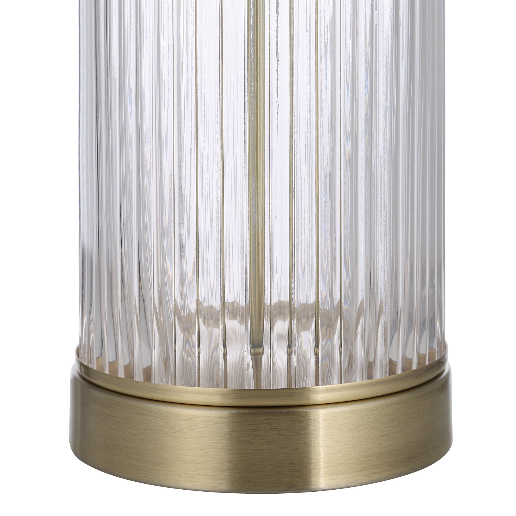 Fluted glass columns anchor these lamps, refracting light into captivating linear patterns that elevate any surface. Antique brushed brass accents introduce a warm, sophisticated contrast to the clear, vertically textured base.