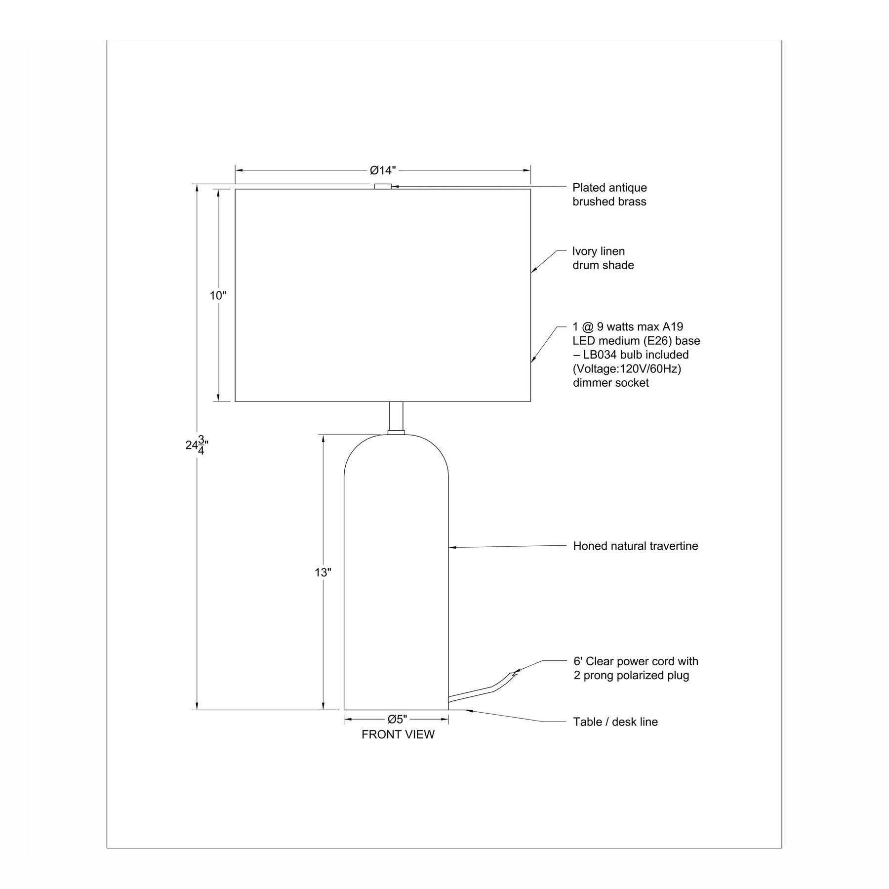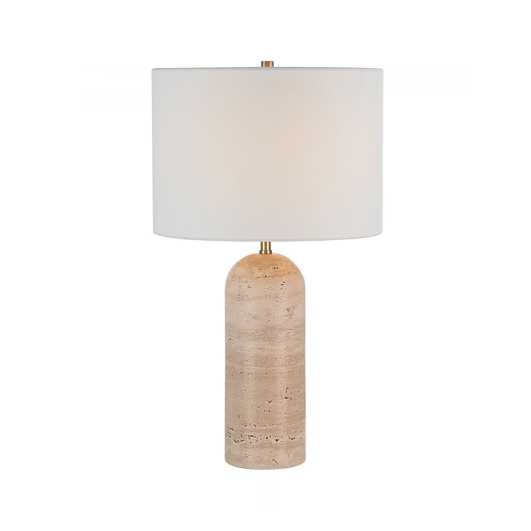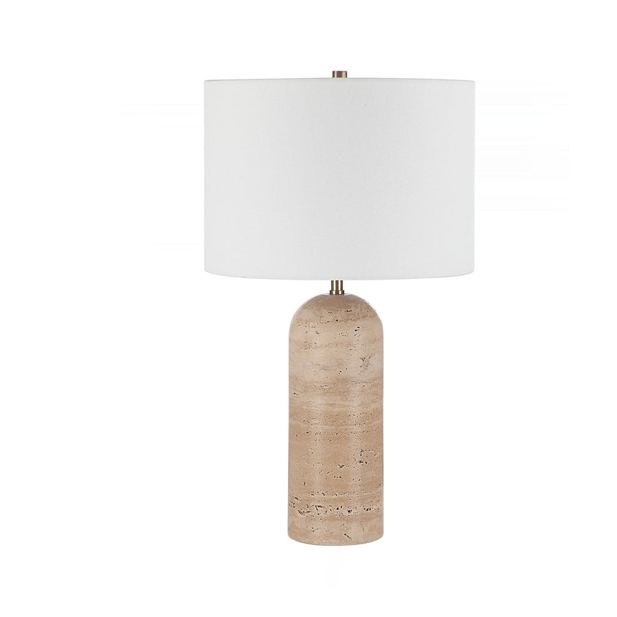 Solid travertine stone forms a weighty, cylindrical base, showcasing rich, organic pitting and layered veining for a naturally sculptural presence. This architectural foundation supports a crisp, clean drum shade, casting diffused, ambient light across sophisticated interiors.