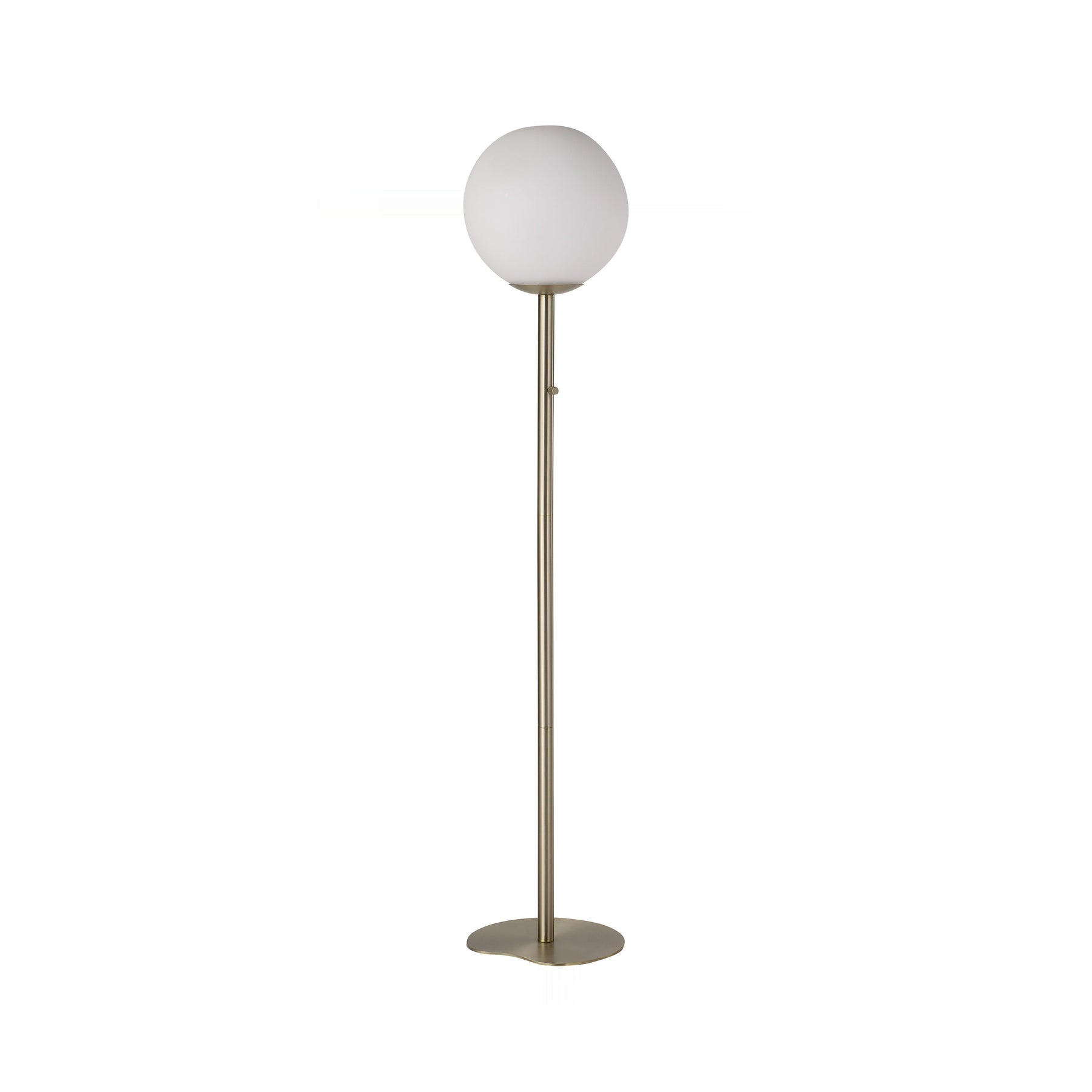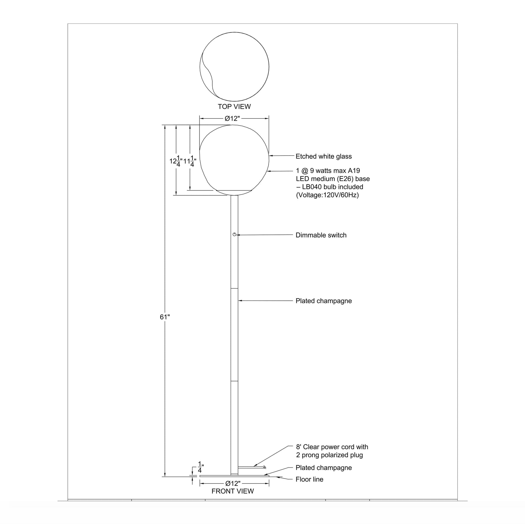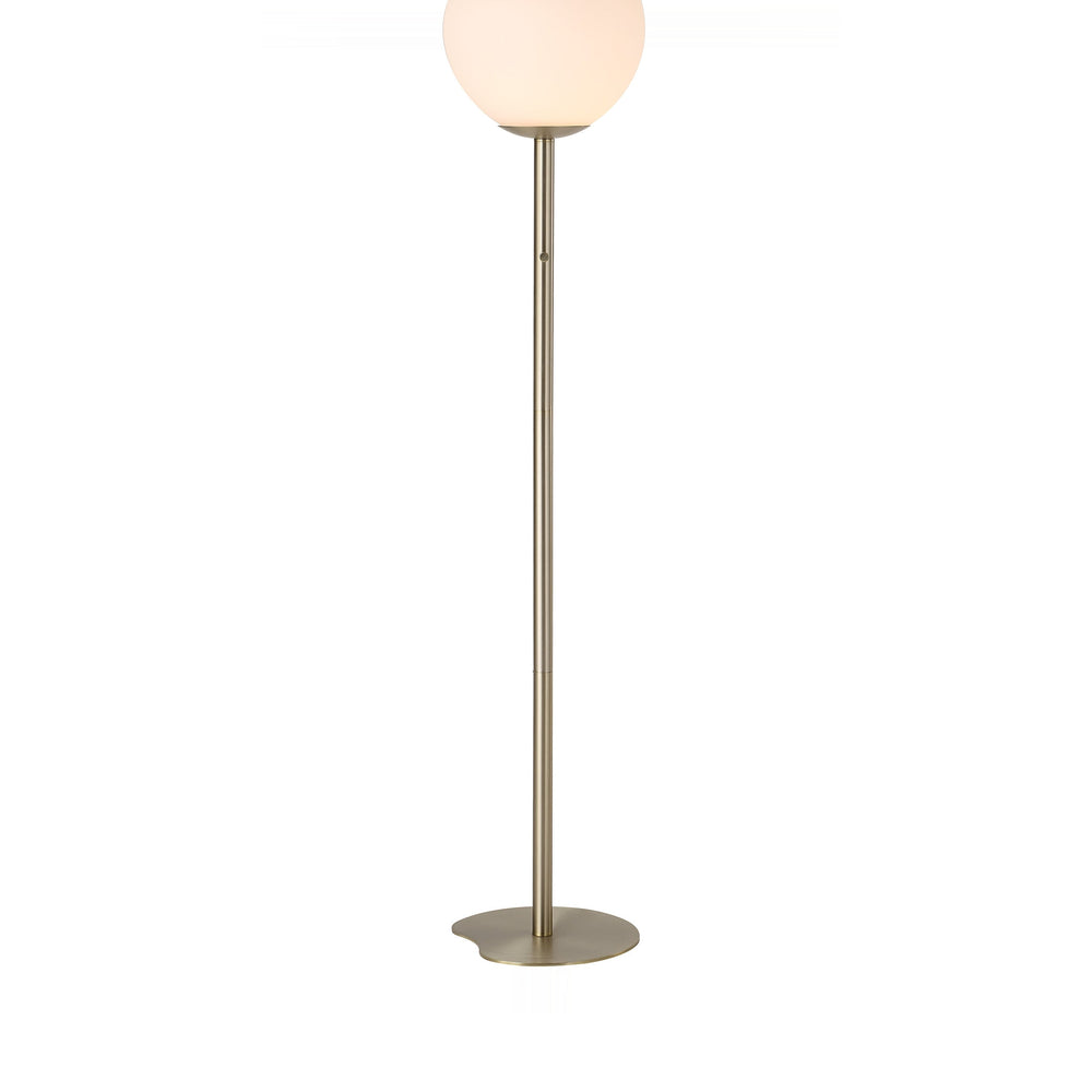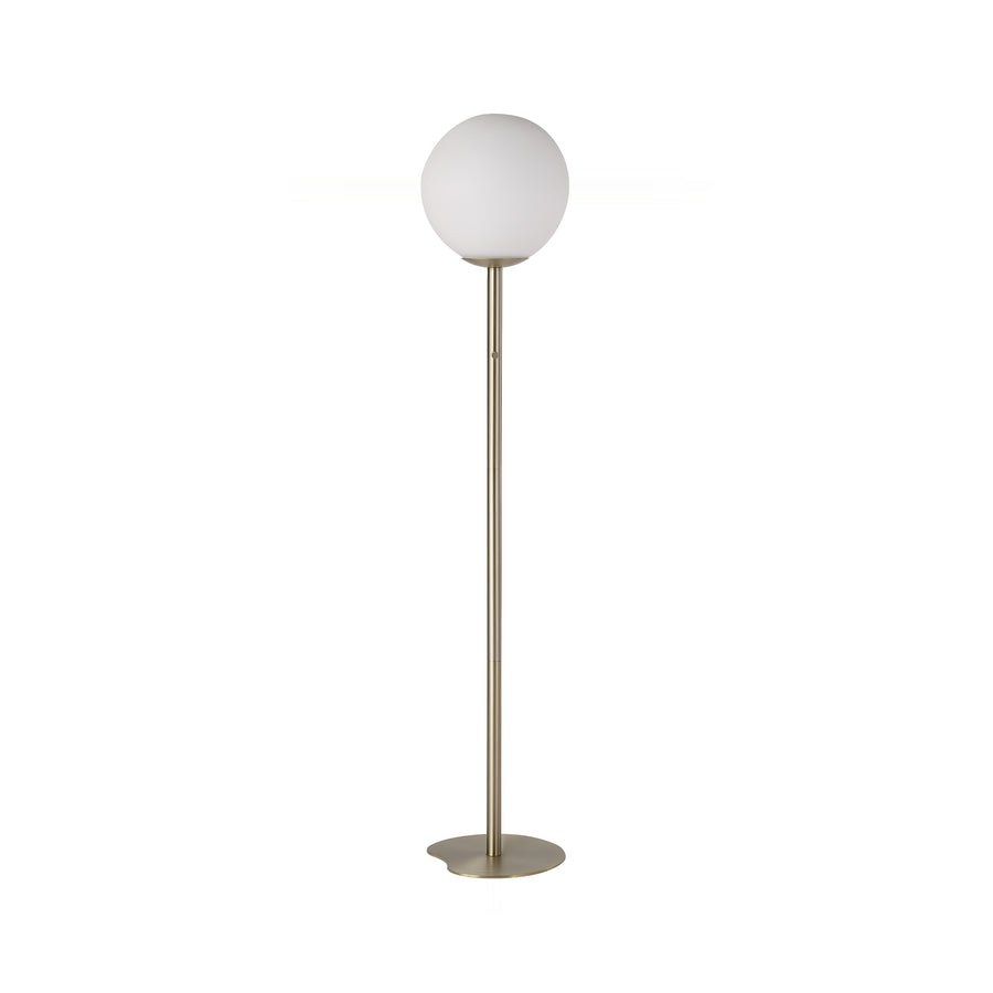 Champagne-plated iron forms a sleek, slender silhouette, topped by a perfectly spherical, etched glass orb for sophisticated illumination. This lamp introduces sculptural presence, effortlessly anchoring modern living areas with its warm metallic luster.