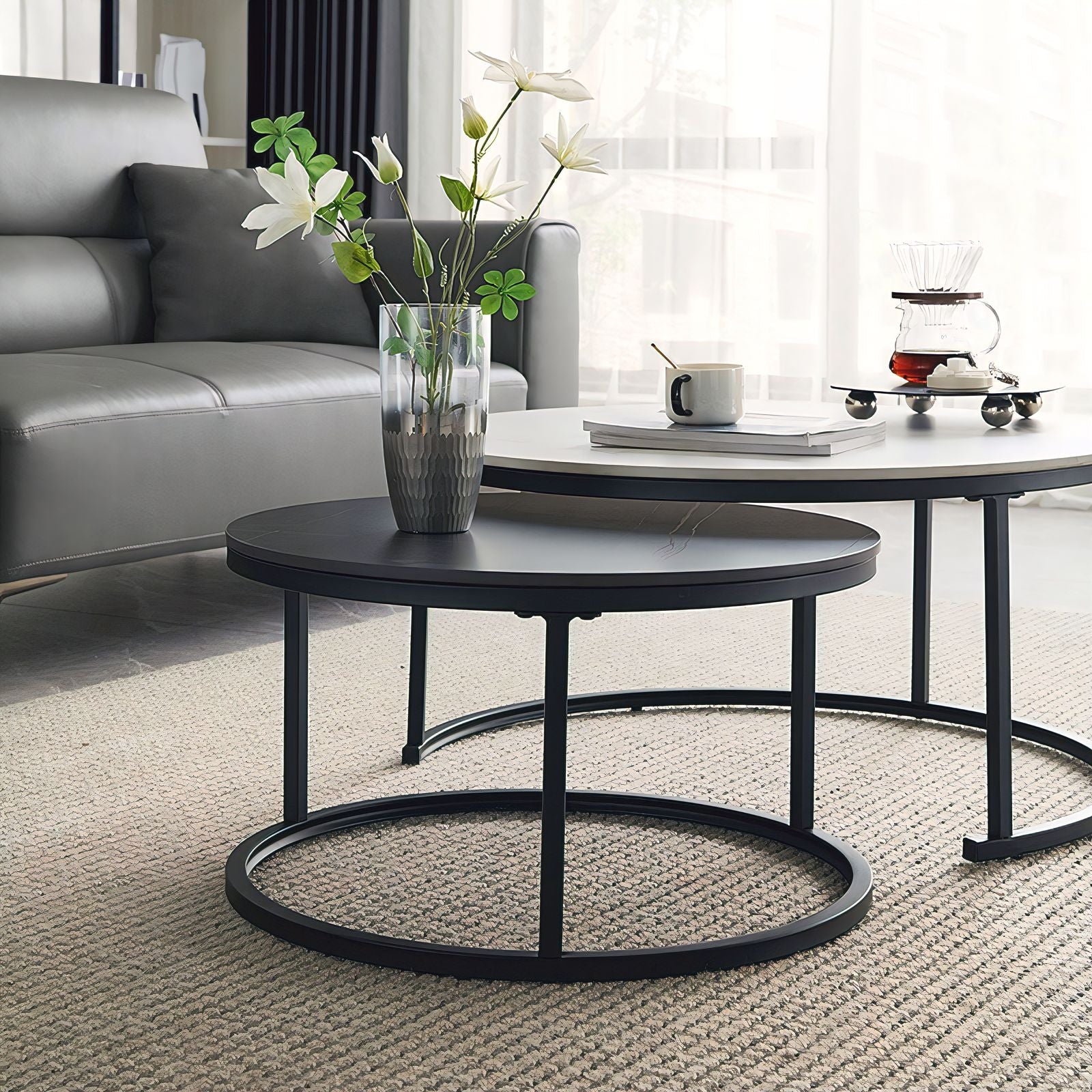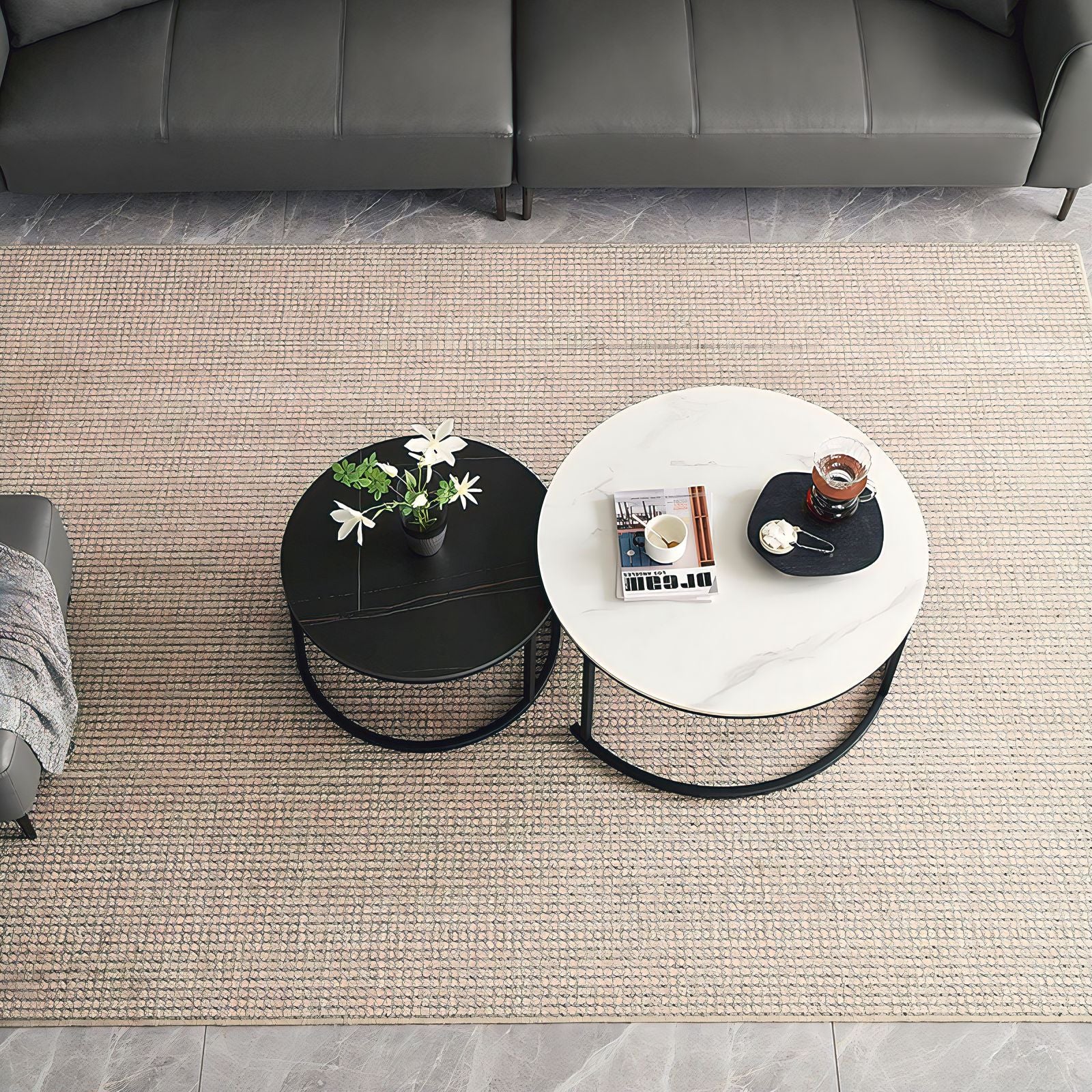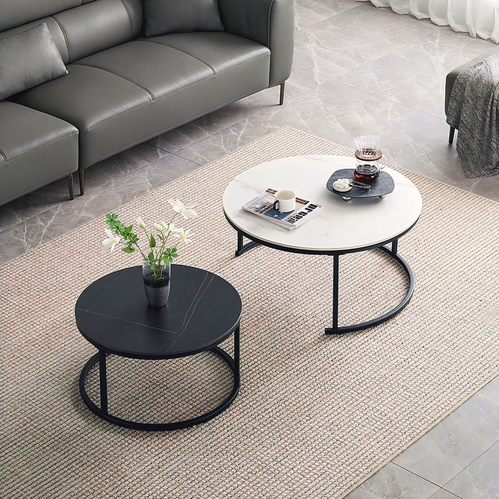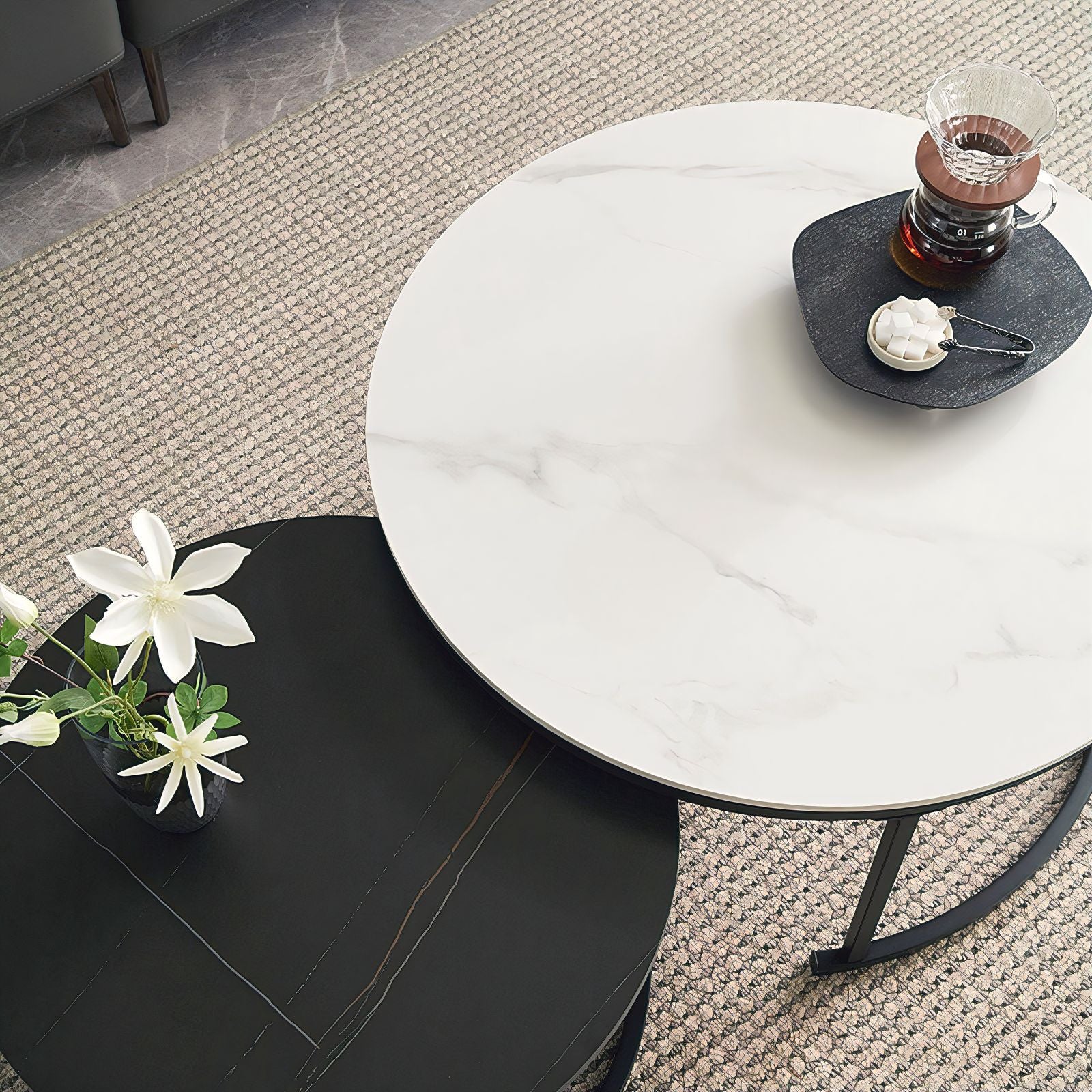 Nested coffee table set brings minimalist elegance and practical design to the forefront. The larger table's sintered stone top, with its marble-like finish, offers a luxurious, scratch-resistant surface, while the smaller, black table fits snugly underneath, its simplicity complementing the sophistication of its counterpart.