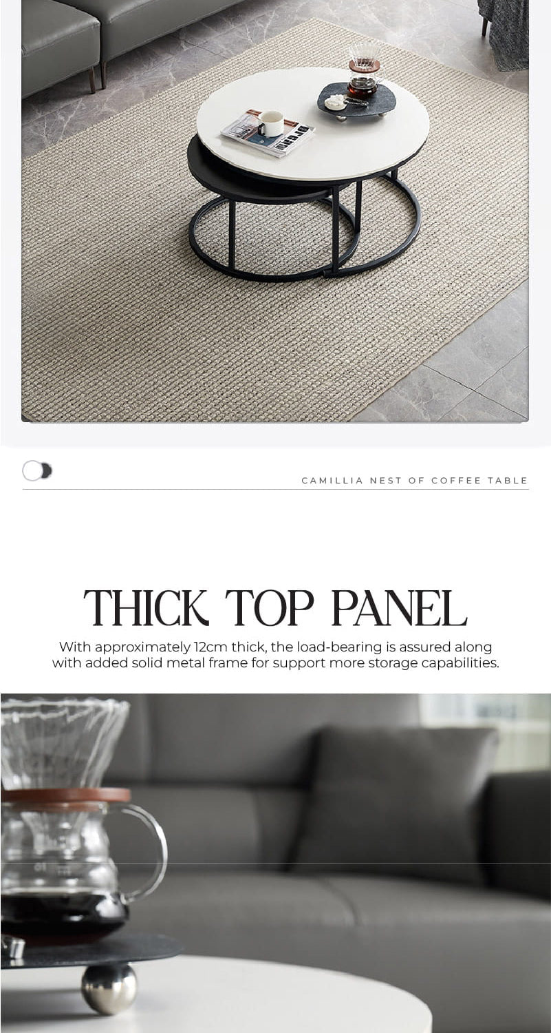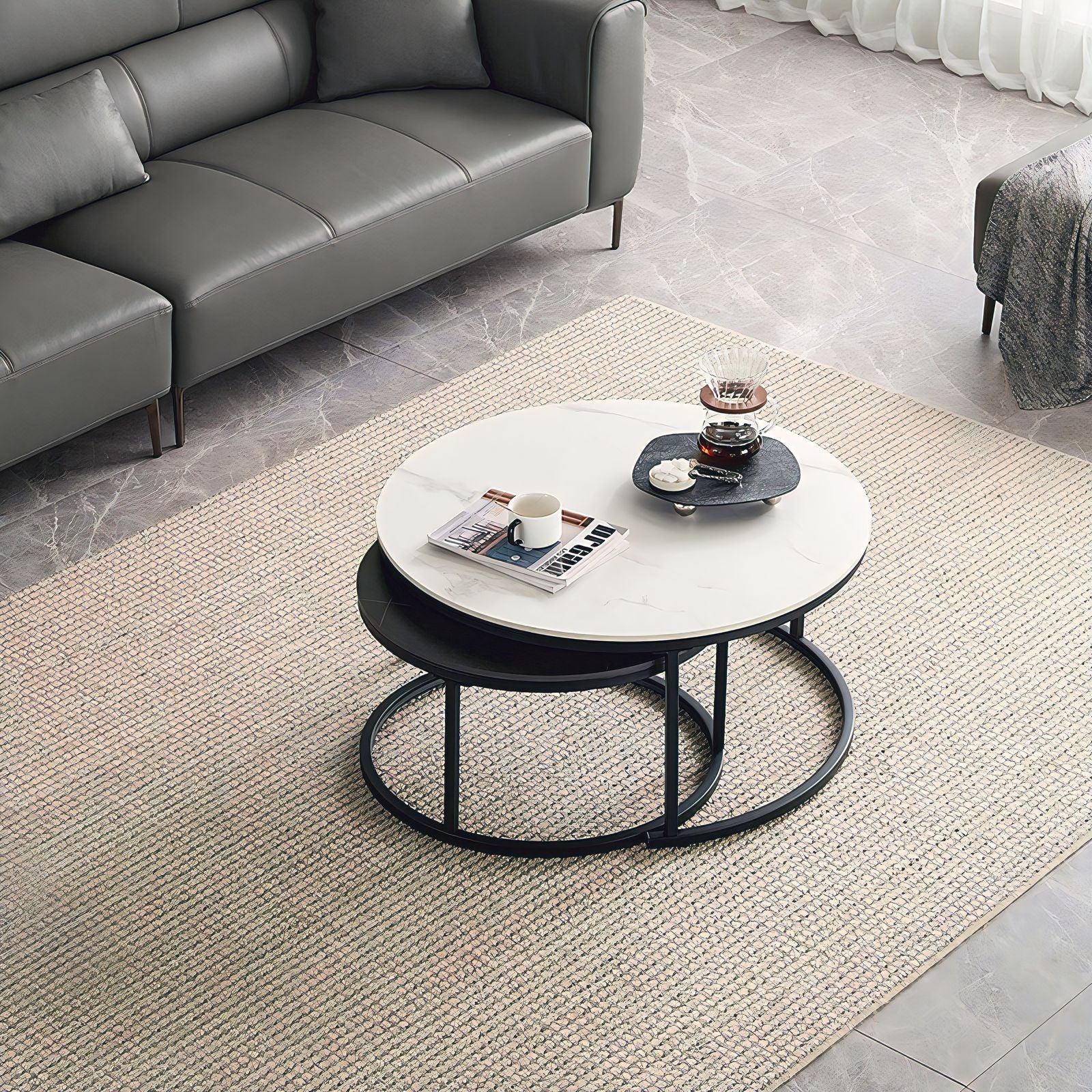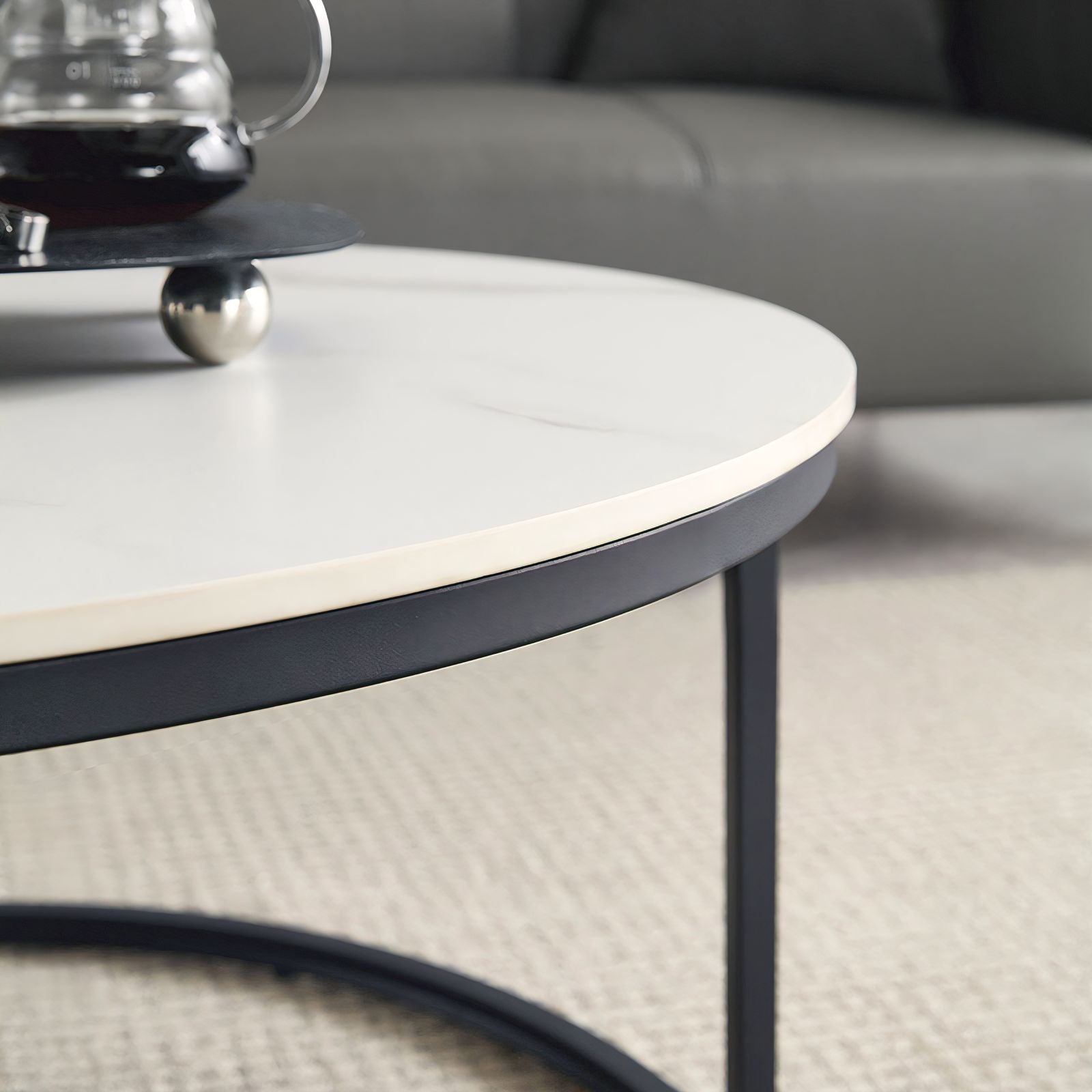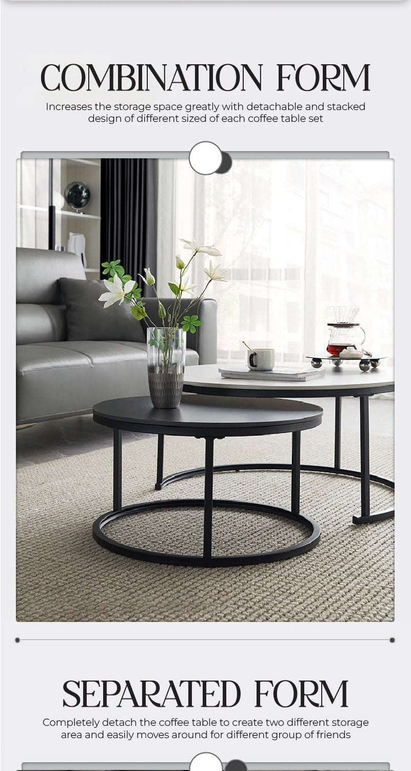 Nested coffee table set brings minimalist elegance and practical design to the forefront. The larger table's sintered stone top, with its marble-like finish, offers a luxurious, scratch-resistant surface, while the smaller, black table fits snugly underneath, its simplicity complementing the sophistication of its counterpart.