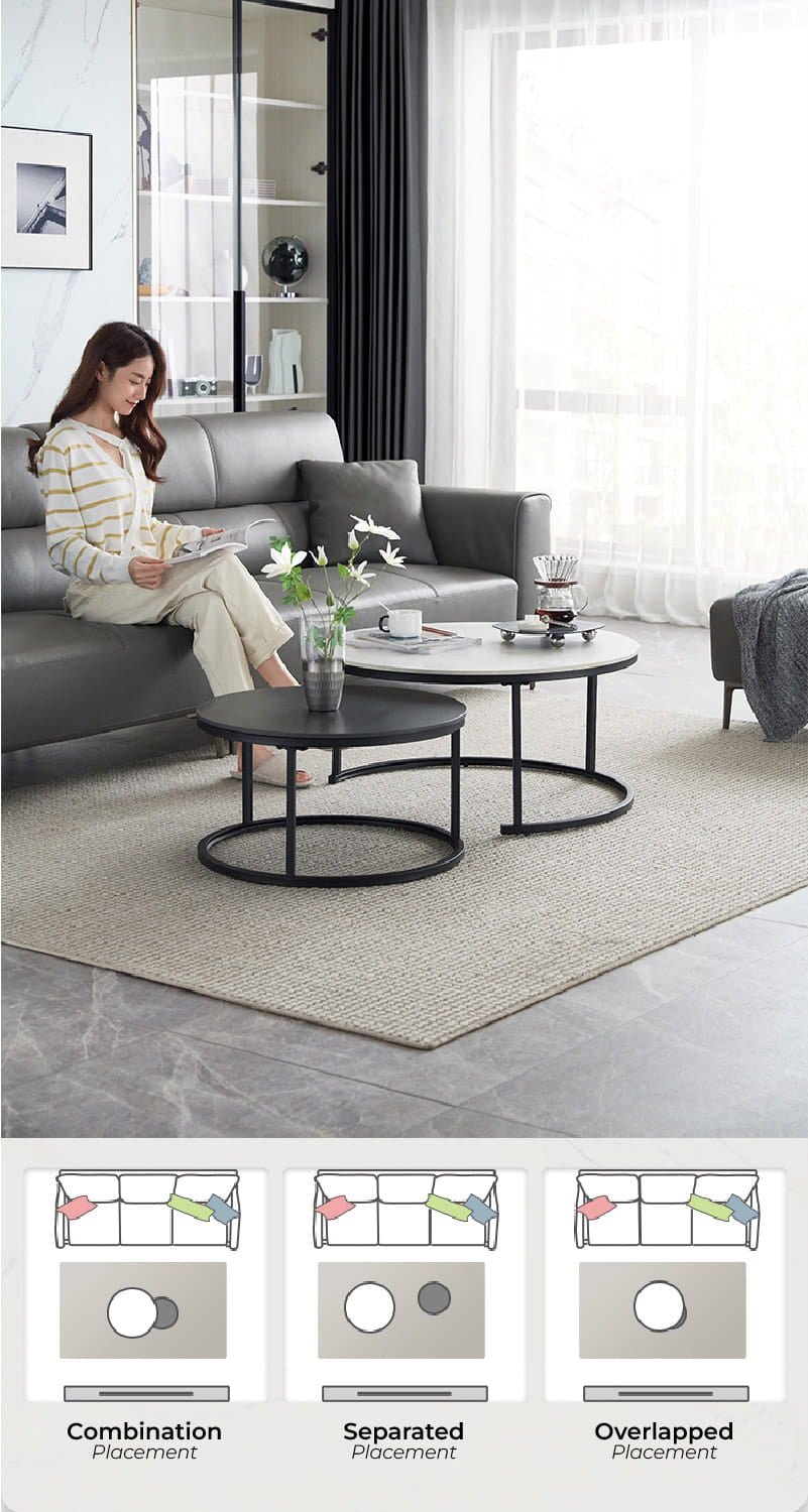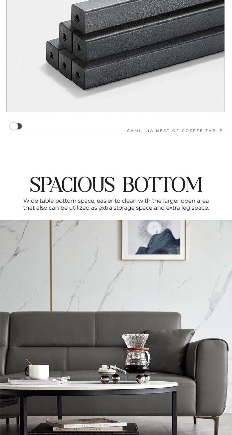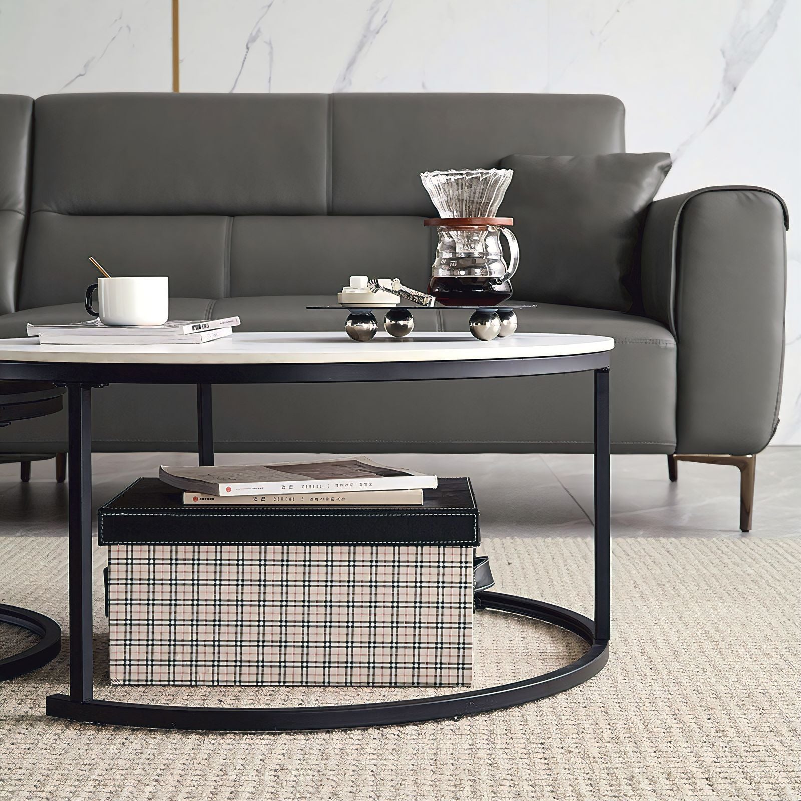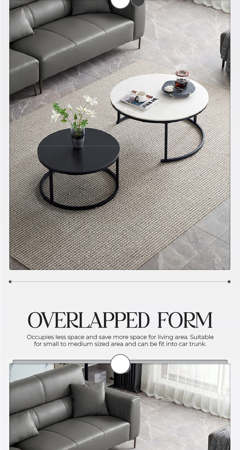 Nested coffee table set brings minimalist elegance and practical design to the forefront. The larger table's sintered stone top, with its marble-like finish, offers a luxurious, scratch-resistant surface, while the smaller, black table fits snugly underneath, its simplicity complementing the sophistication of its counterpart.