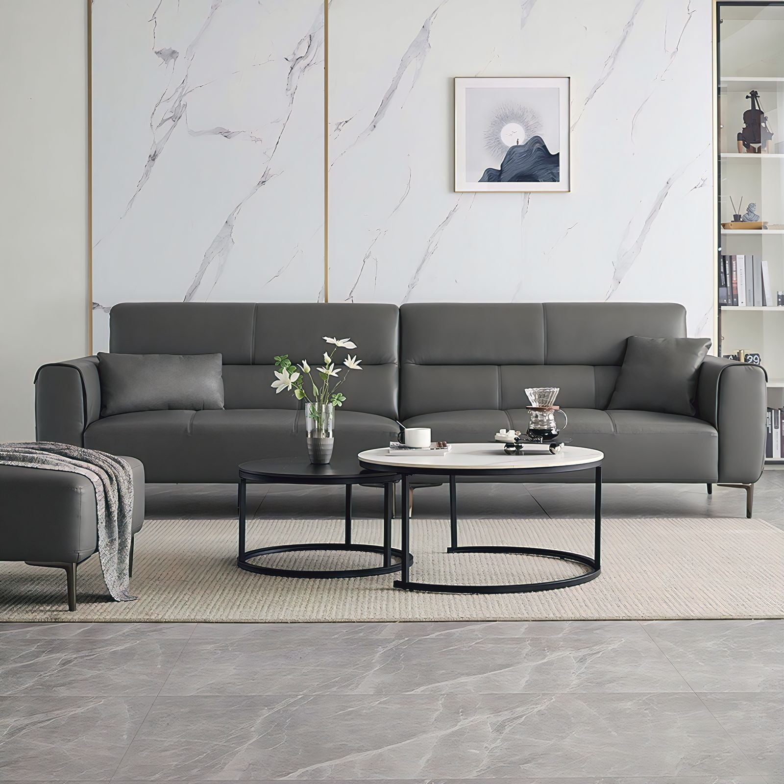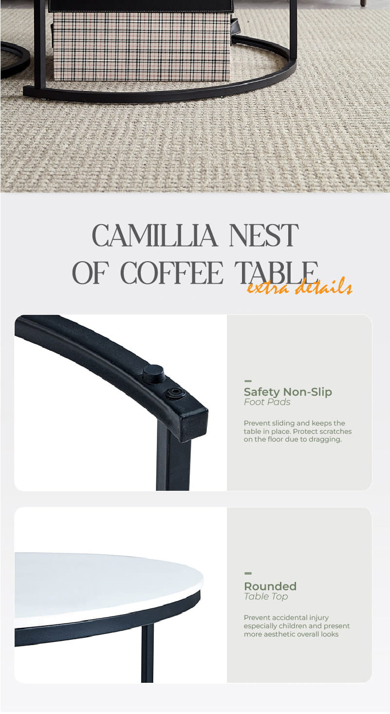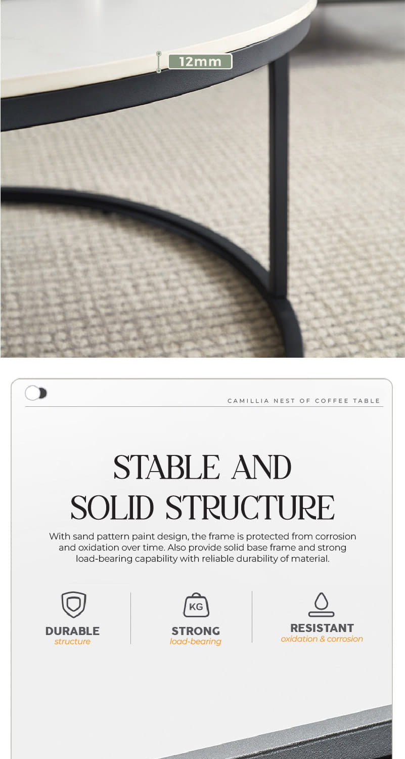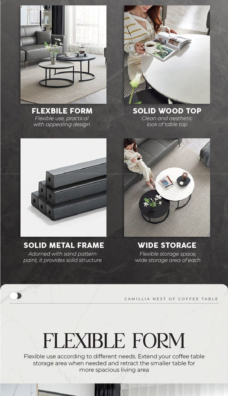 Nested coffee table set brings minimalist elegance and practical design to the forefront. The larger table's sintered stone top, with its marble-like finish, offers a luxurious, scratch-resistant surface, while the smaller, black table fits snugly underneath, its simplicity complementing the sophistication of its counterpart.