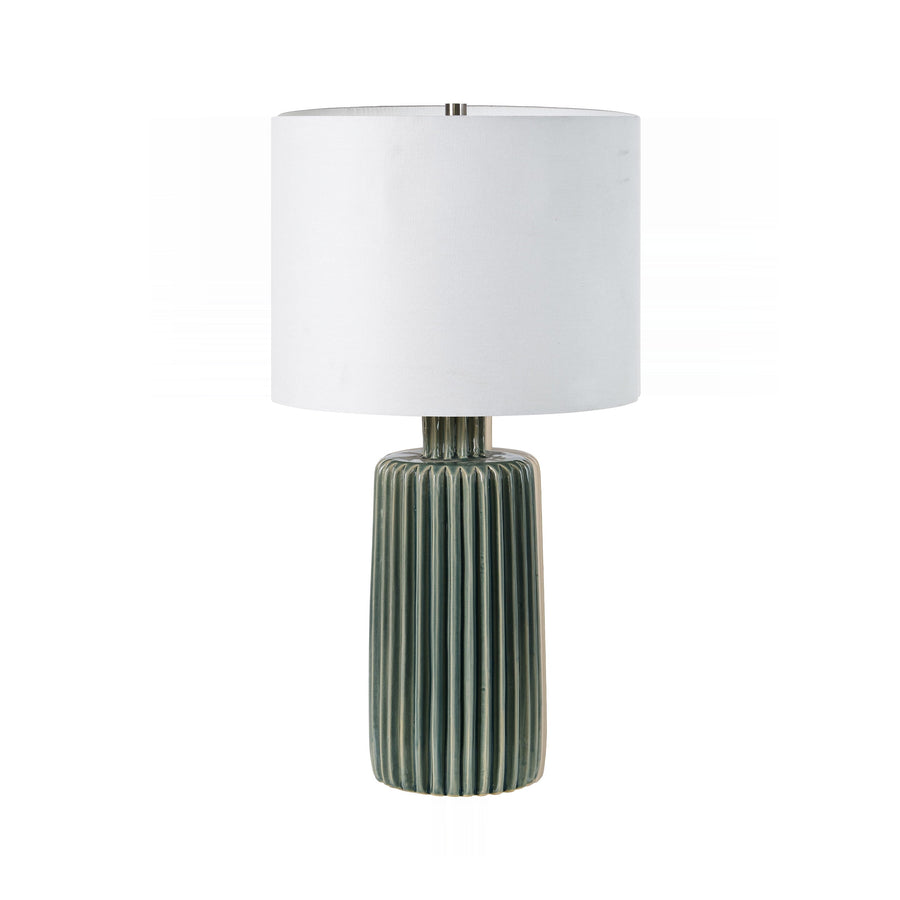 Ceramic base glows with a deep, warm olive glaze, featuring vertical ribbing that captures light and depth. This striking texture anchors the piece, lending sophisticated dimensionality to modern or transitional settings.