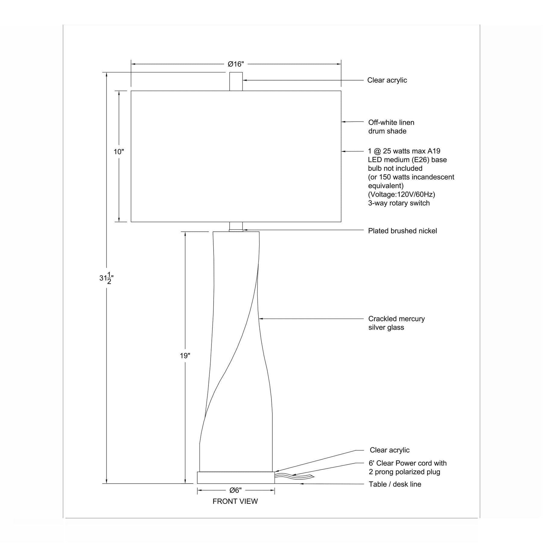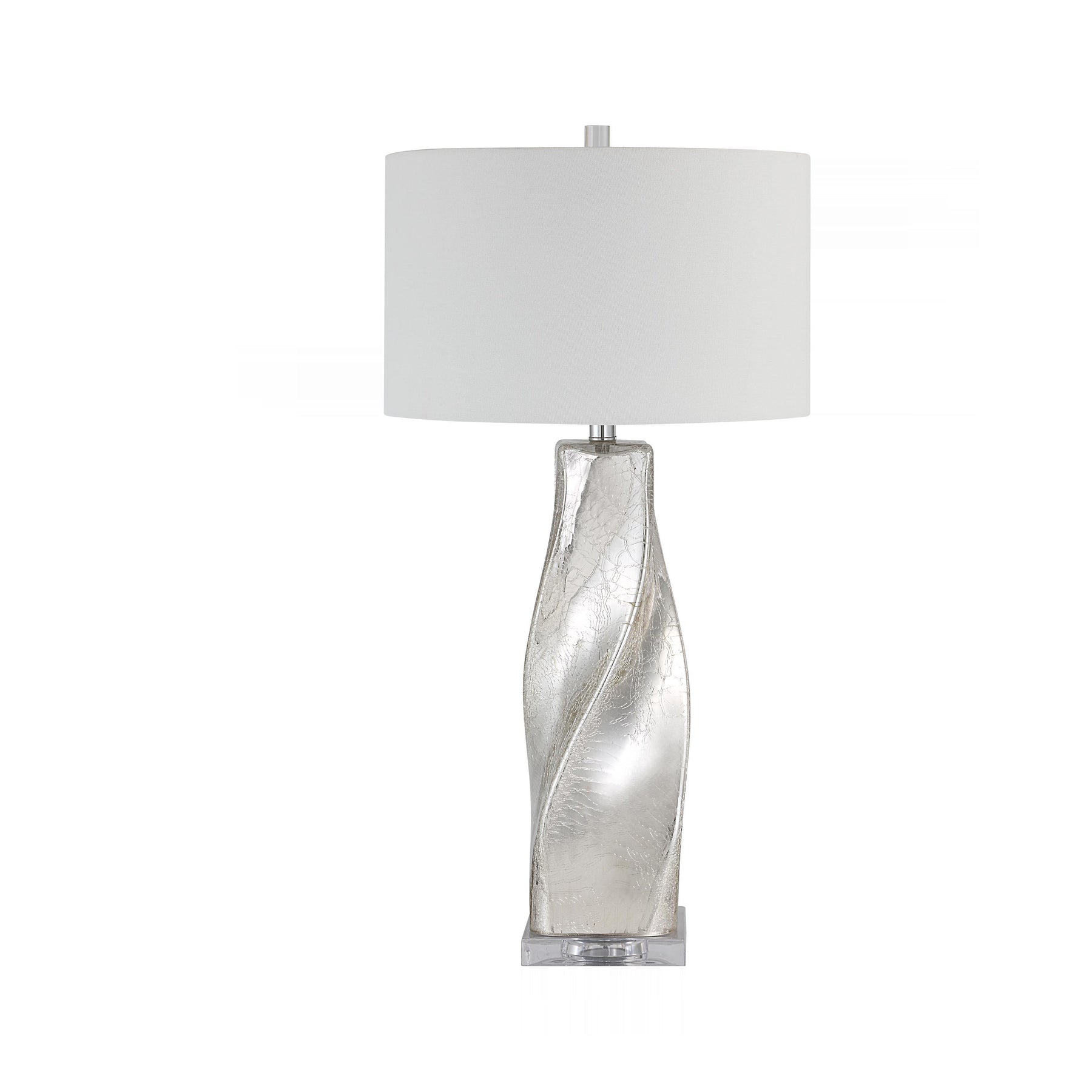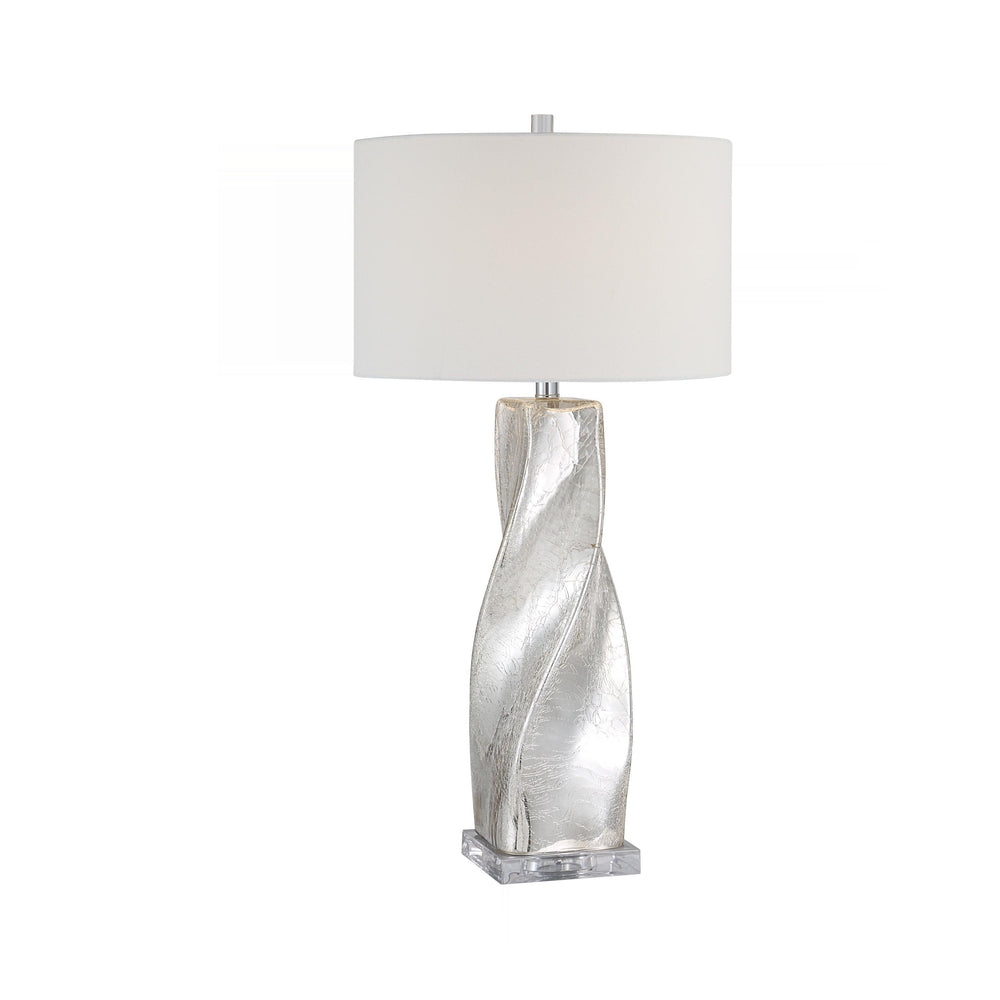 Sculptural glass body features an arresting, fluid twist, showcasing a crackled mercury silver finish that captivates ambient light. Supported by a solid, crystal-clear base, this piece offers dramatic presence and refined illumination for sophisticated interiors.