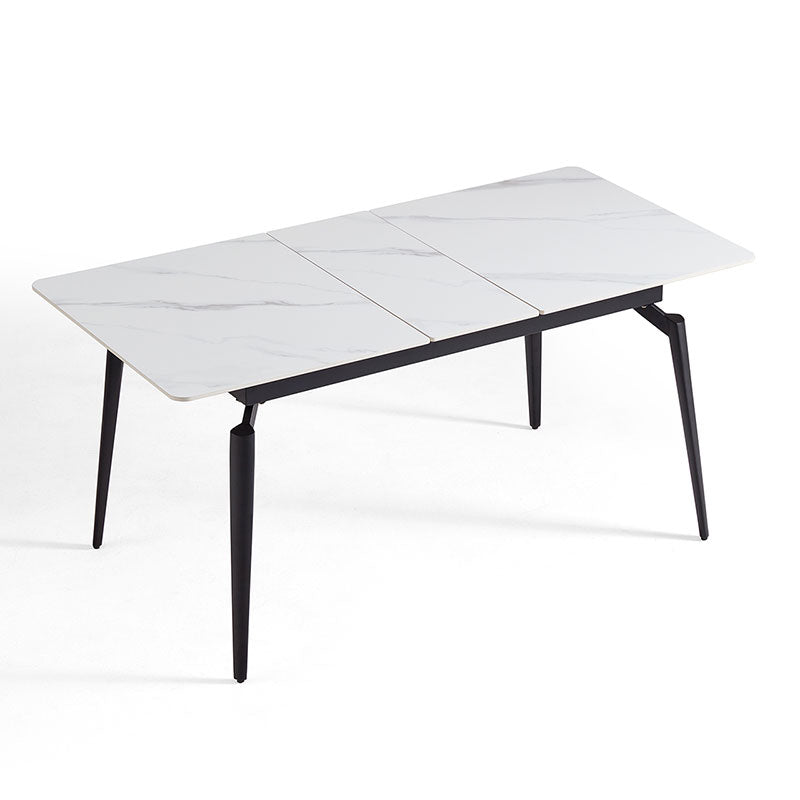 This modern extendable dining table is designed to bring both style and functionality to your home. Featuring a sleek, marble-inspired stone top, it offers a luxurious surface that's durable and easy to clean. The extendable design makes it perfect for hosting larger gatherings while maintaining a minimalist look for everyday use. Its sturdy metal legs ensure stability, adding to the contemporary feel.