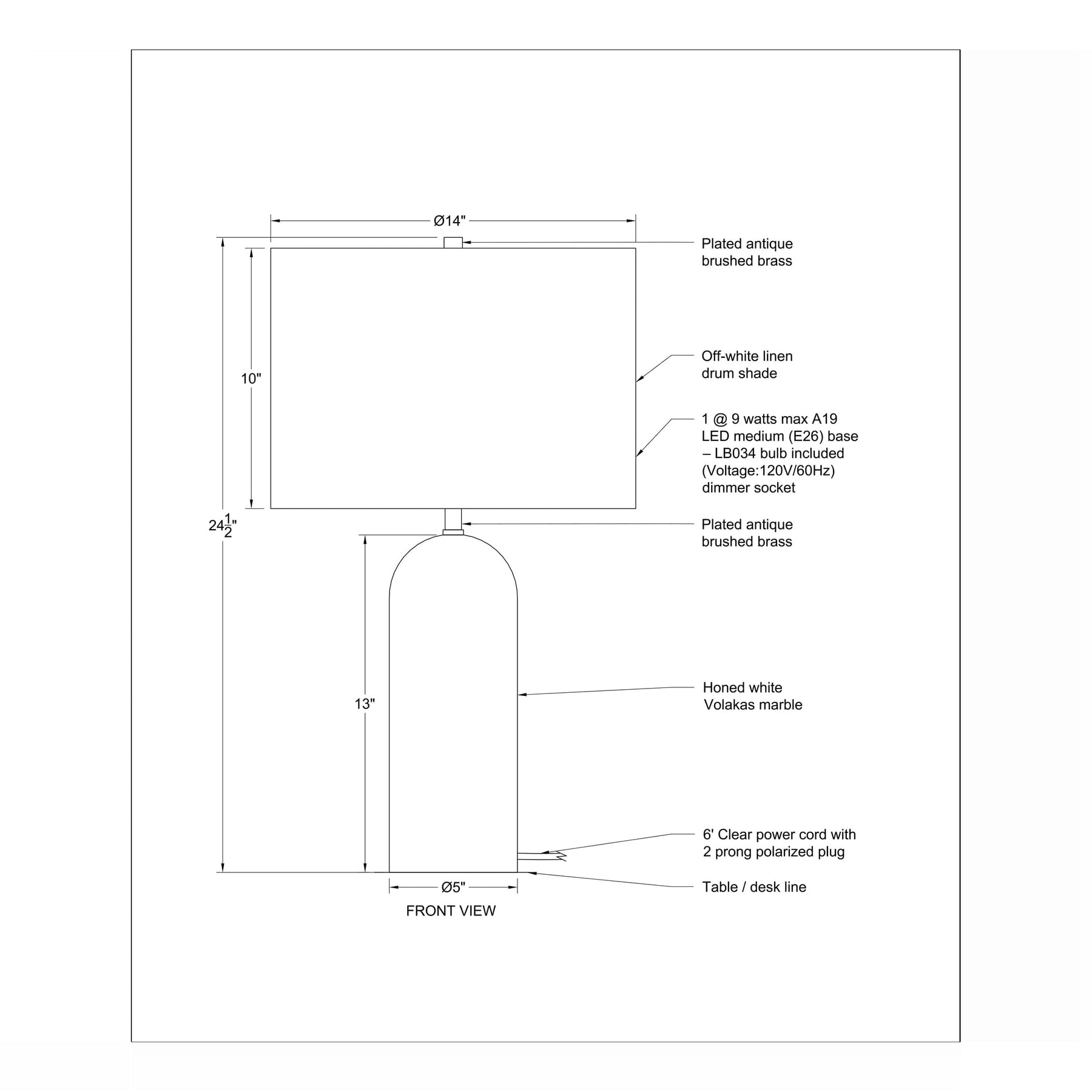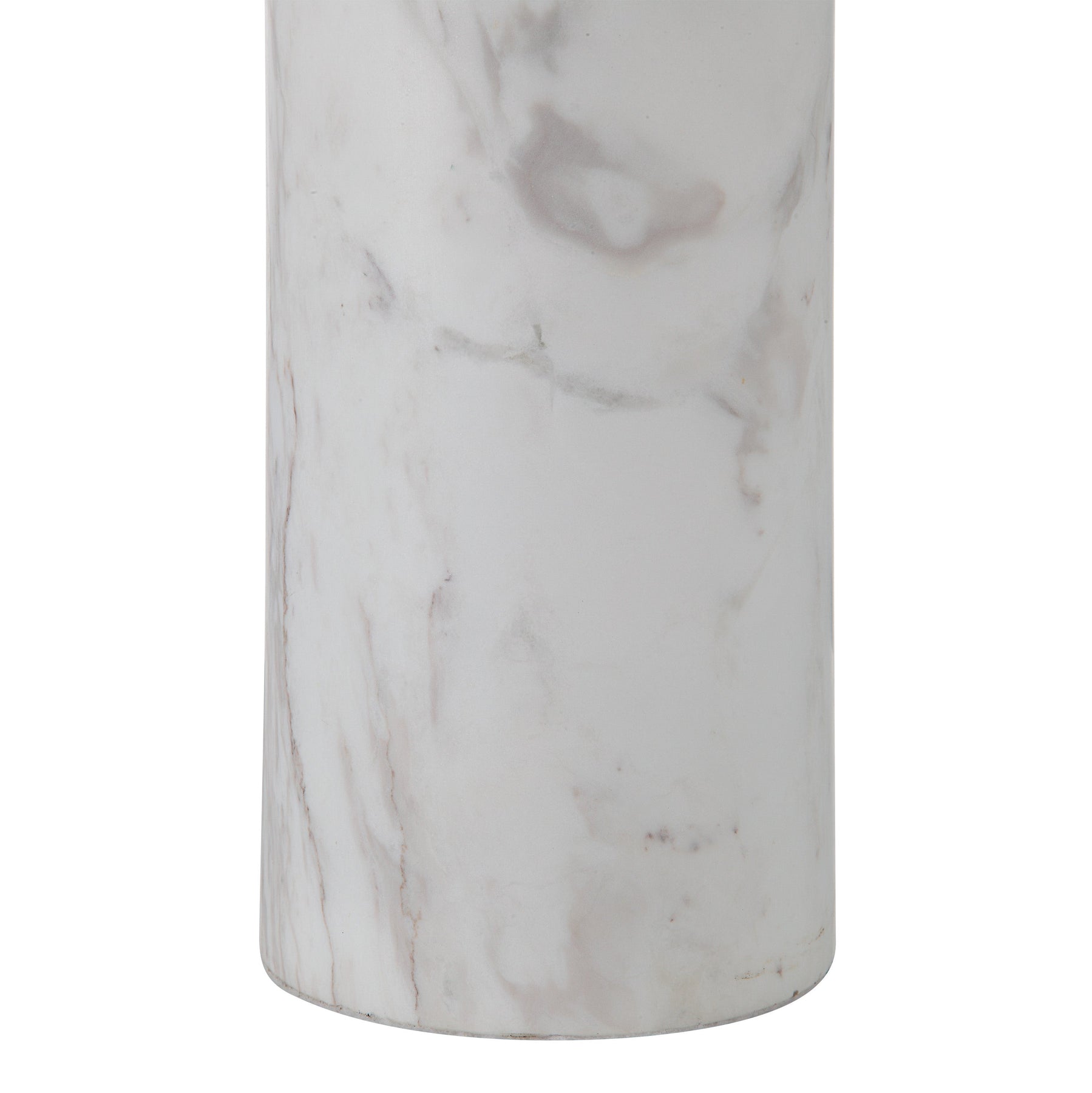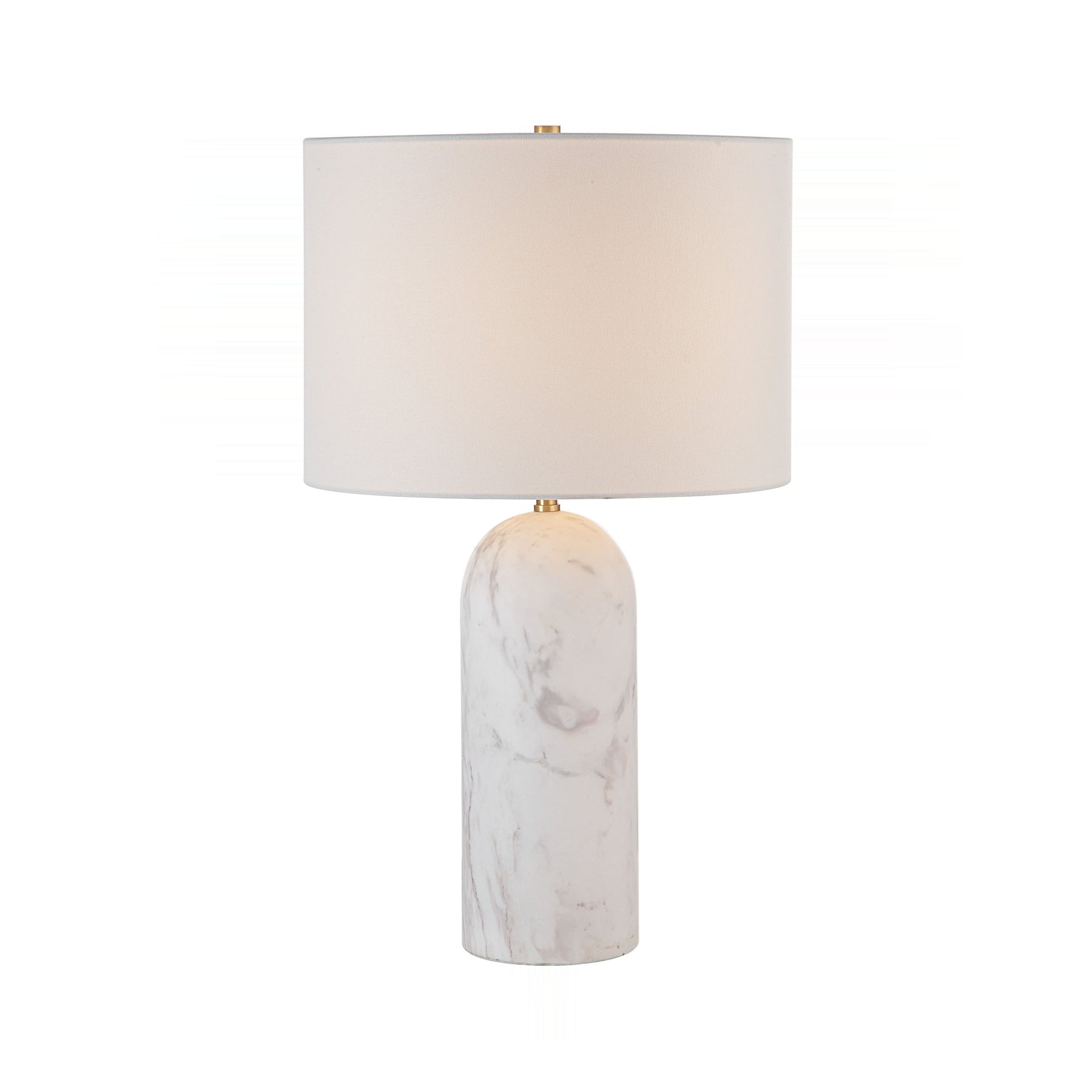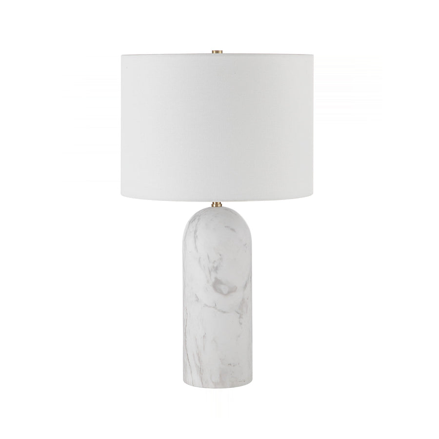 Solid cylindrical marble anchors this substantial table lamp, presenting cool, veined texture against a clean, architectural silhouette. The robust form supports a classic drum shade crafted from textured off-white linen for soft, diffused illumination.
