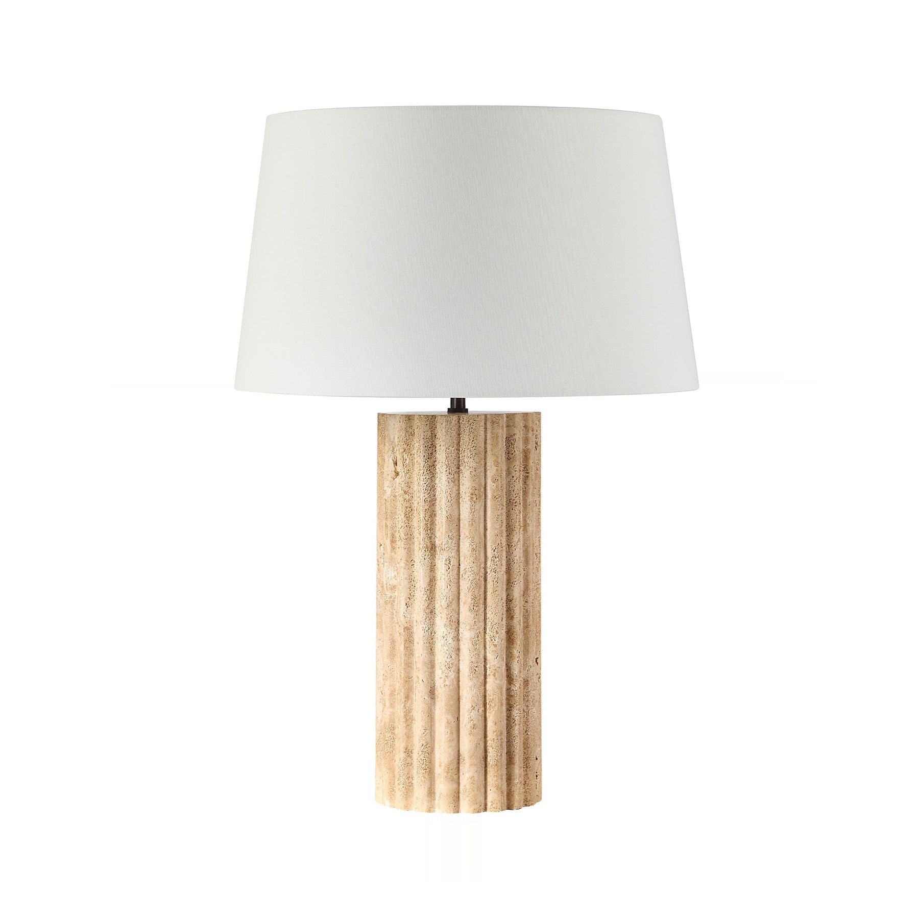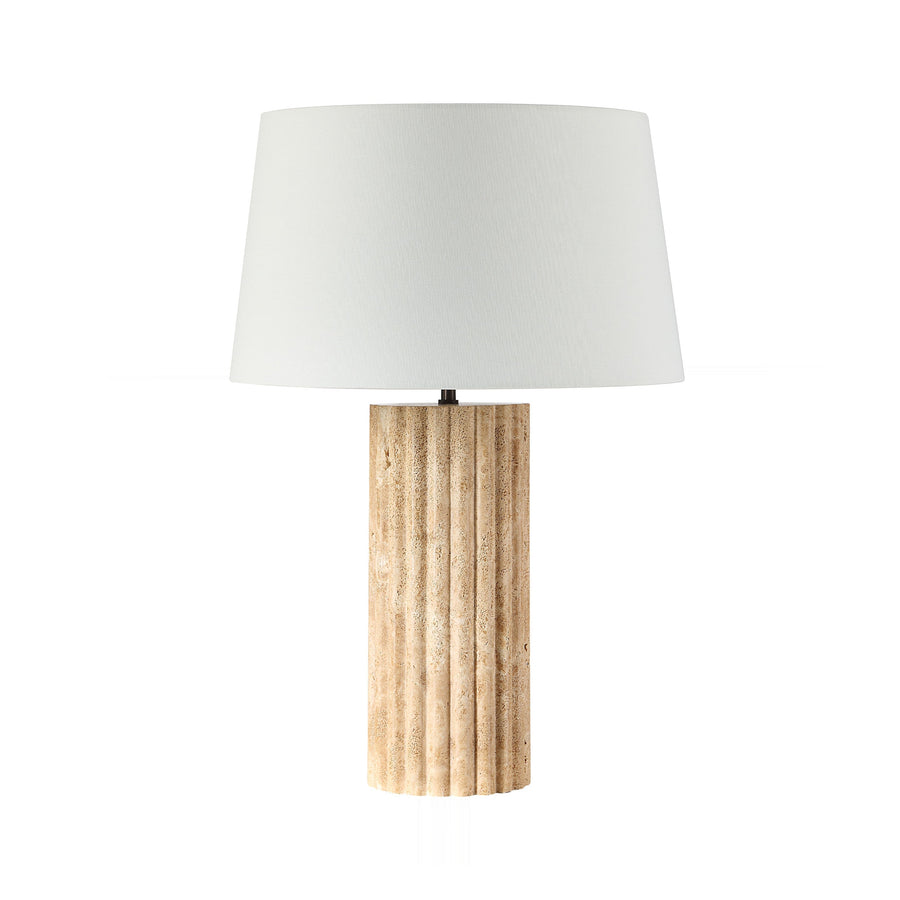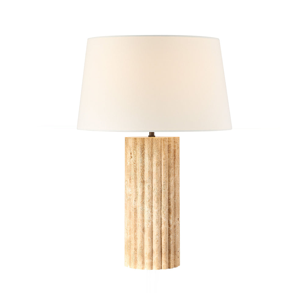 Sculpted travertine base showcases the stone's raw texture and unique geological patterns, grounding the silhouette with organic weight and visual interest. The cylindrical, reeded form offers a substantial yet refined architectural anchor for any curated surface.