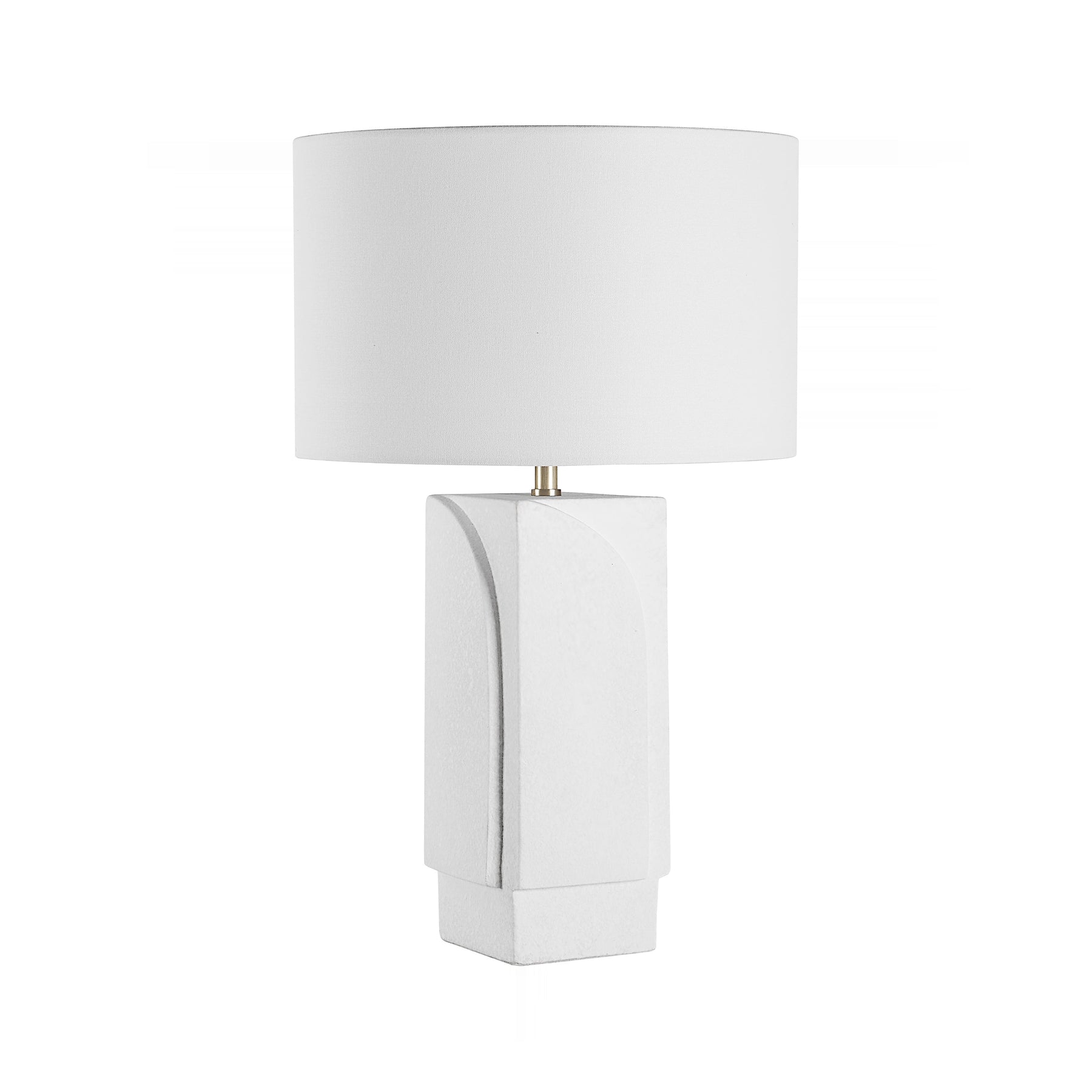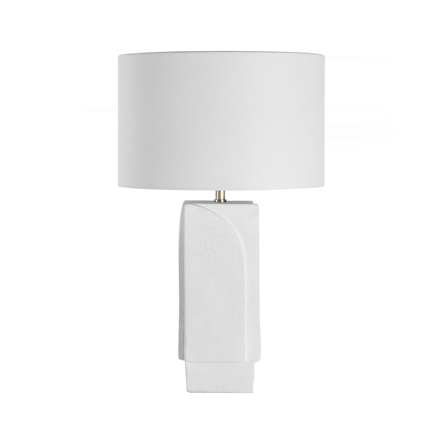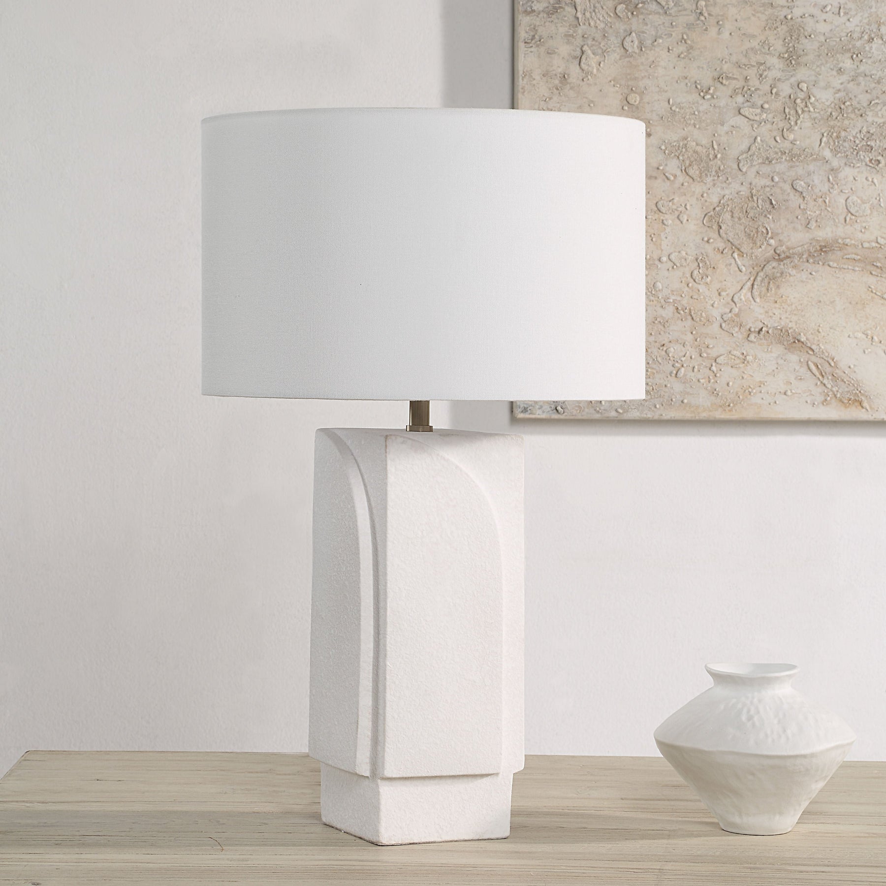 Sculptural ceramic base presents a compelling, tactile presence, defined by a matte off-white finish mimicking natural, rough-hewn stone. Arren Williams crafts modern artistry through clean geometric lines contrasted by subtle, curved articulation on the vertical form.