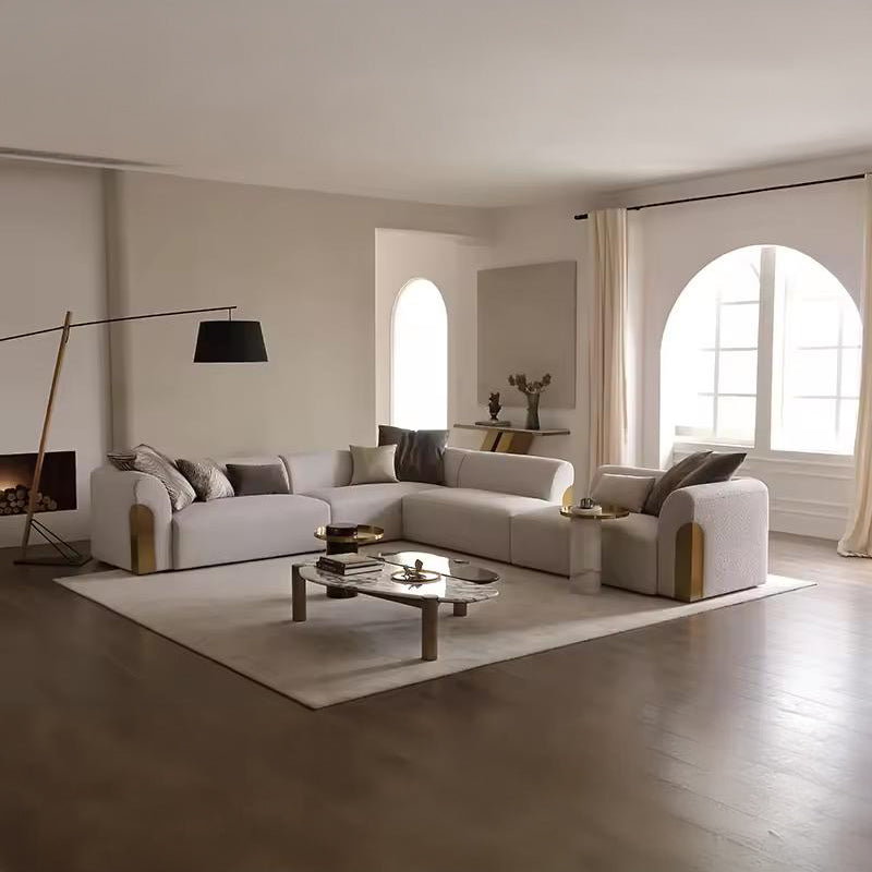 This sectional is enhanced with elegant golden accents, adding a touch of sophistication and modern flair. These metallic details not only enhance the aesthetic appeal but also ensure the sofa stands out as a centerpiece in any contemporary or modern interior. It's more than just a piece of furniture—it's a statement of taste and luxury.
