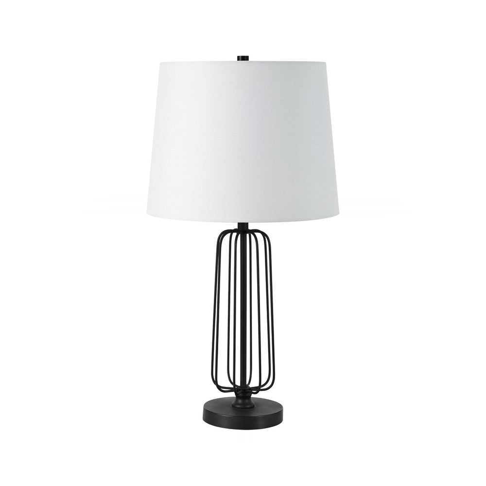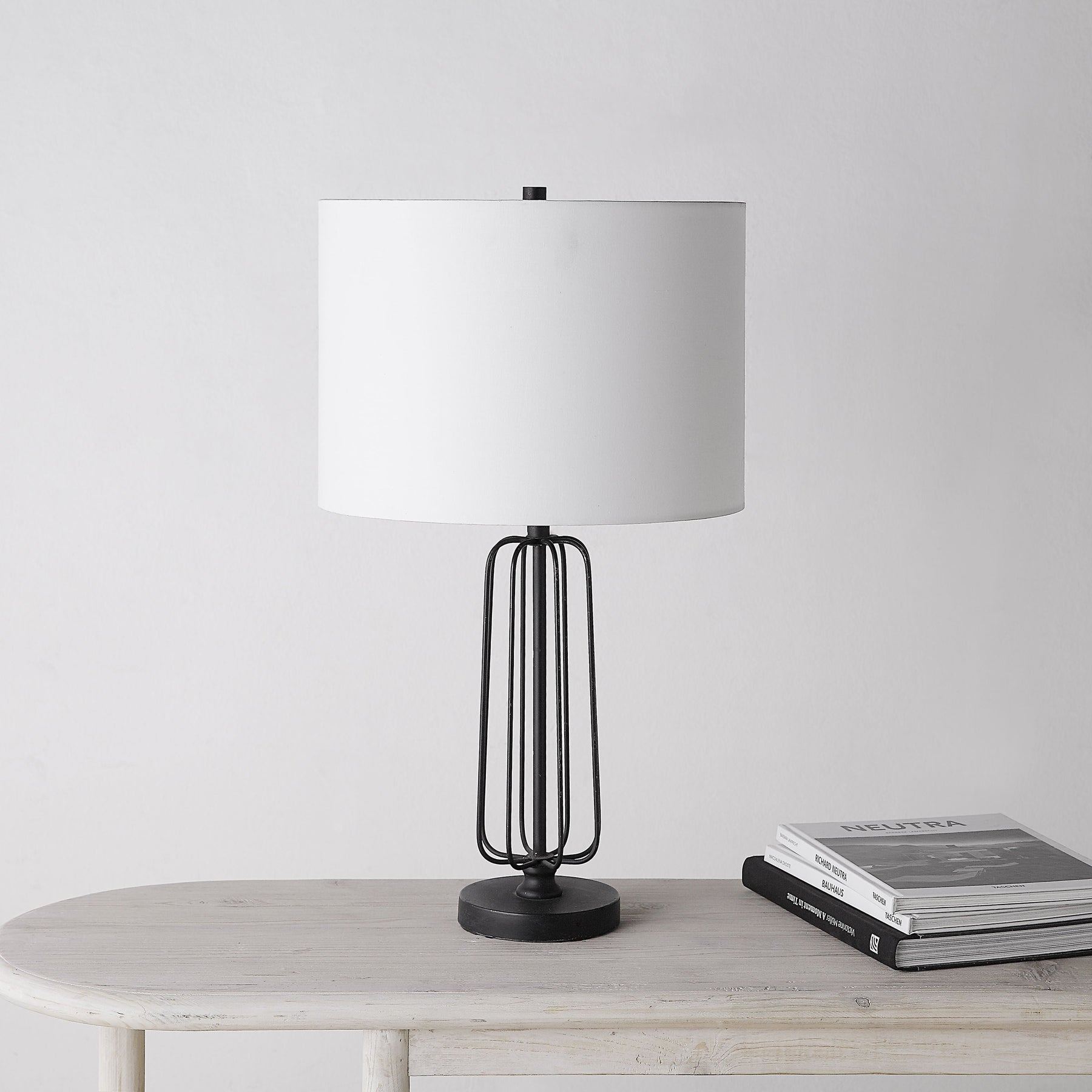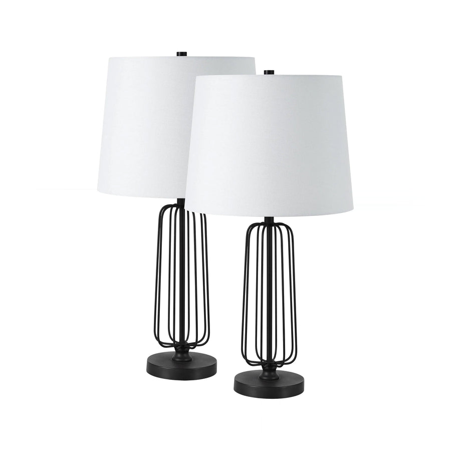 Open, matte black metalwork forms a dramatic, caged silhouette, anchoring the crisp, white fabric drum shade with industrial elegance. This pair elevates any setting, casting captivating shadows that play across surfaces while ensuring balanced ambient illumination.