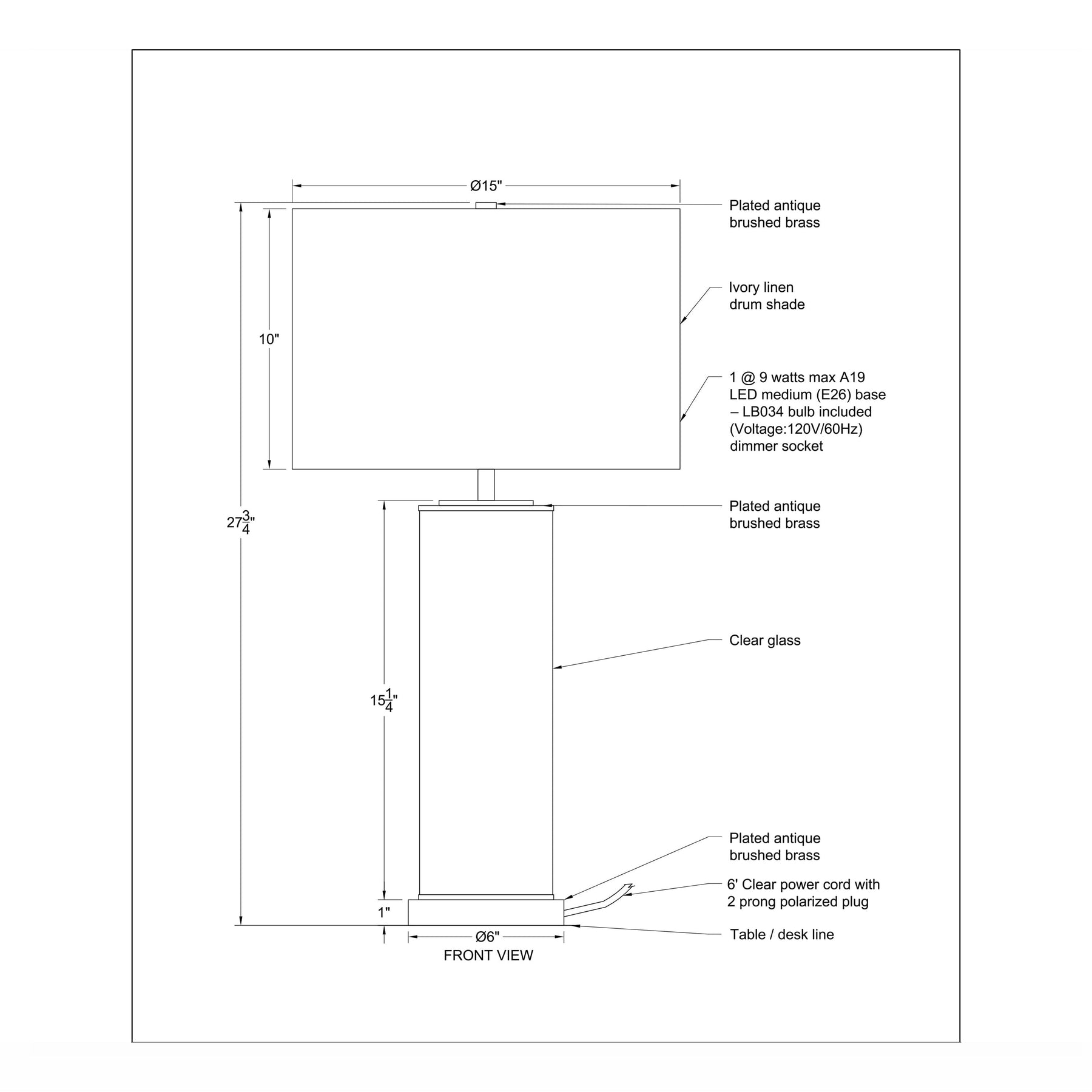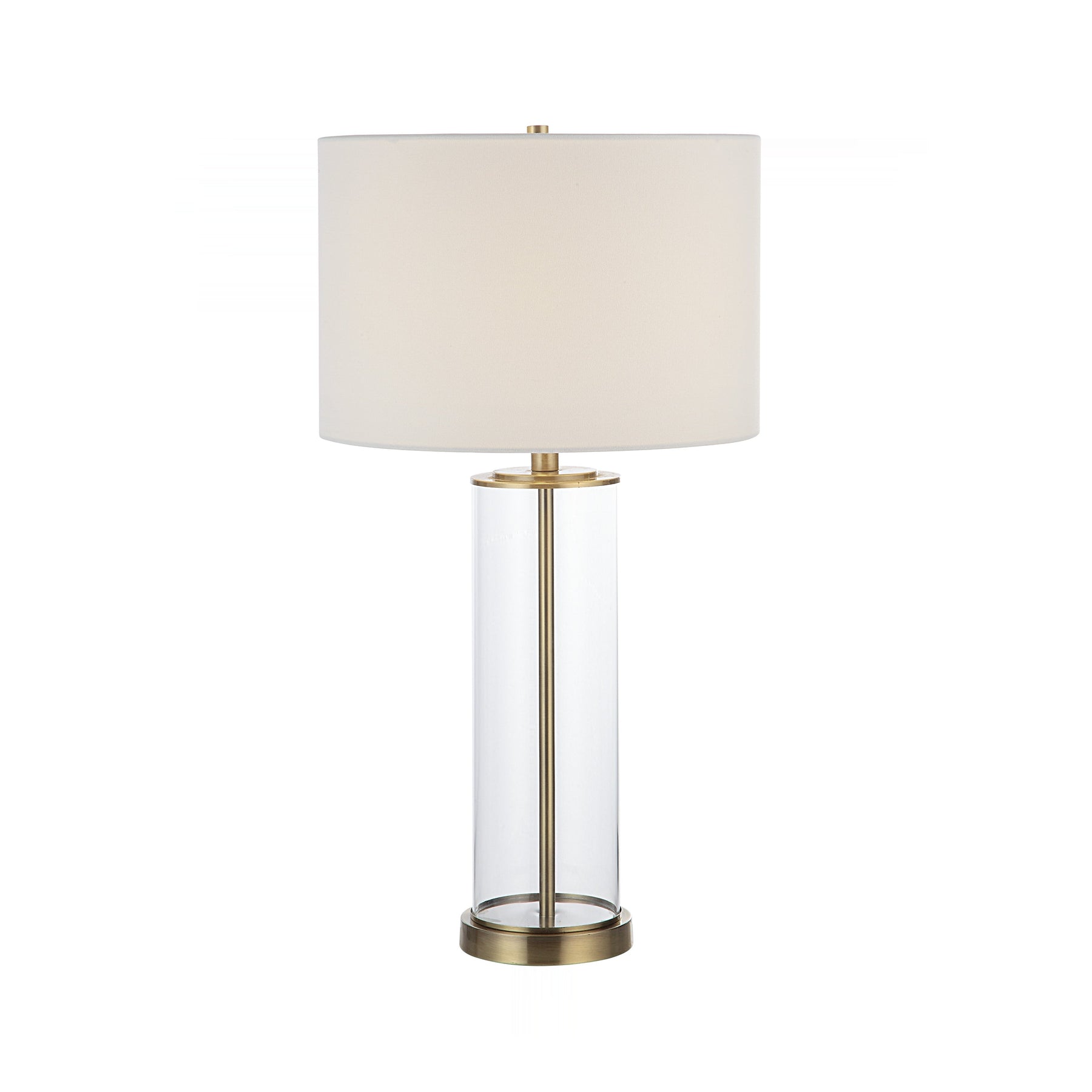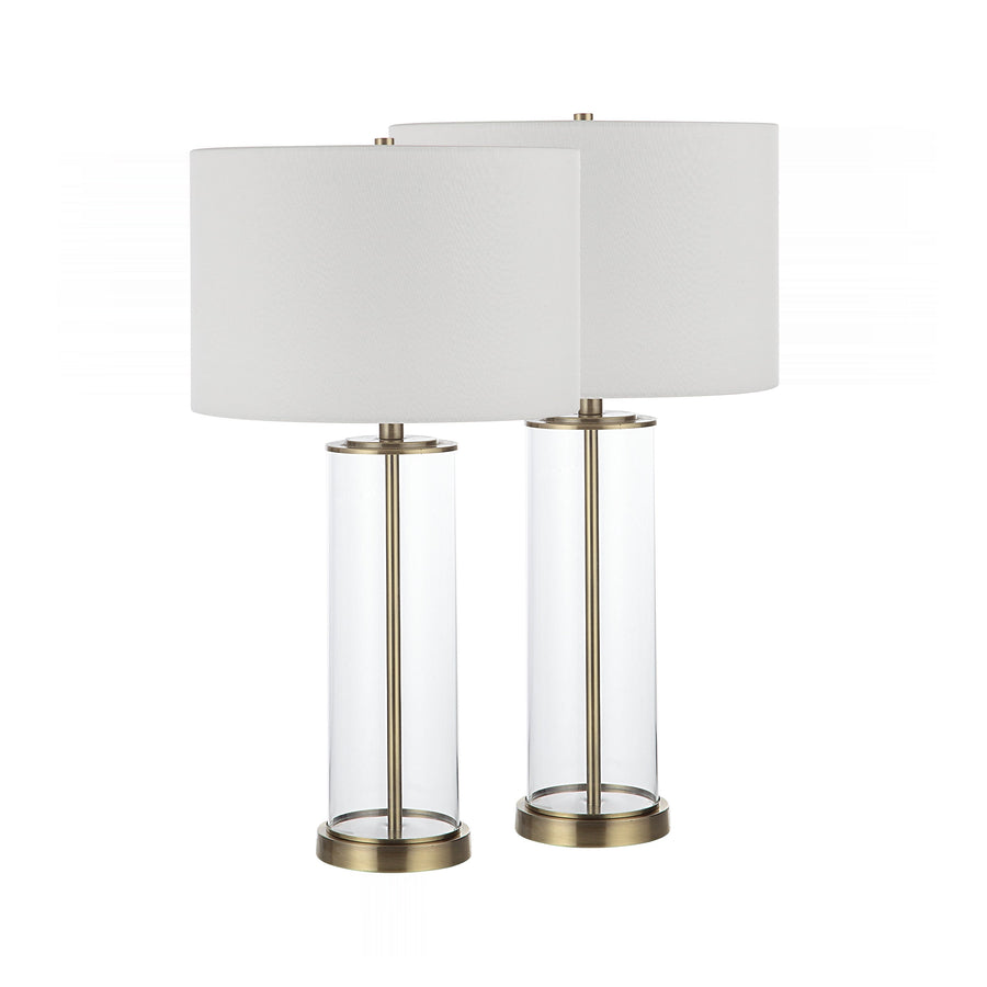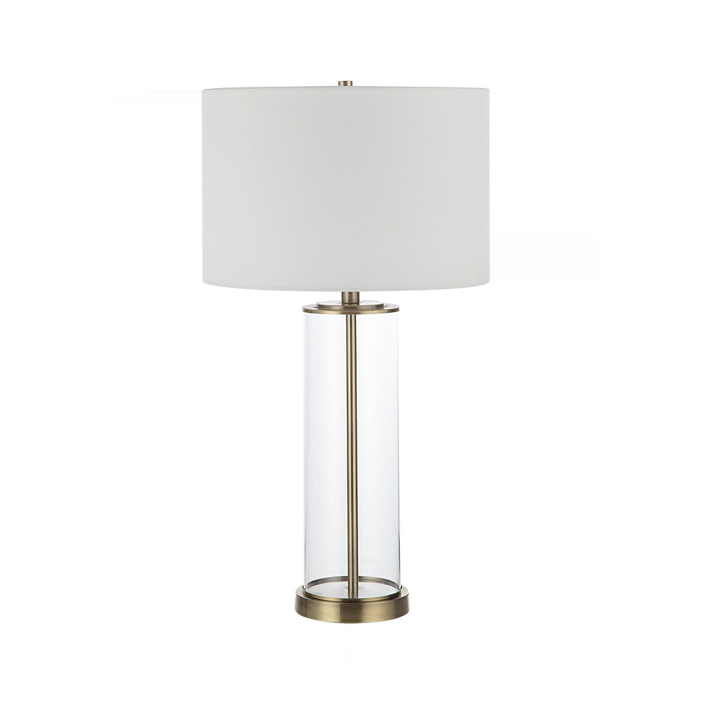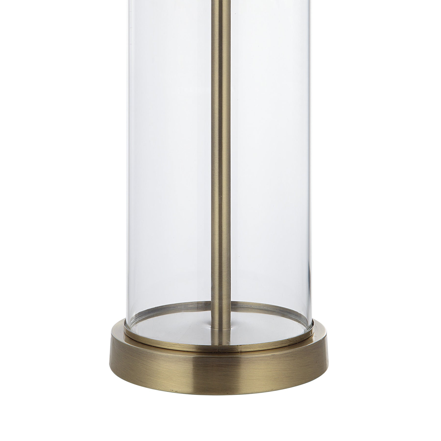Cylindrical clear glass columns anchor this 28-inch lamp, showcasing an elegant satin brass core and hardware that introduces warm metallic depth. The structure balances airy transparency with substantial presence, elevating contemporary or transitional interiors.