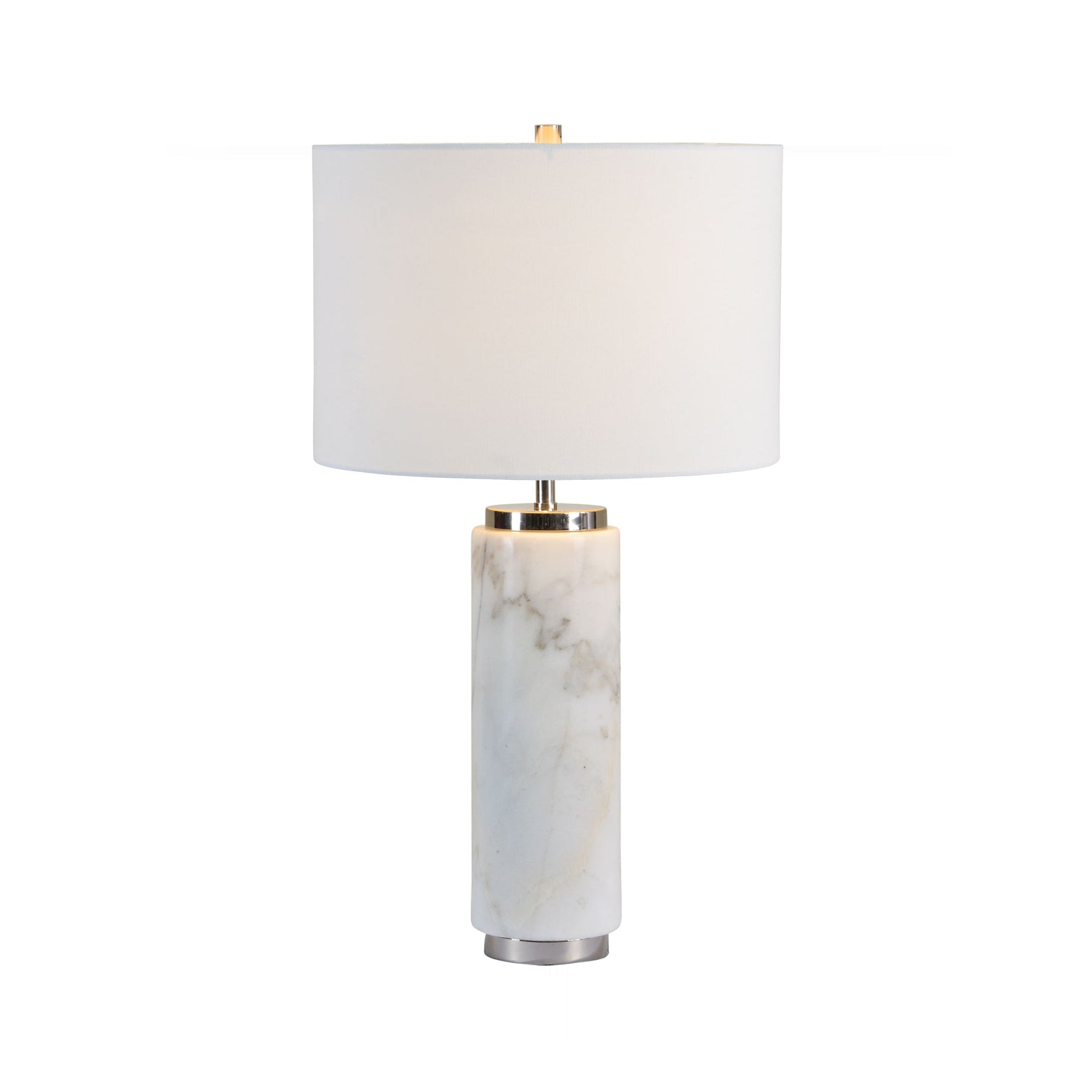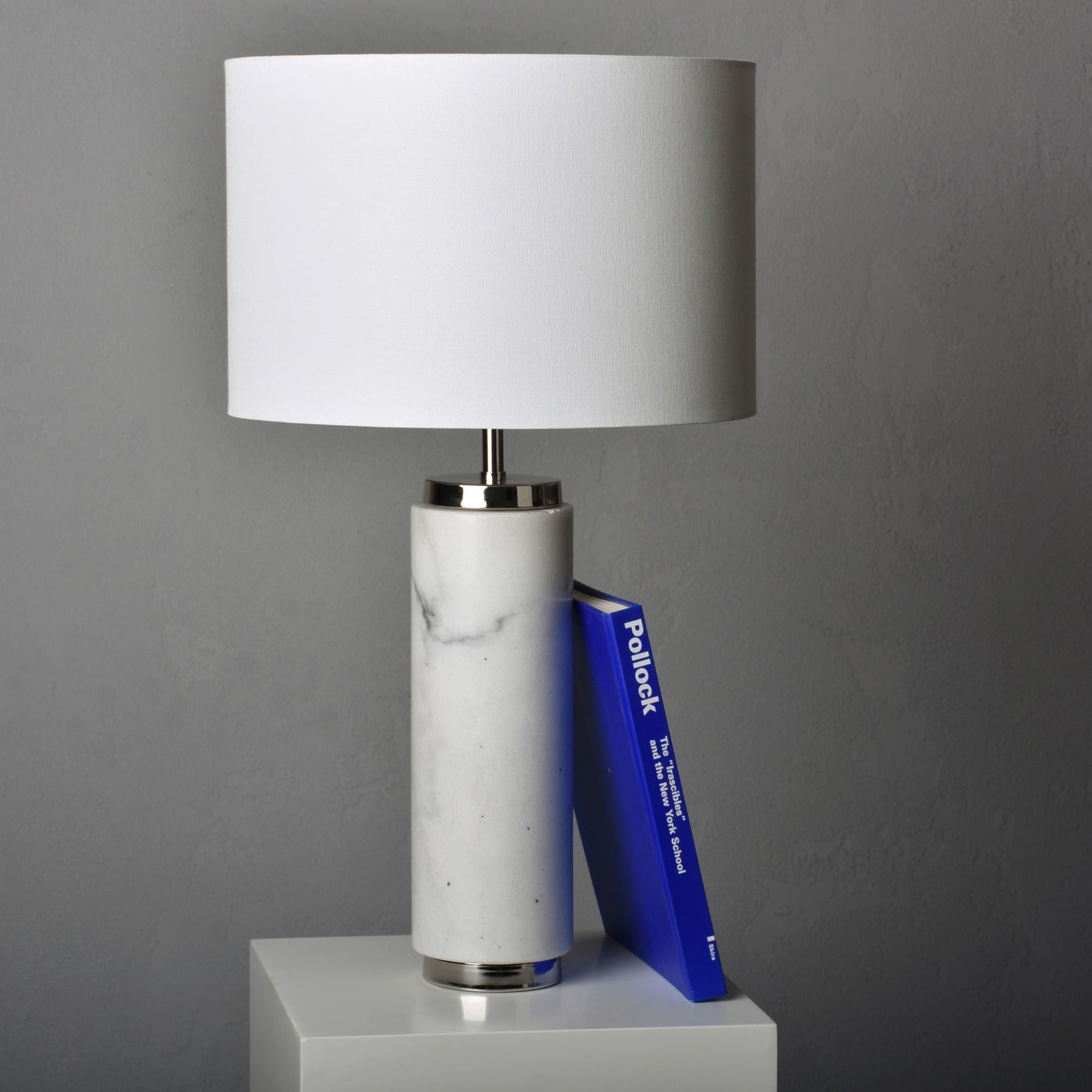 Solid cylindrical marble anchors this striking table lamp, showcasing rich, natural veining against polished, gleaming metal accents. The substantial form offers grounded elegance, perfect for commanding focal points on dressers or sideboards.