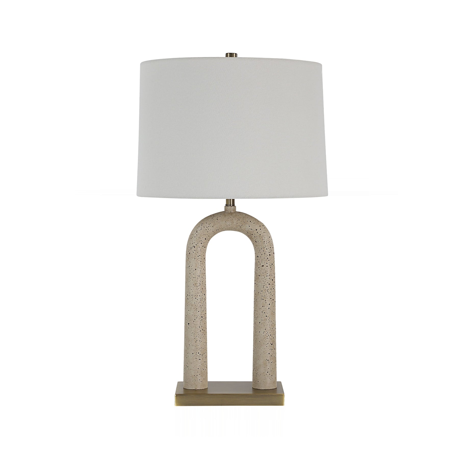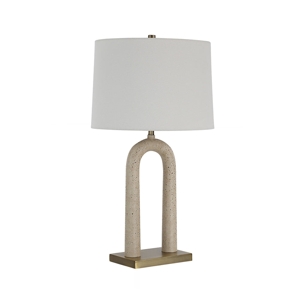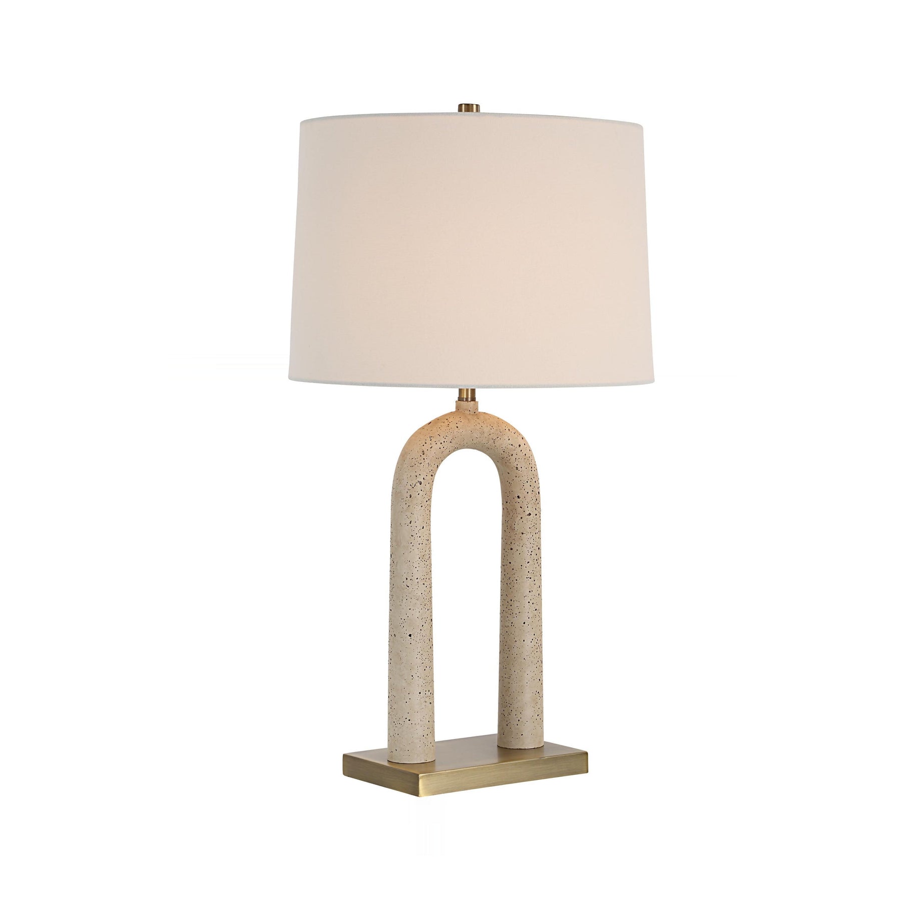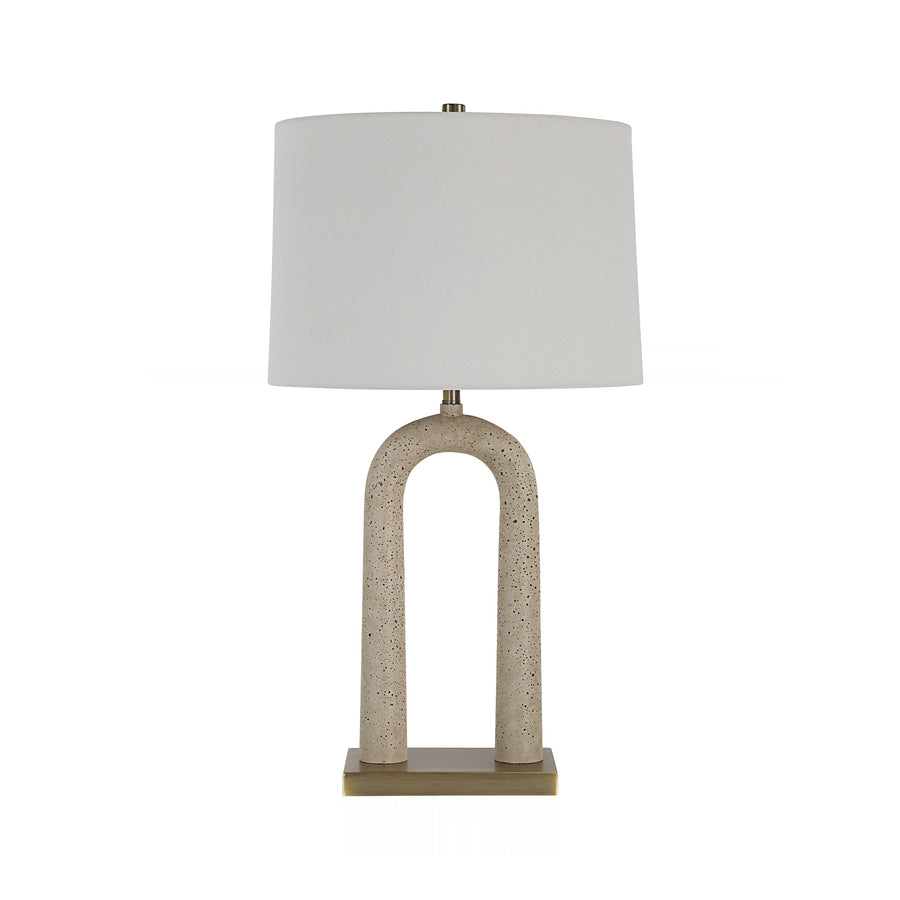 Sculptural curves define this statement lamp, featuring an arched body finished in tactile, speckled faux travertine. The organic form rests upon a sleek, antique brass-plated plinth, lending refined contrast to the earthy texture.