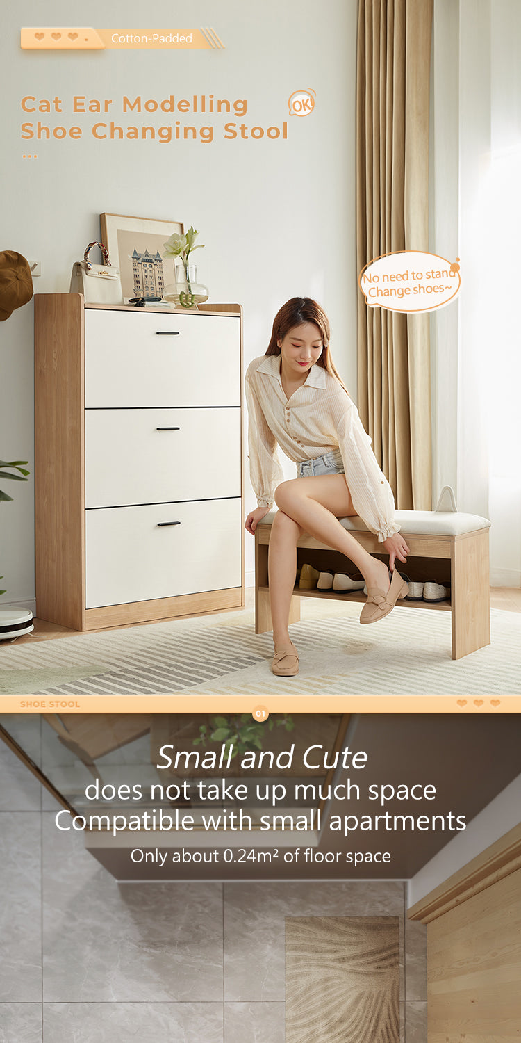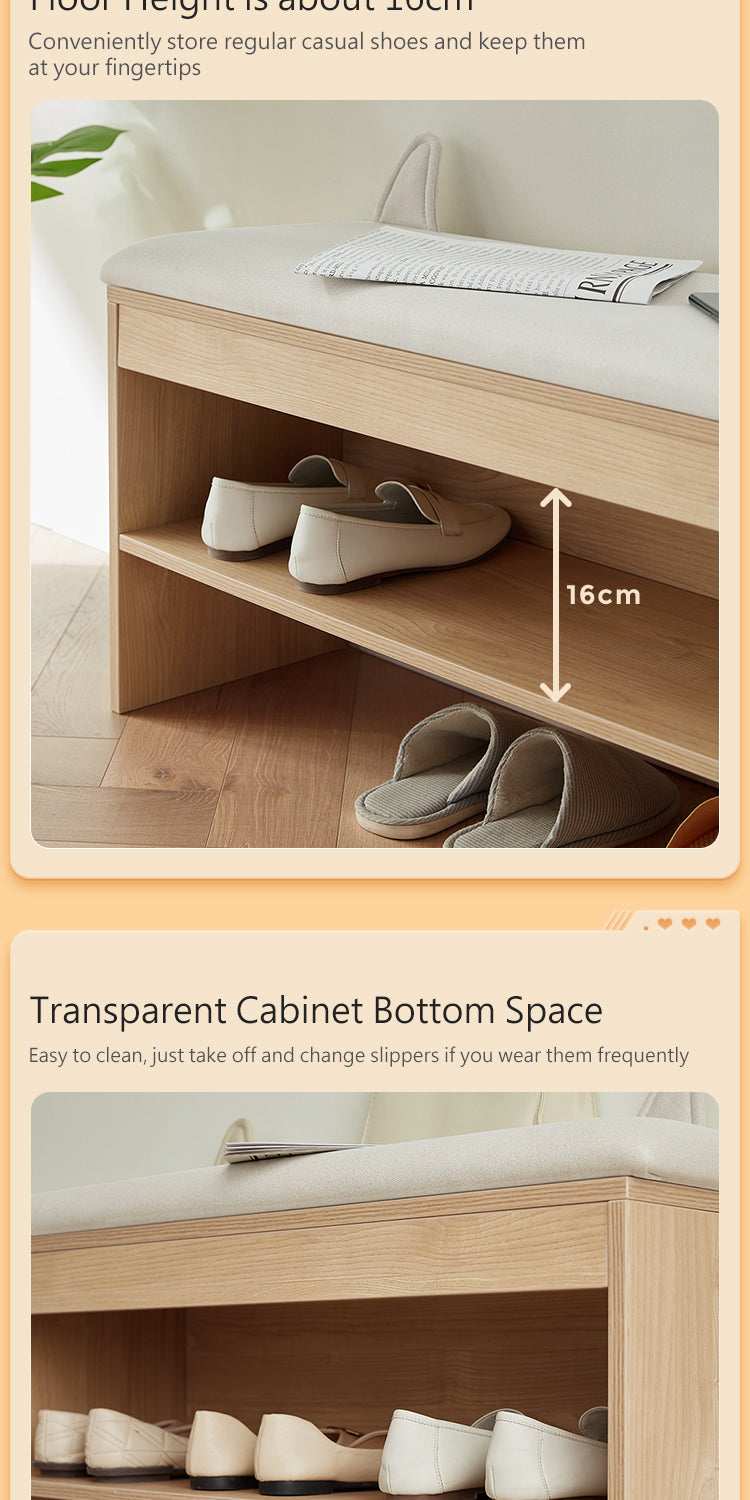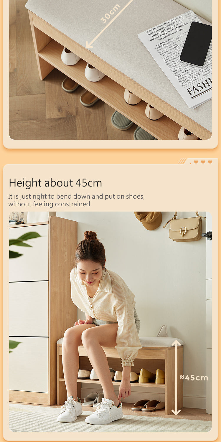 Experience the perfect fusion of functionality and style with this compact wooden shoe cabinet, a versatile solution for footwear organization. Its space-saving design efficiently manages your shoes while adding a refined touch to your decor. This exceptional shoe cabinet elevates your home ambiance with elegance, making it an ideal addition to any entryway or living area. The soft, sponge-filled cushions provide comfortable seating while attending to your footwear needs, while the hidden storage underneath offers ample room for shoes and accessories, enhancing both practicality and aesthetic appeal simultaneously.