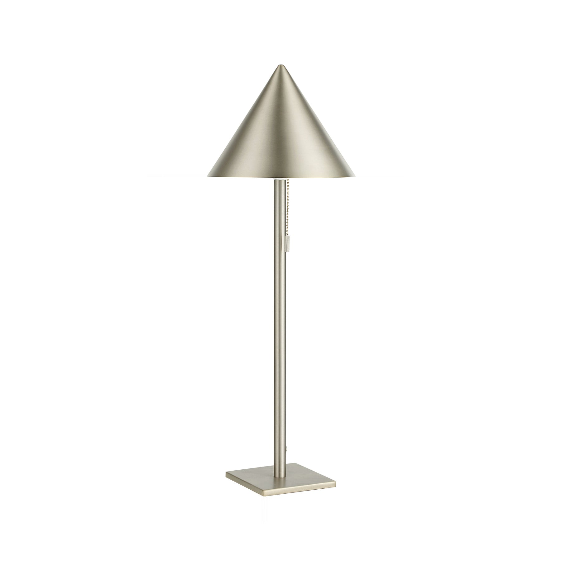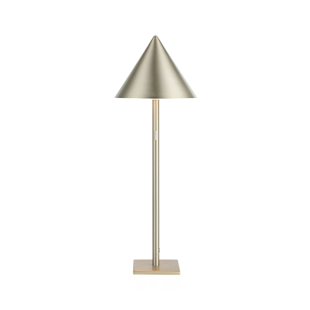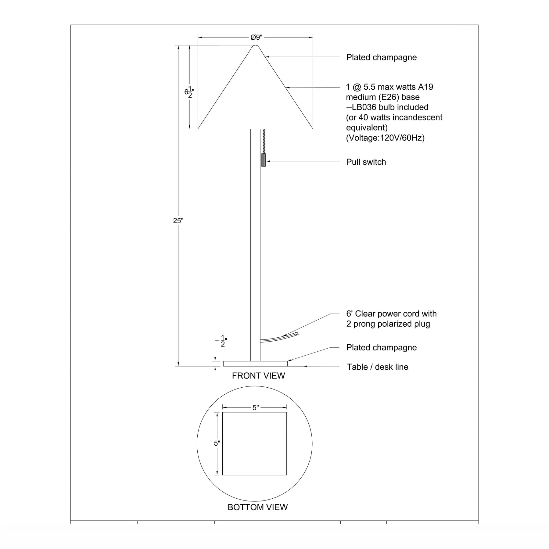 Striking champagne-plated metal construction defines this lamp's sophisticated silhouette, blending streamlined modernity with timeless classicism. The commanding cone shade projects focused, downward illumination, establishing a refined focal point in any curated space.