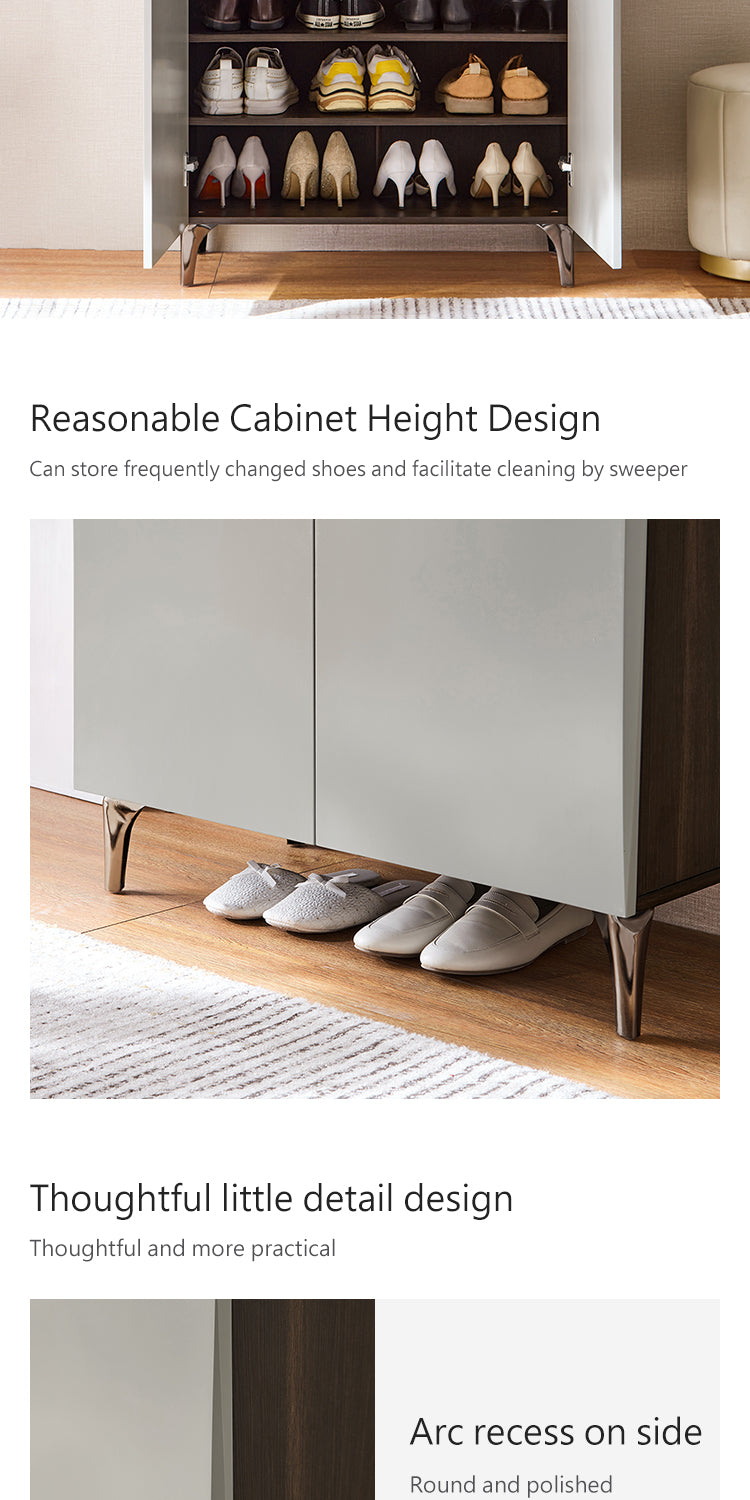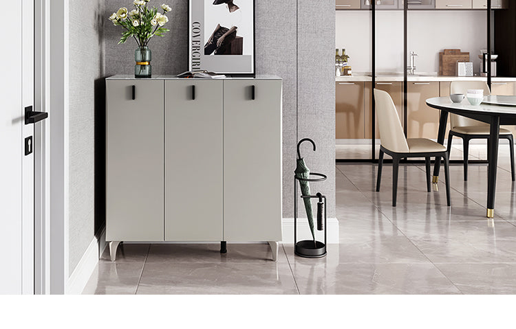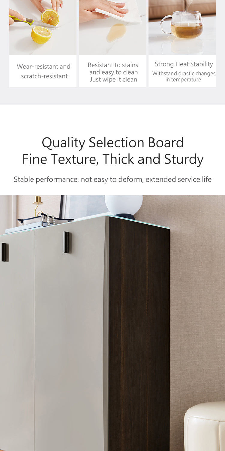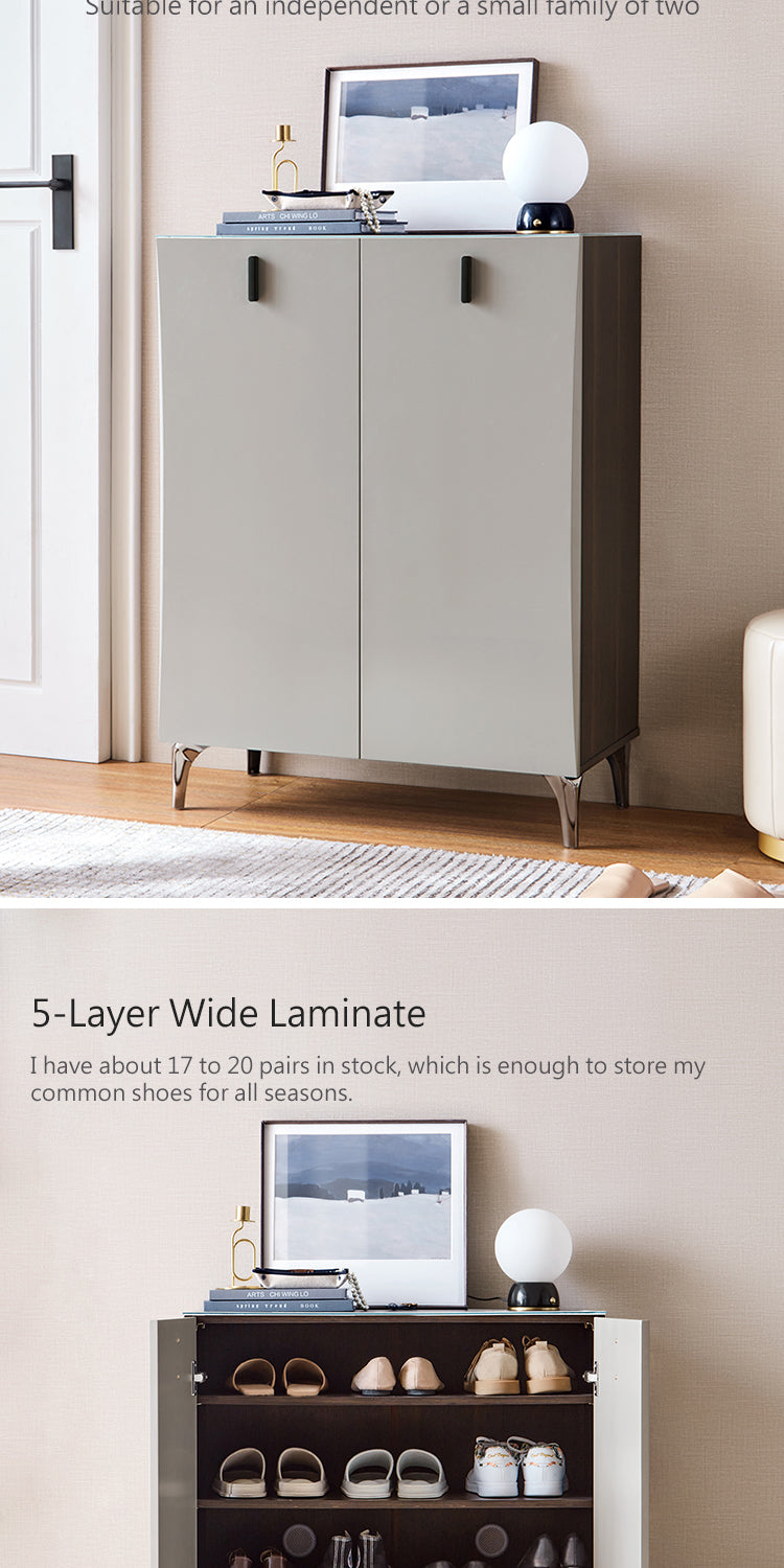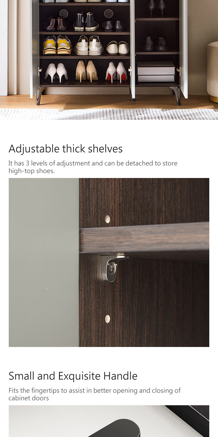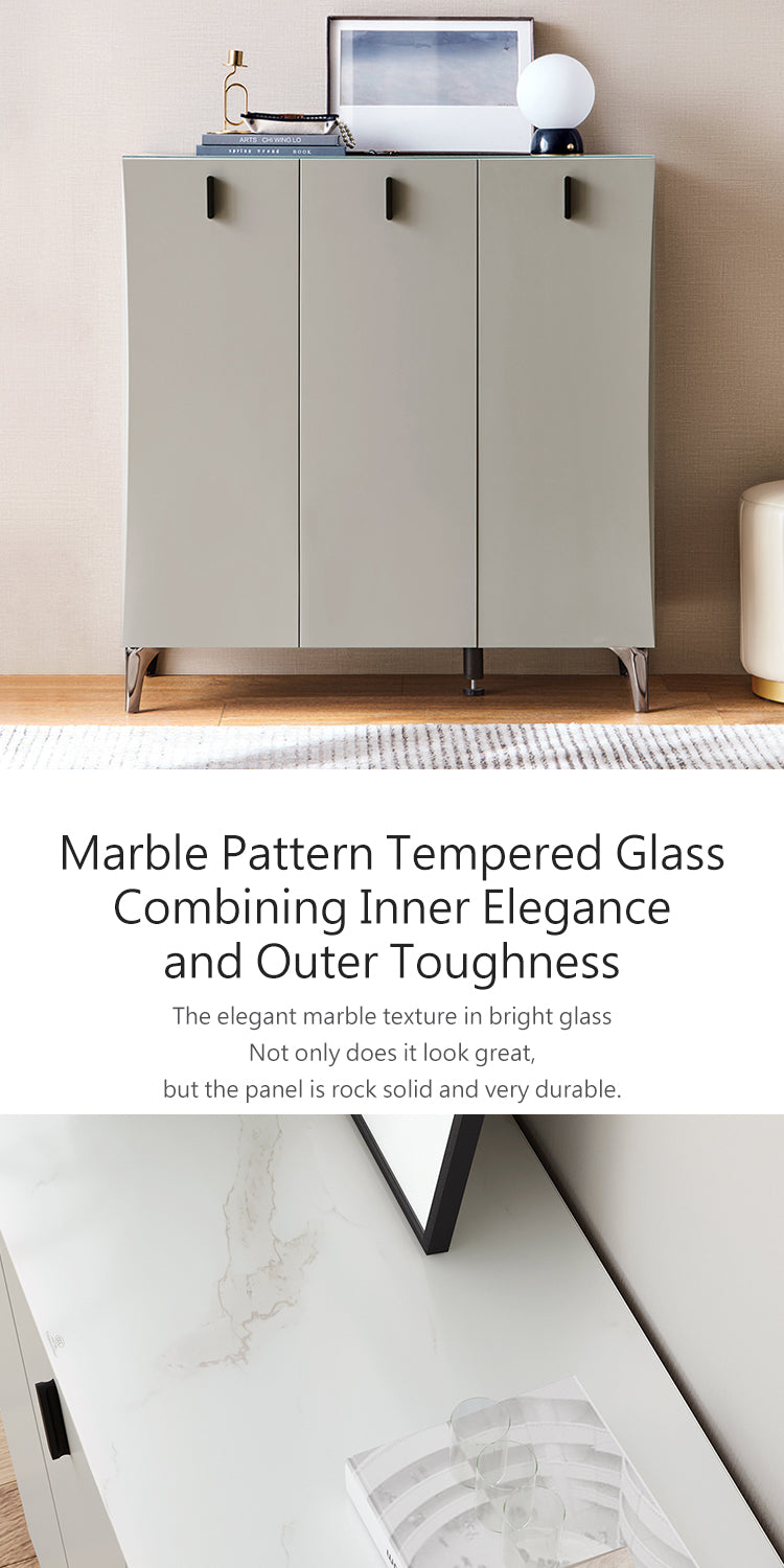 Sleek and multifunctional, this shoe cabinet is an elegant solution to keep your entryway clutter-free. Its contemporary design, with a tempered glass tabletop, allows for a stylish display or handy placement for daily essentials. The contrast between the dark wood compartments and the light exterior adds a modern edge to any decor.