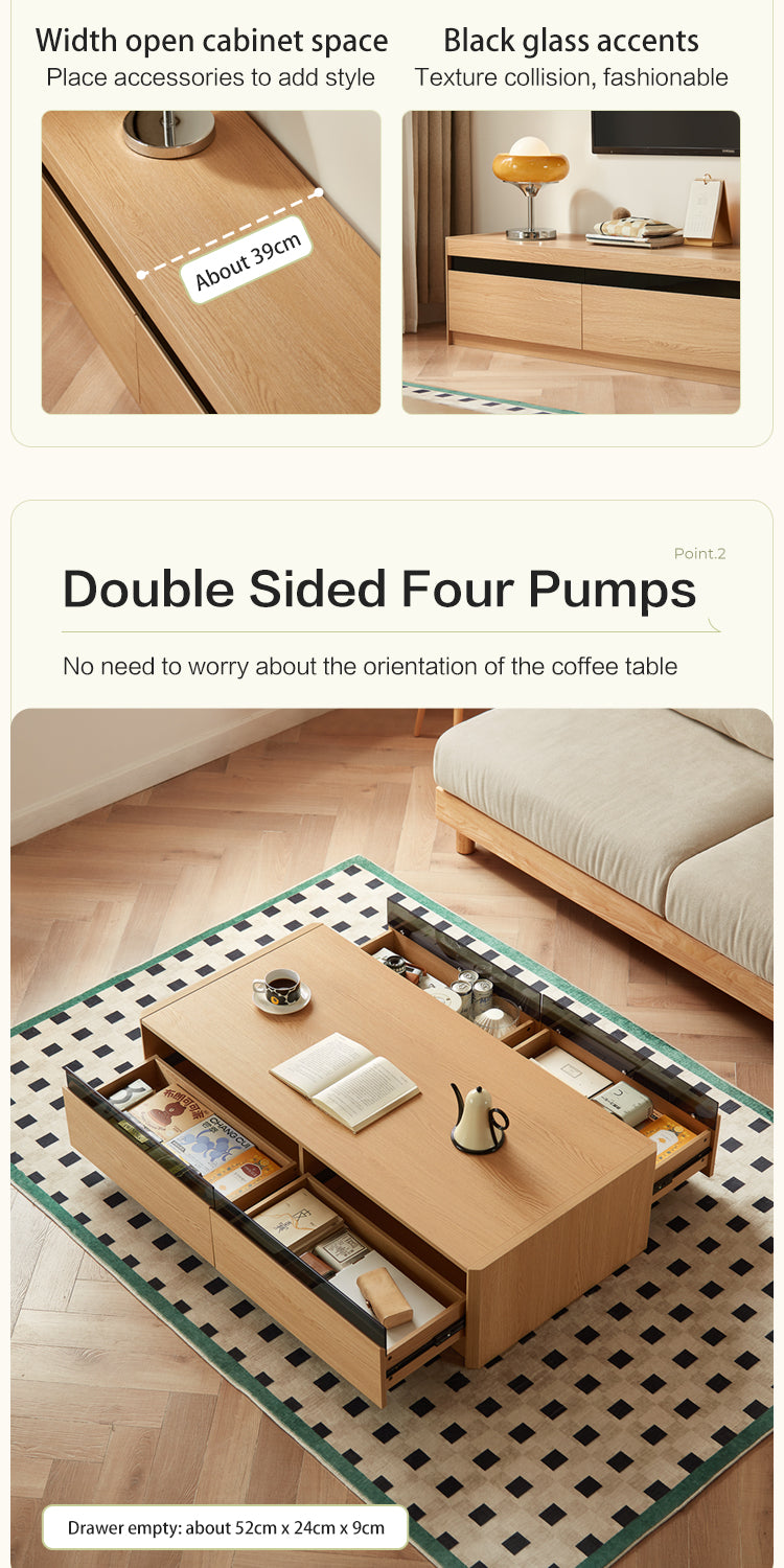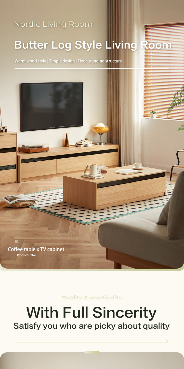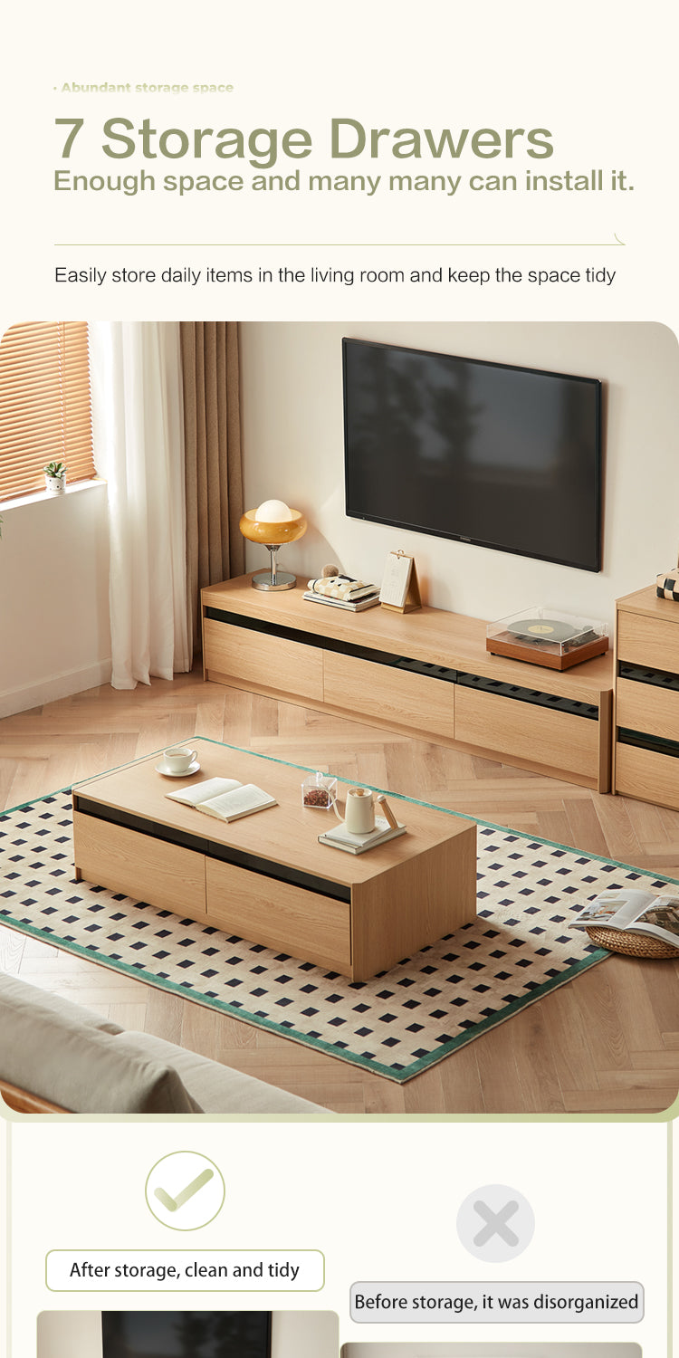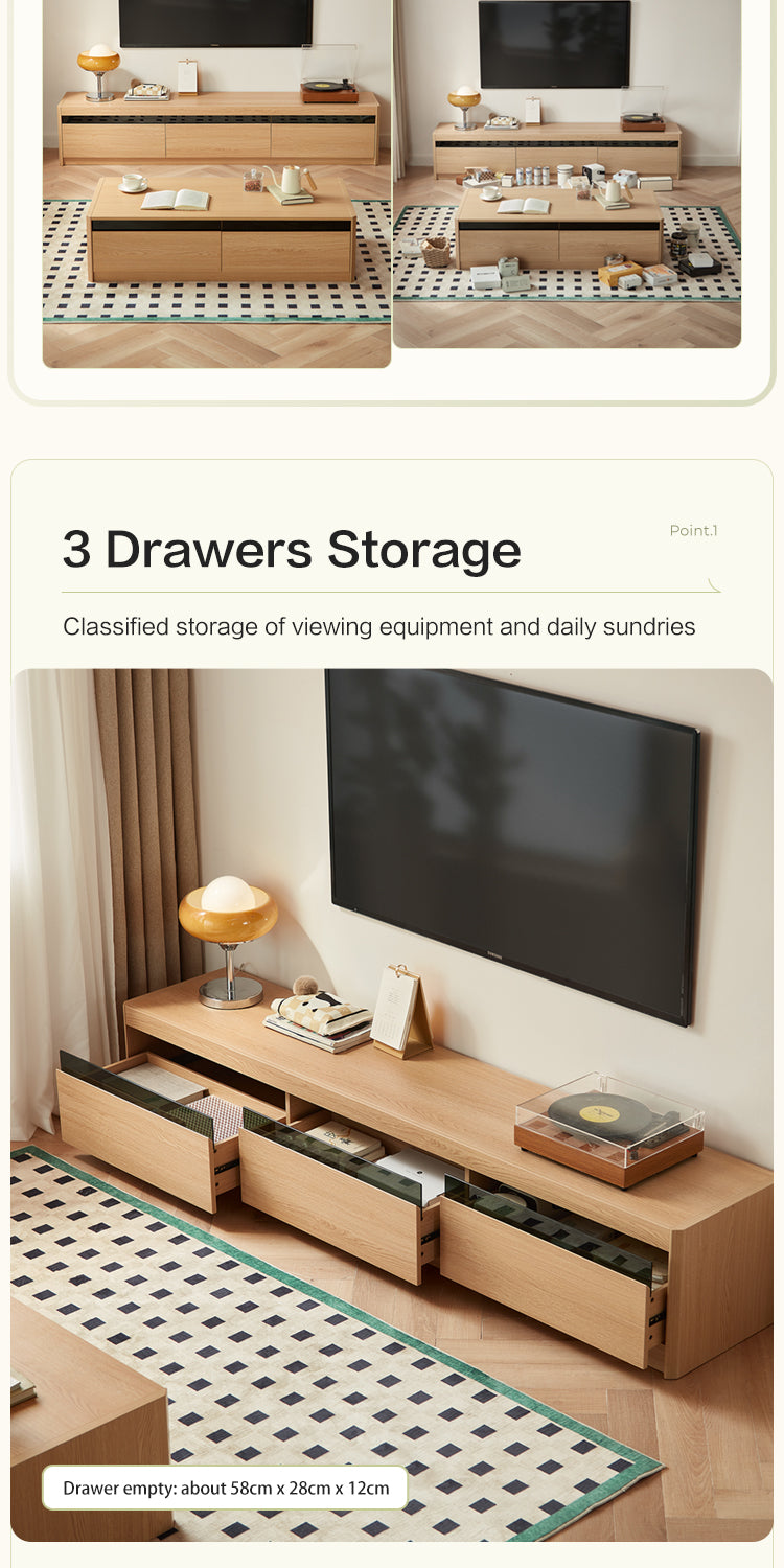 Equipped with spacious drawers and open compartments, this TV stand offers practical organization for your entertainment essentials. The discreet black trim adds a touch of sophistication, making it a versatile centerpiece that complements your living space without overwhelming it. Ideal for creating a clutter-free environment, this TV stand balances aesthetic appeal and practicality.