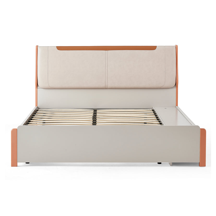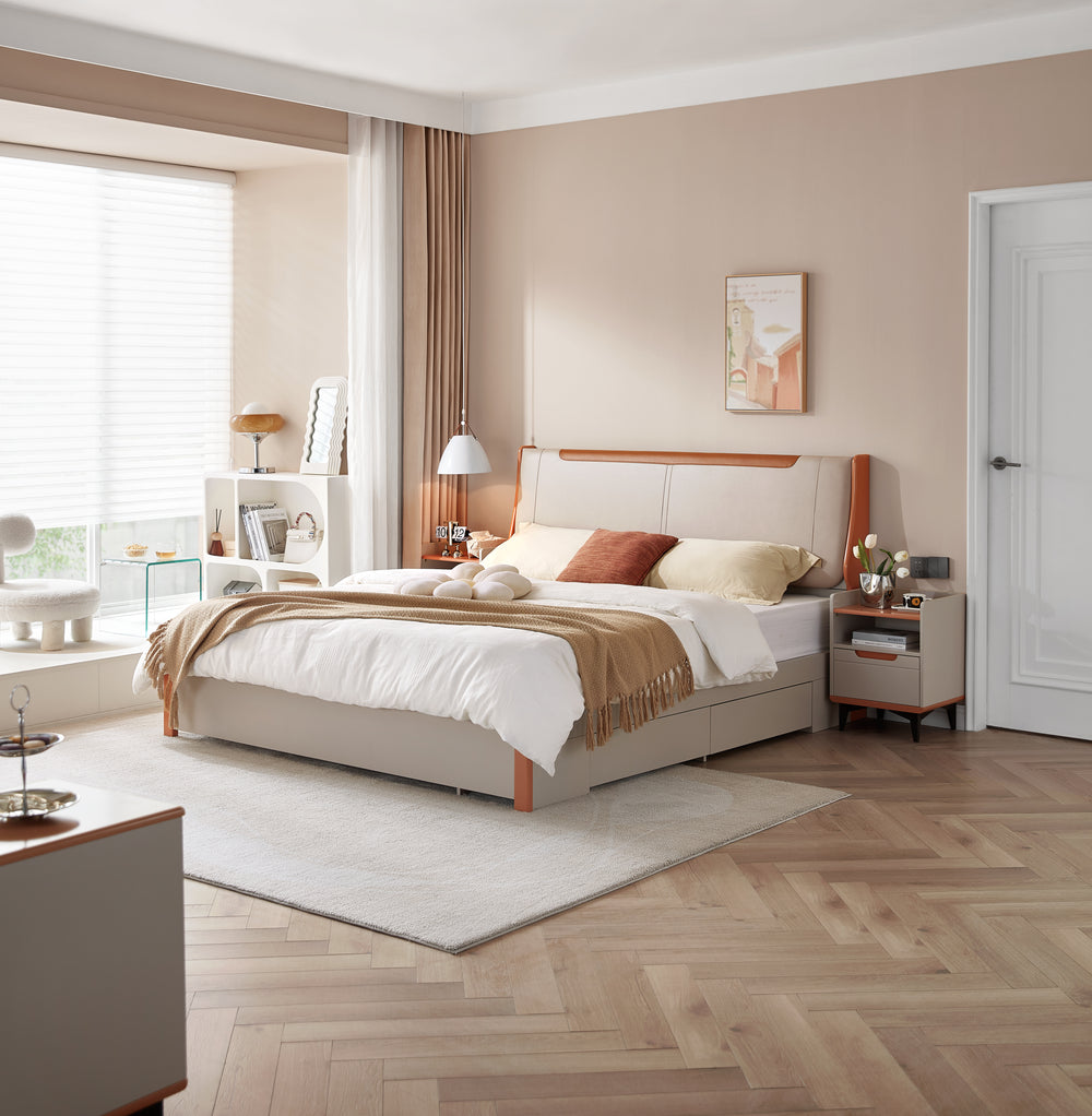 This modern, minimalist bed is designed to maximize space with its built-in storage, making it ideal for small homes or apartments. The sleek frame and clean lines create a stylish centerpiece for any master bedroom. With hidden compartments beneath the mattress, this bed offers convenient storage for bedding and personal items, helping you maintain a clutter-free space.