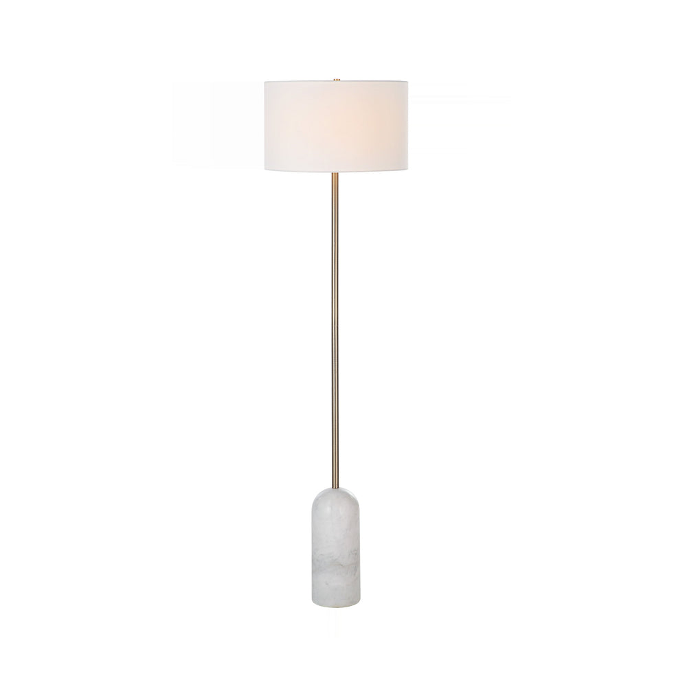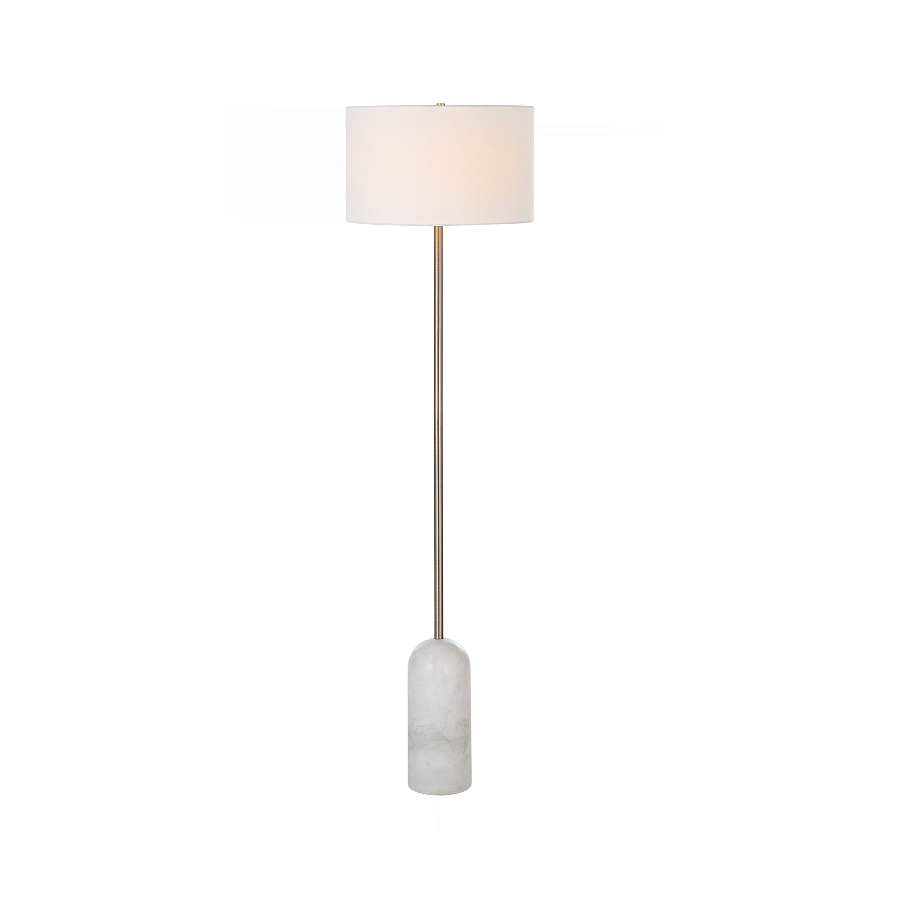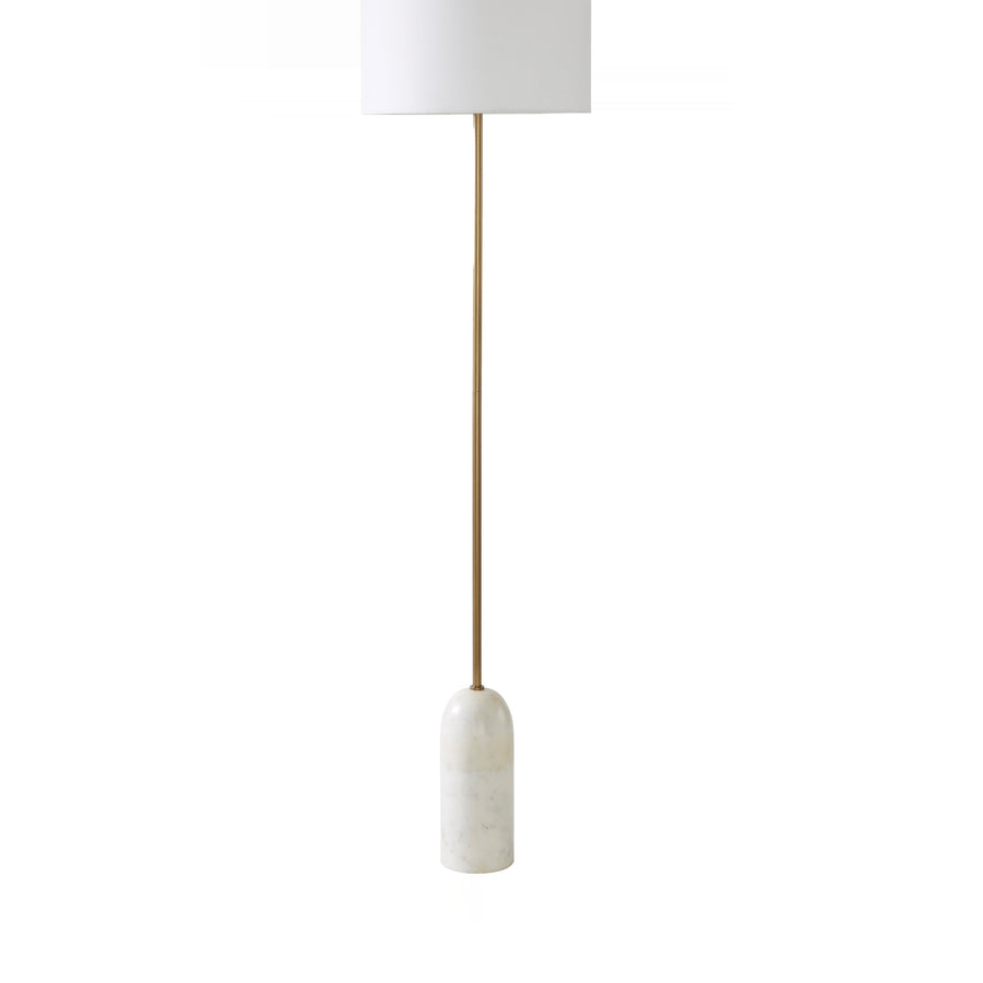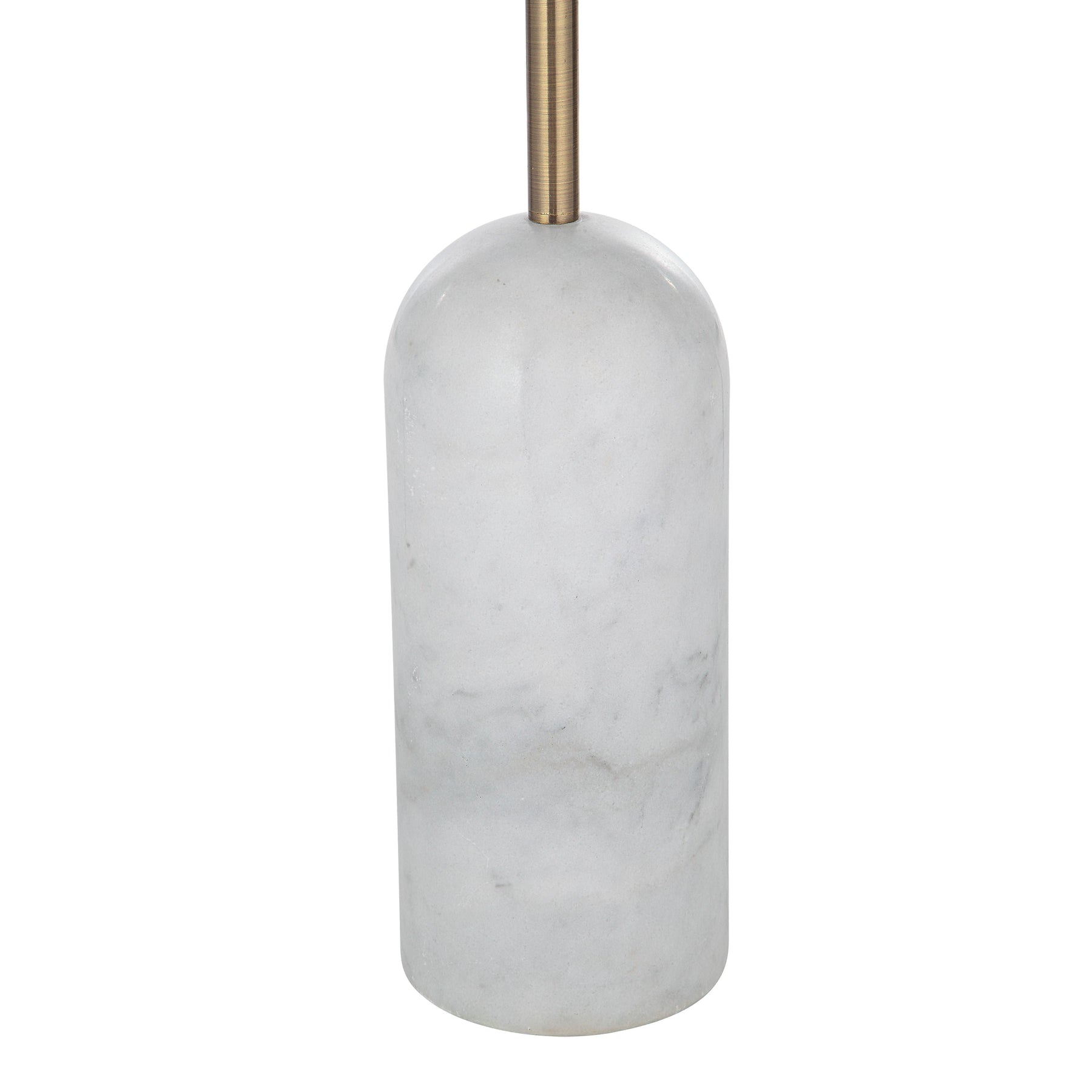 A substantial cylindrical marble base grounds the slender antique brushed brass stem, introducing weighty, natural texture against polished metal refinement. This elevated silhouette commands attention while maintaining a clean, modern profile.