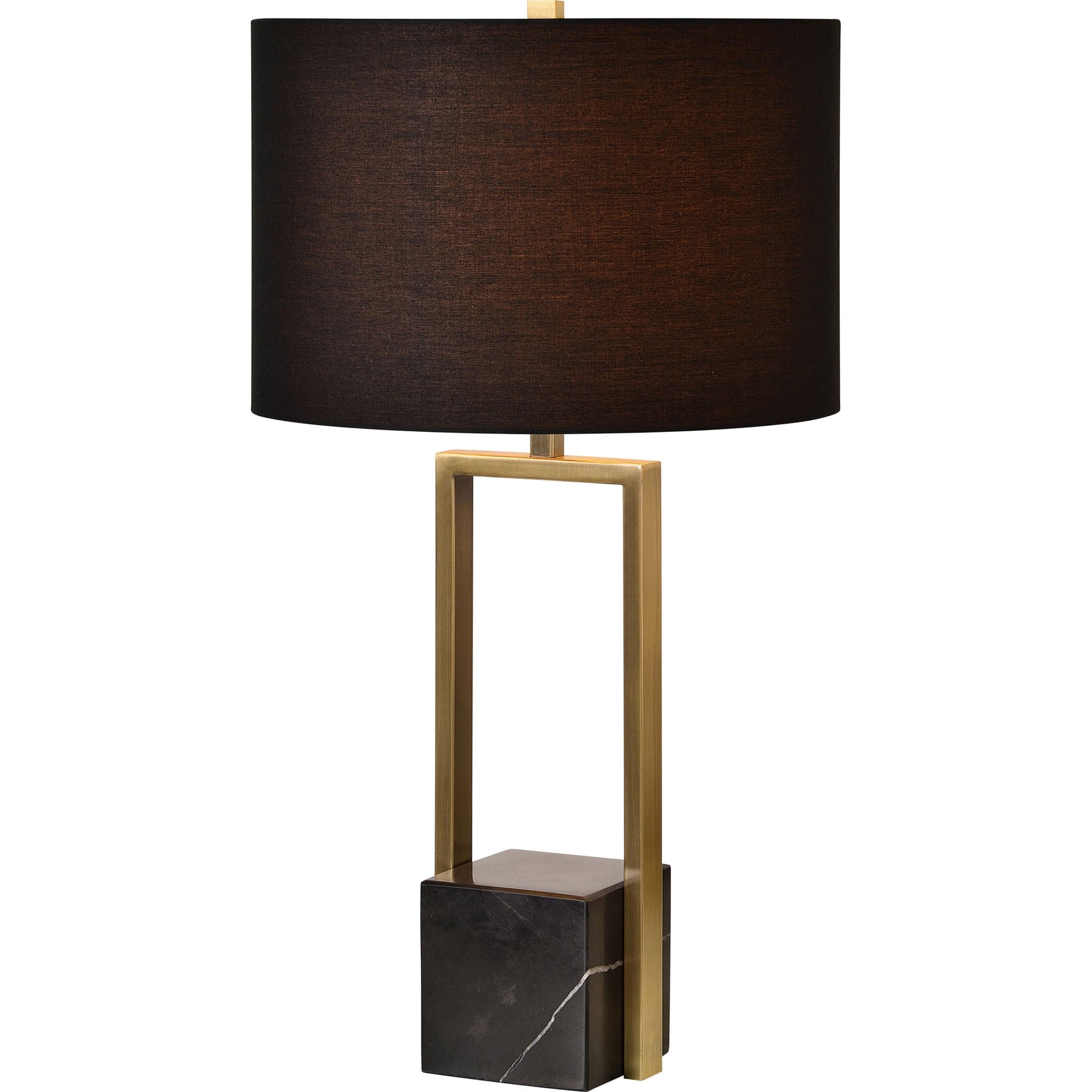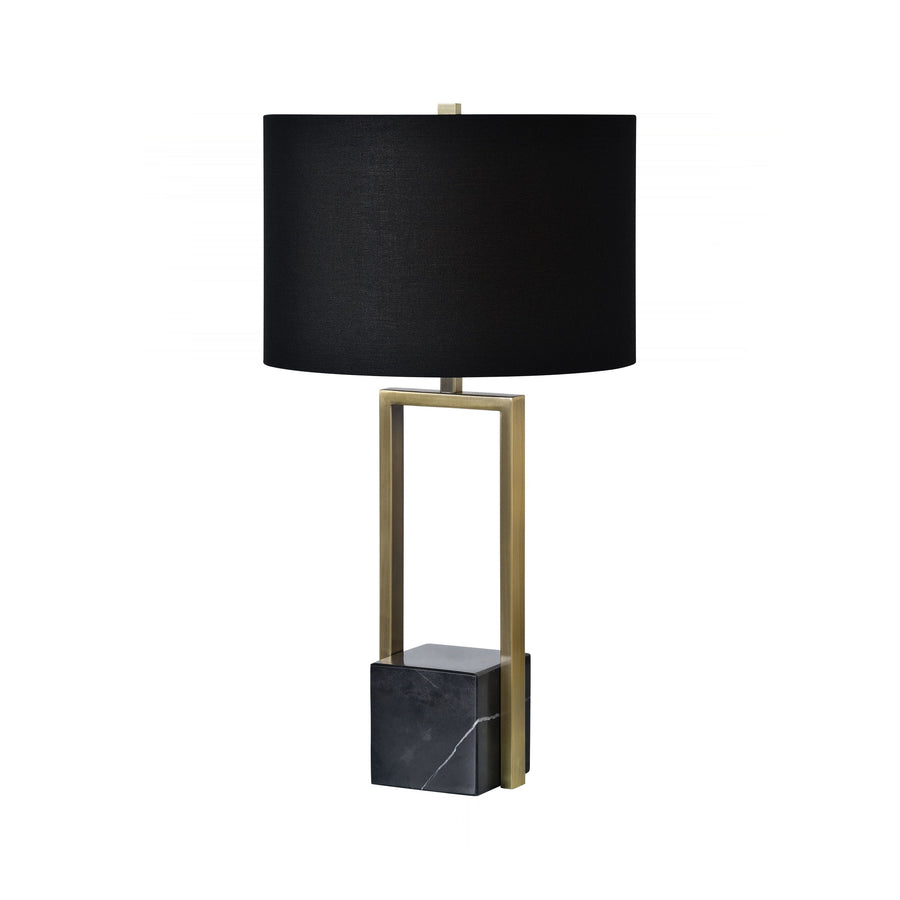 Set beneath a stark black cotton drum shade, the lamp casts a focused, sophisticated glow ideal for curated surfaces. This compelling material contrast elevates any living area with metropolitan drama and tactile luxury.